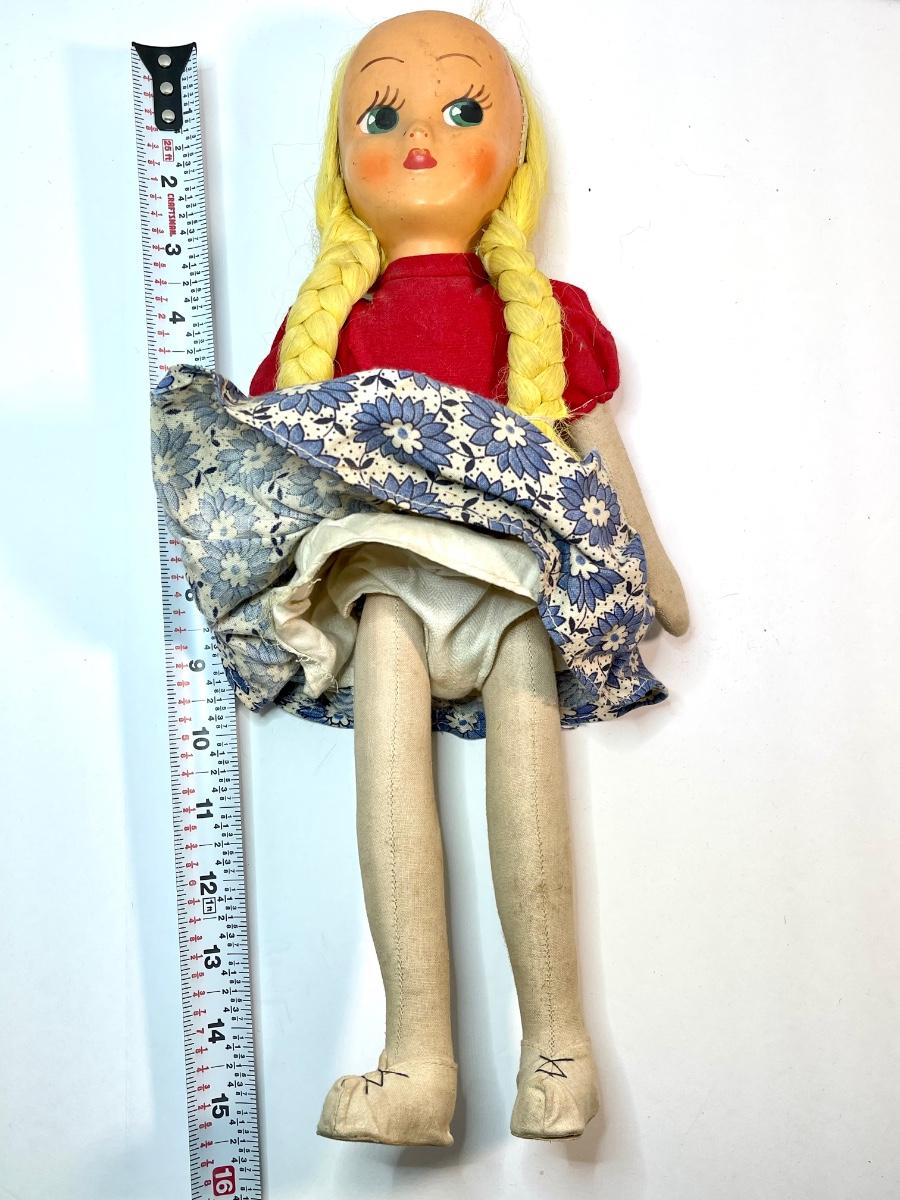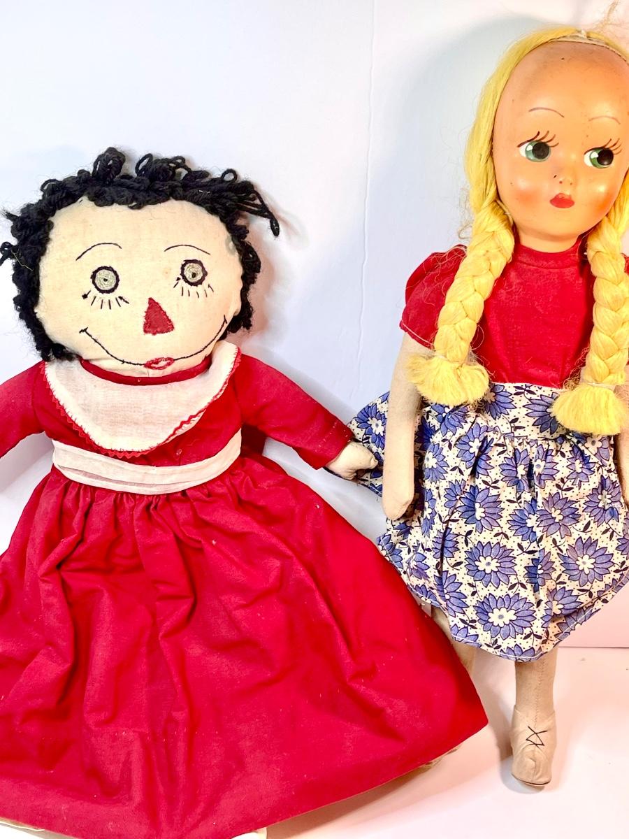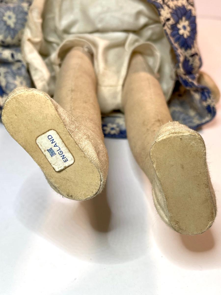 Precious Sutton doll made in England with sticker on bottom of foot. In good condition but clothing shows age and use. Some staining on cloth. Some dirt on face. See pics. The other I believe is a handmade doll. It’s precious and looks old also. The cloth shows age and use. Bet these dolls could tell some stories! Sutton dolls are prized by collectors. Though these two are in vintage condition, both are truly good for the age! Love these two!!