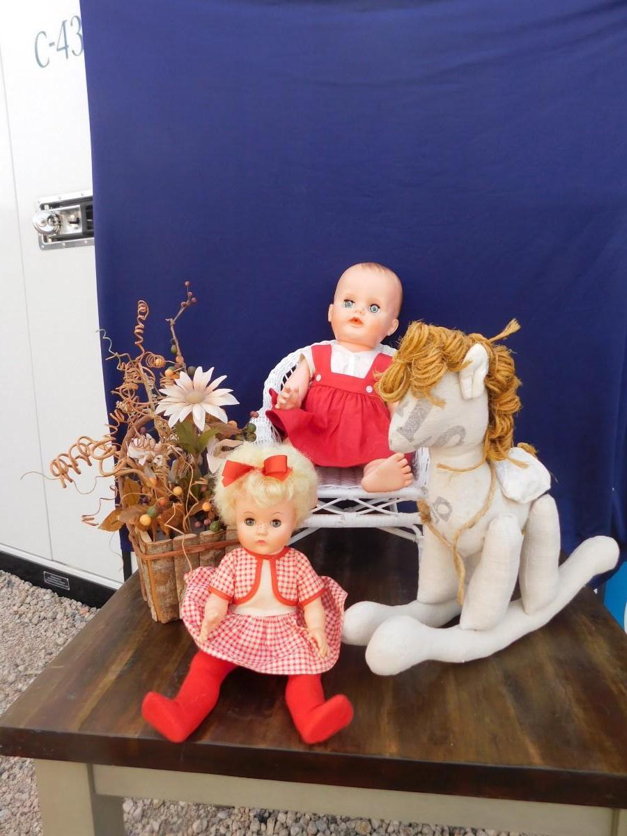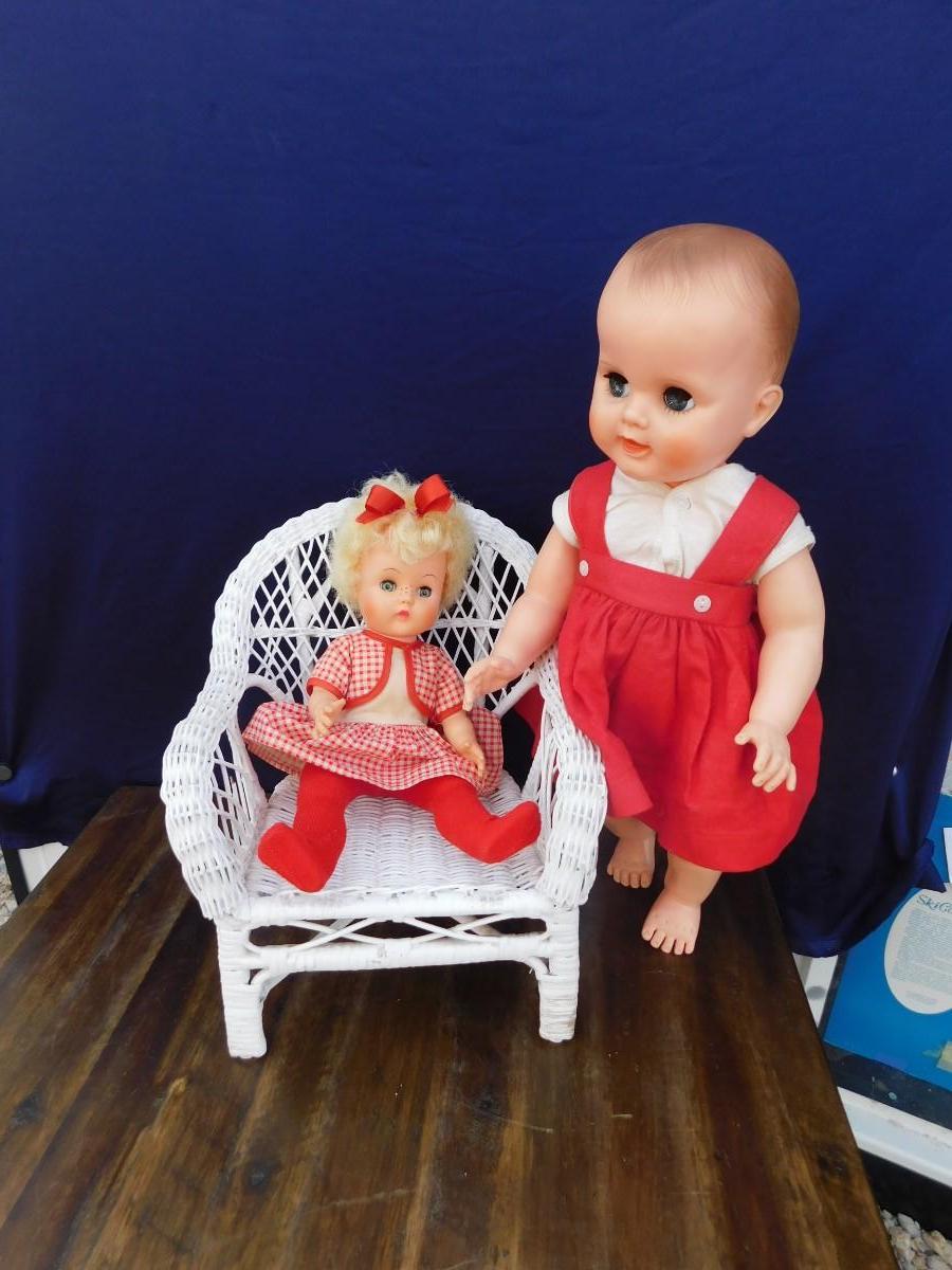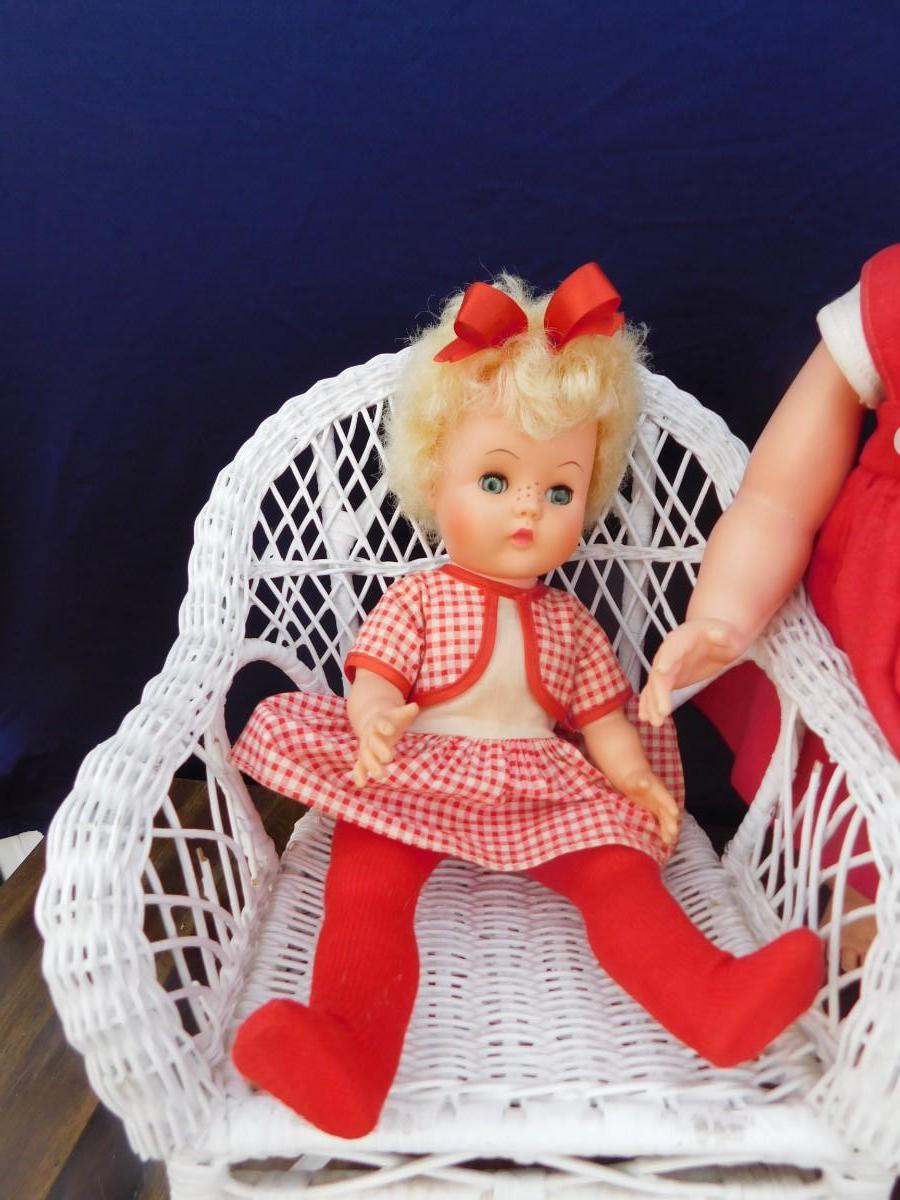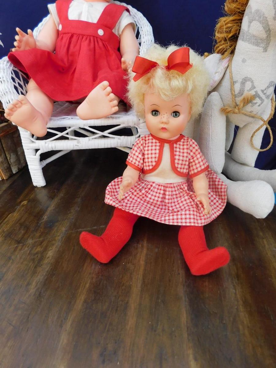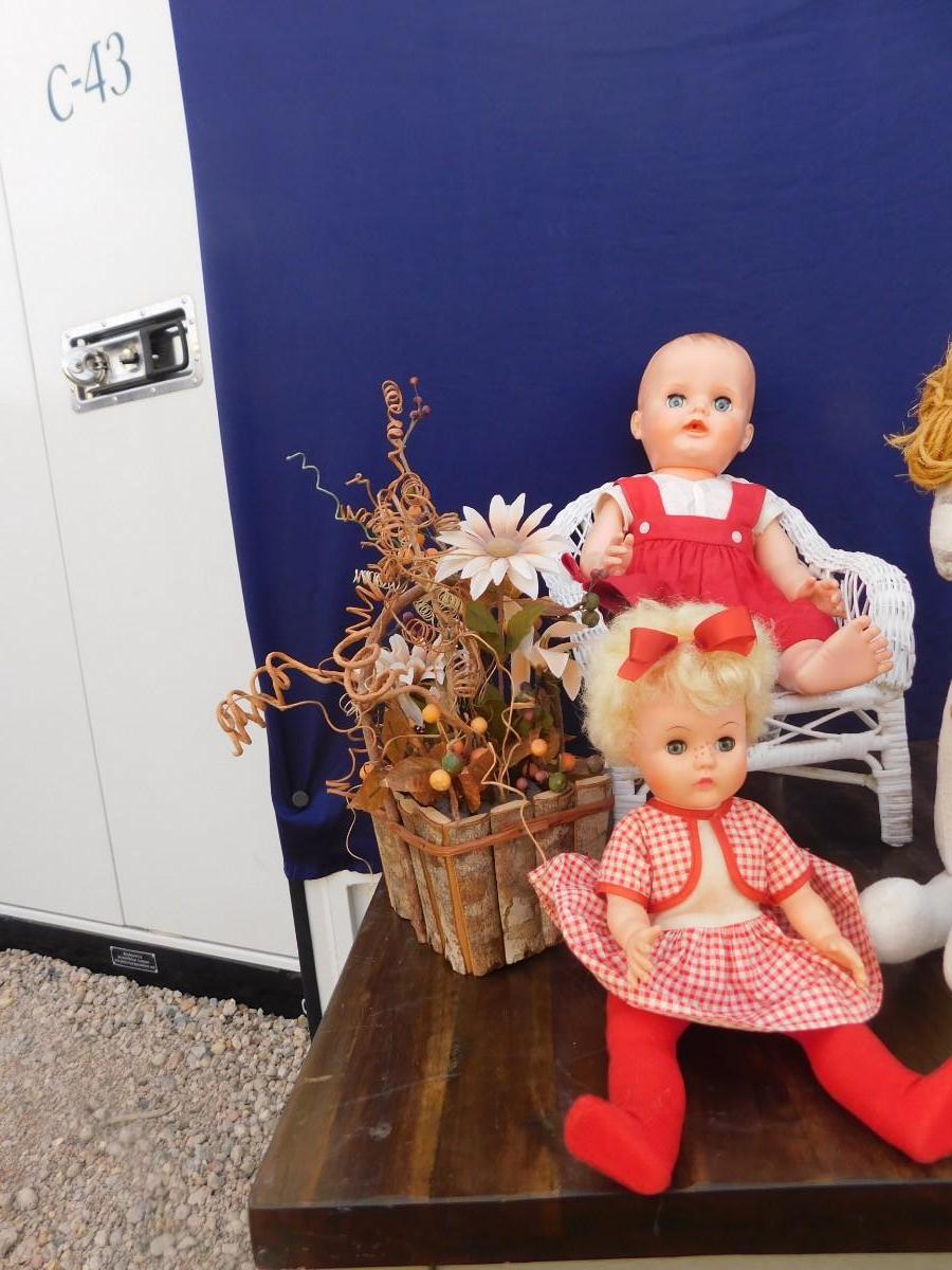 VINTAGE DOLLY'S IN RED AND ACCESSORIZING ITEMS OF DECOR