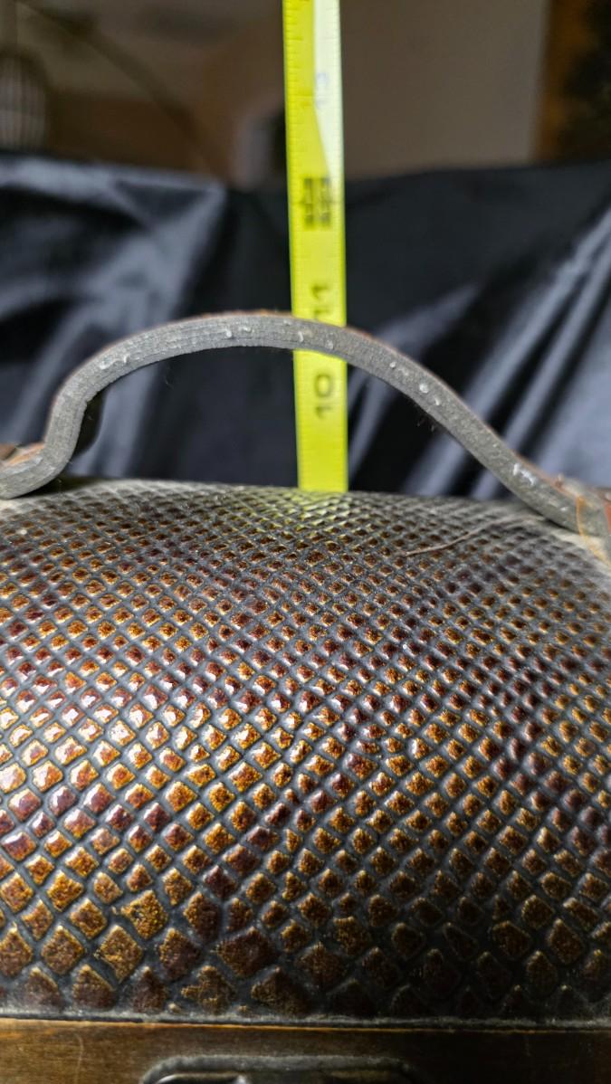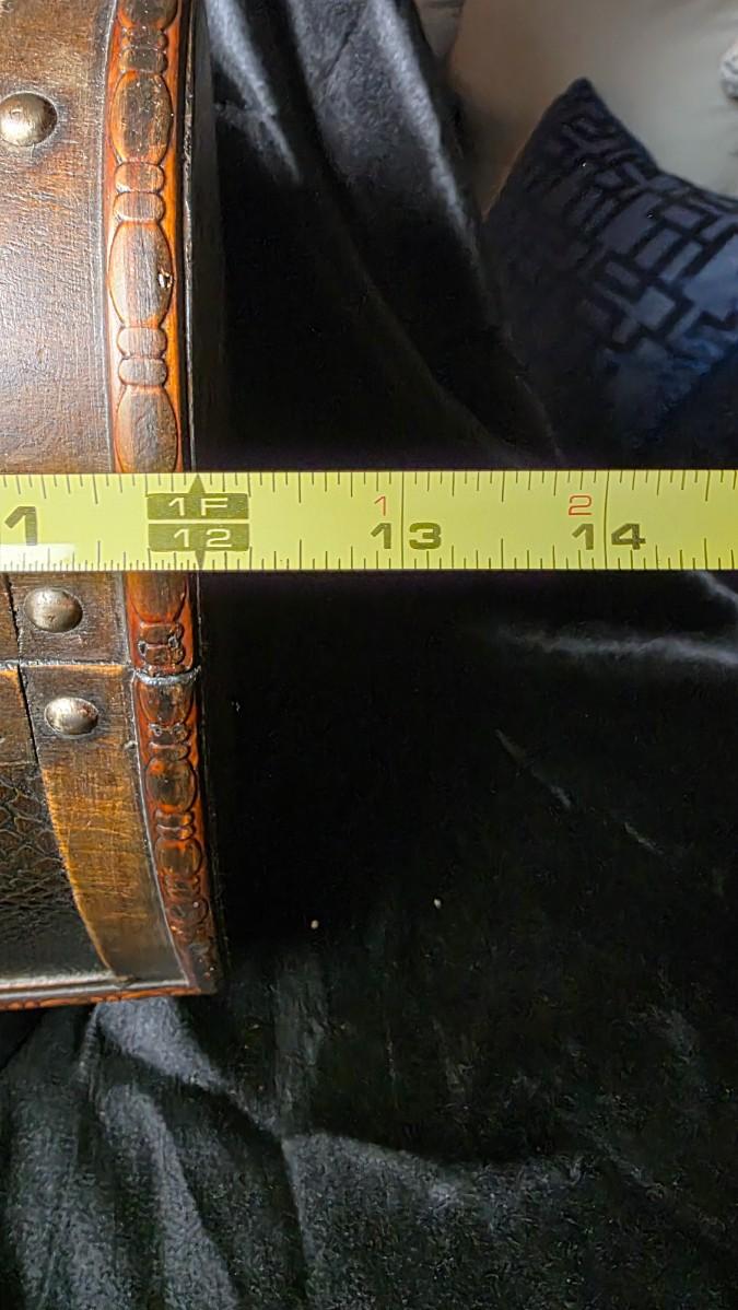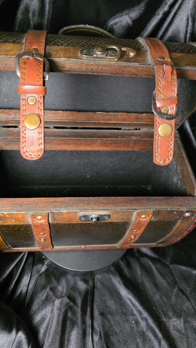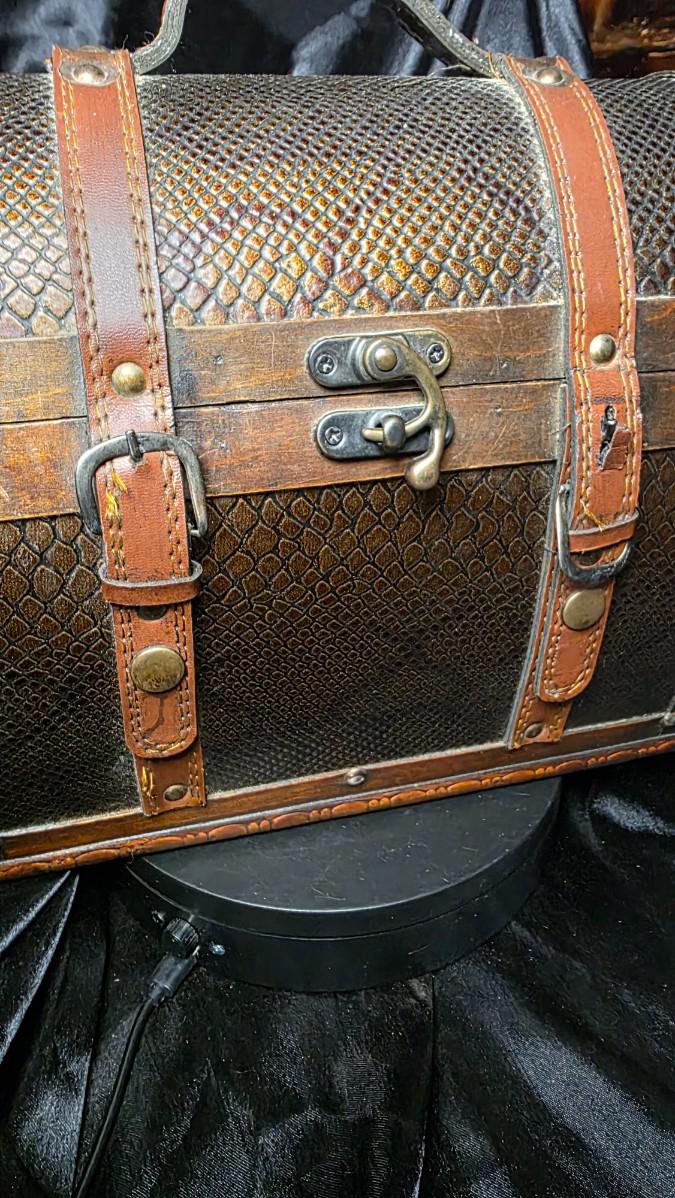 There is a small tear at one hole on the right-side strap, visible in the photos. This is minor and does not affect the structure, latch, or overall usability of the chest, and it remains solid and visually striking in presentation.