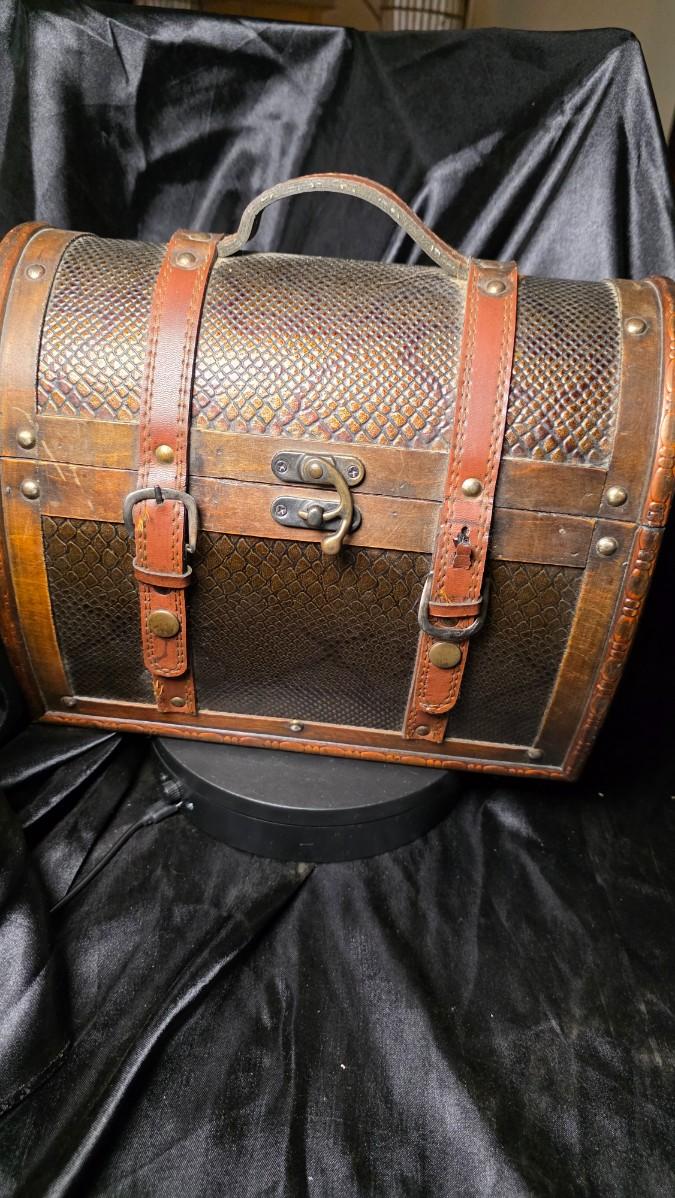 This vintage-style wooden treasure chest captures the classic romance of old-world storage with its domed lid, richly toned wood body, and textured faux leather panels. The exterior detailing is accented by antique-style brass-tone hardware, including a front latch and decorative rivets, giving the piece an authentic treasure-chest presence that feels both nostalgic and timeless.
