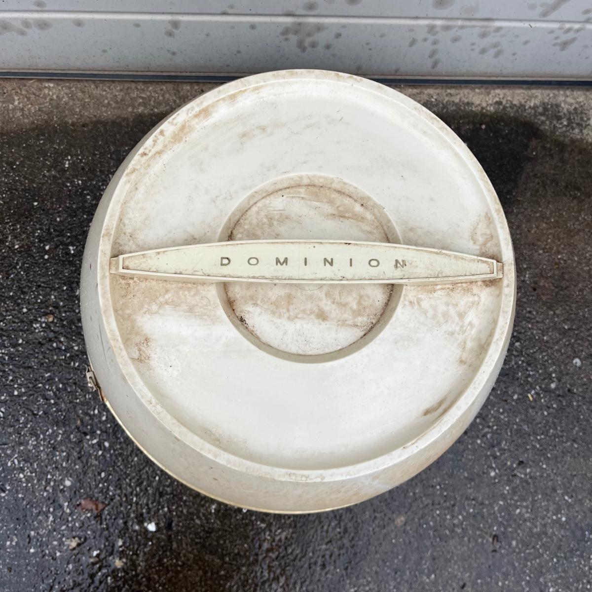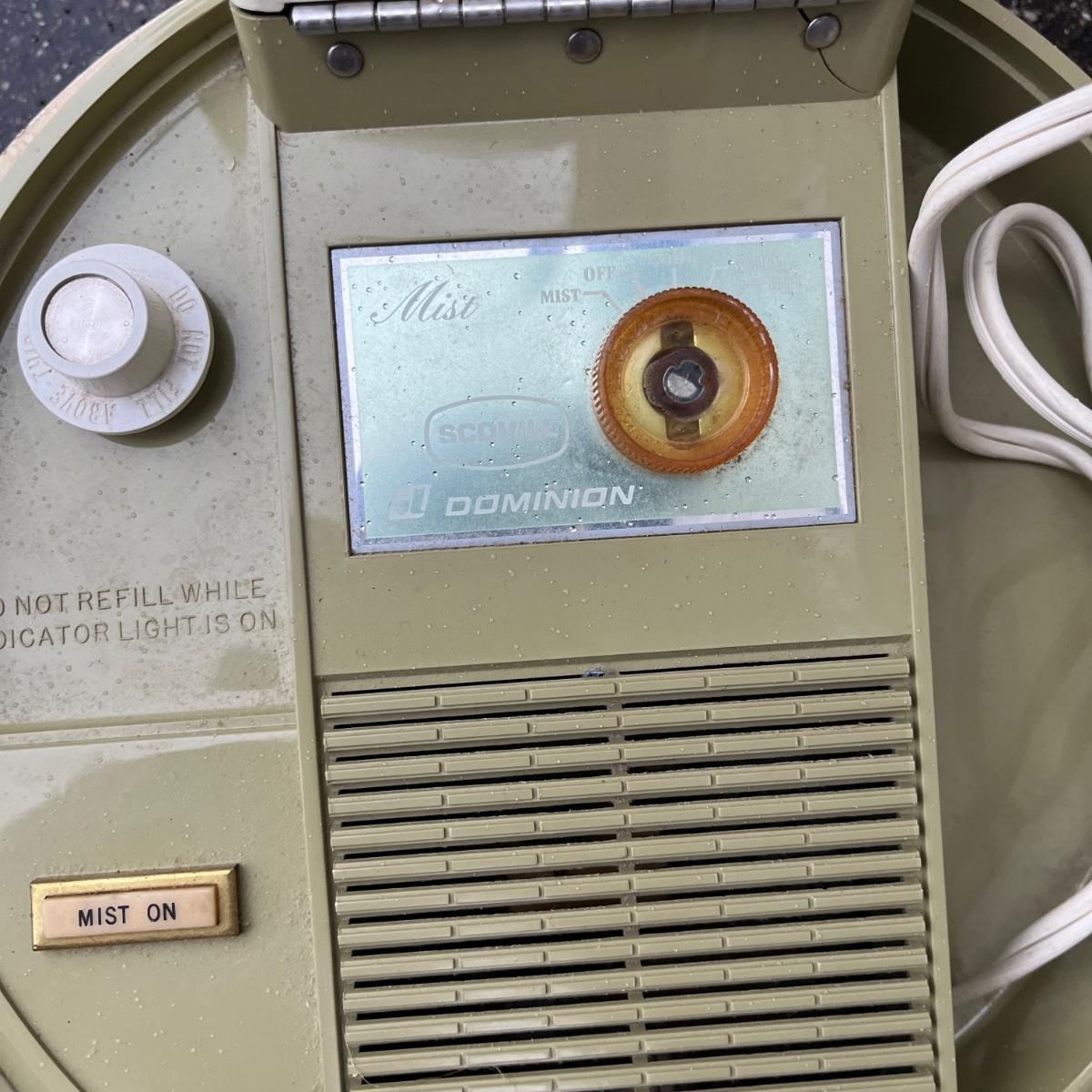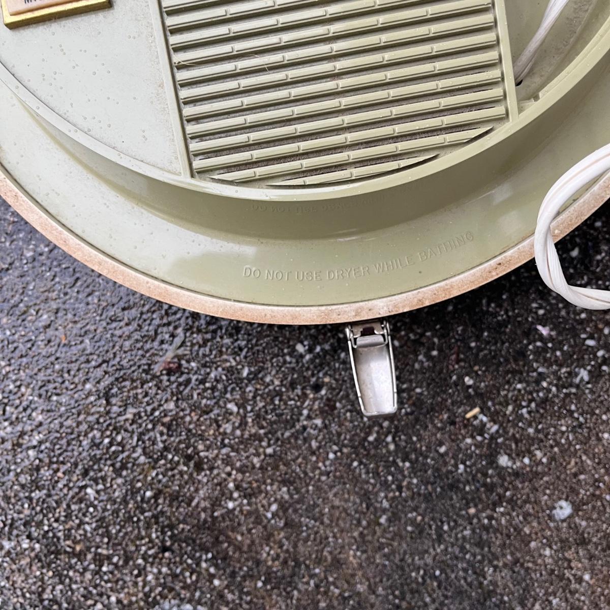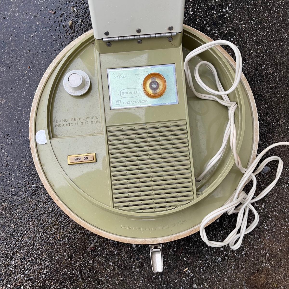 Lot includes a vintage Dominion portable folding hair dryer. Dryer measures 13”D x 13”H when stored. Machine is dirty on the outside and cleans off easily. Machine powered on when plugged in.