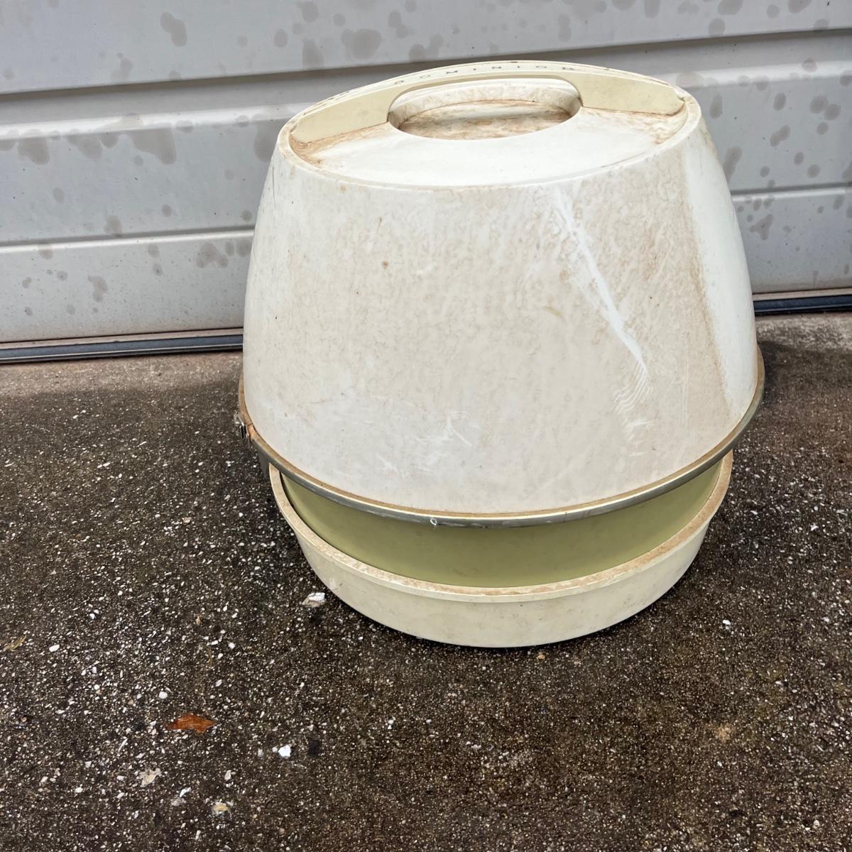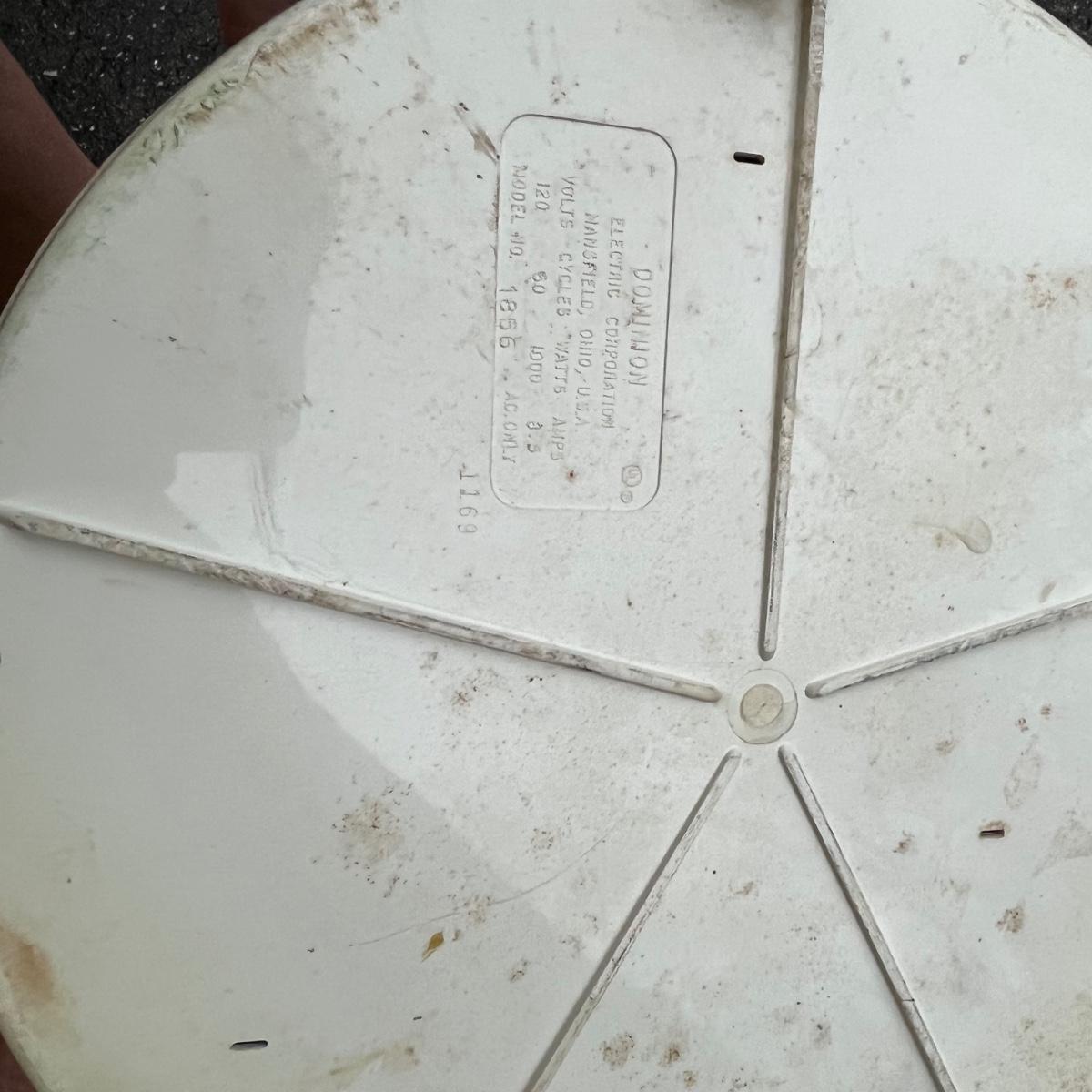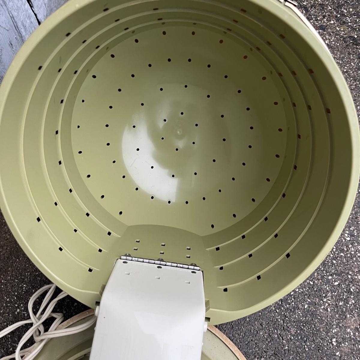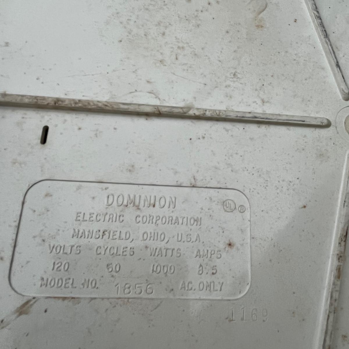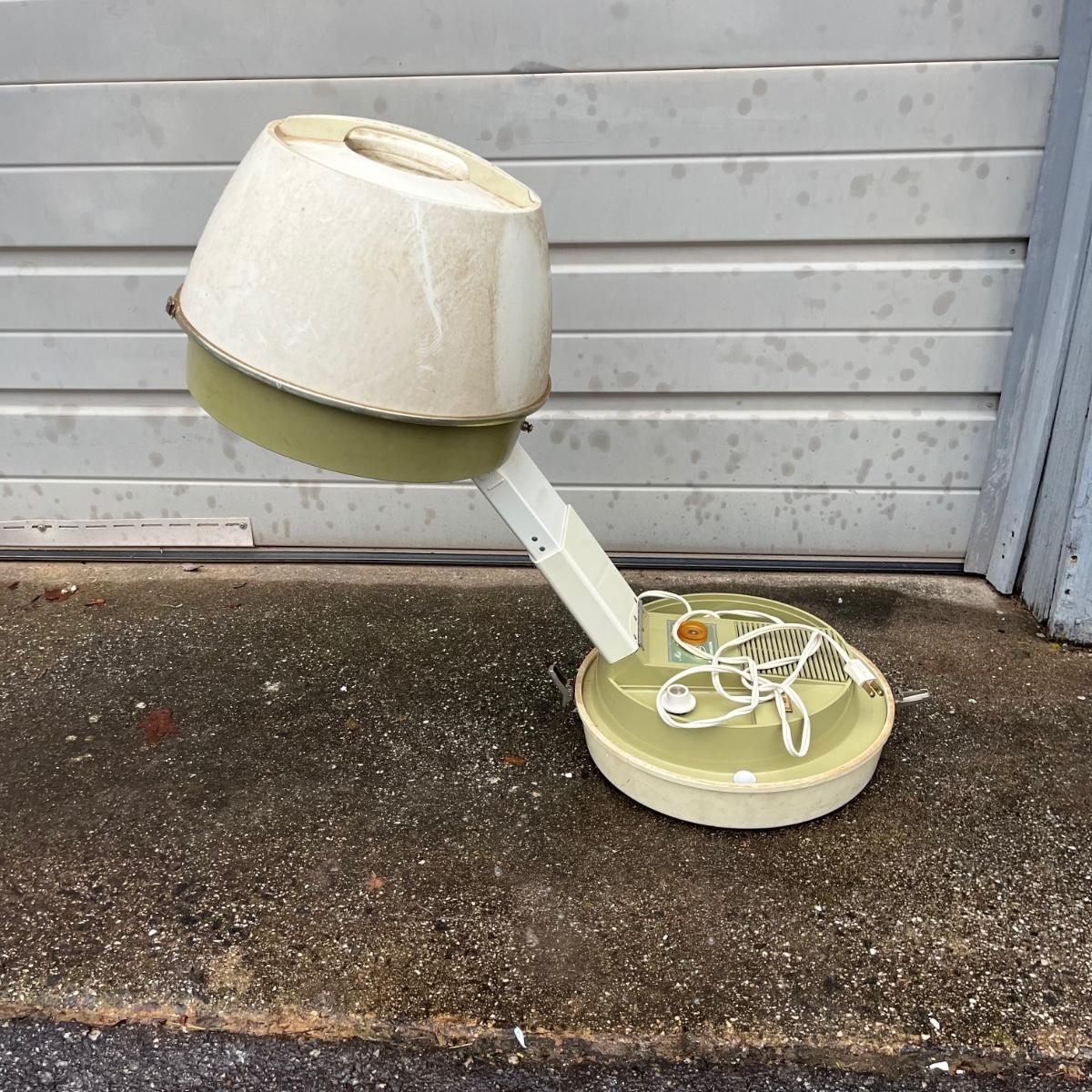 Lot includes a vintage Dominion portable folding hair dryer. Dryer measures 13”D x 13”H when stored. Machine is dirty on the outside and cleans off easily. Machine powered on when plugged in.