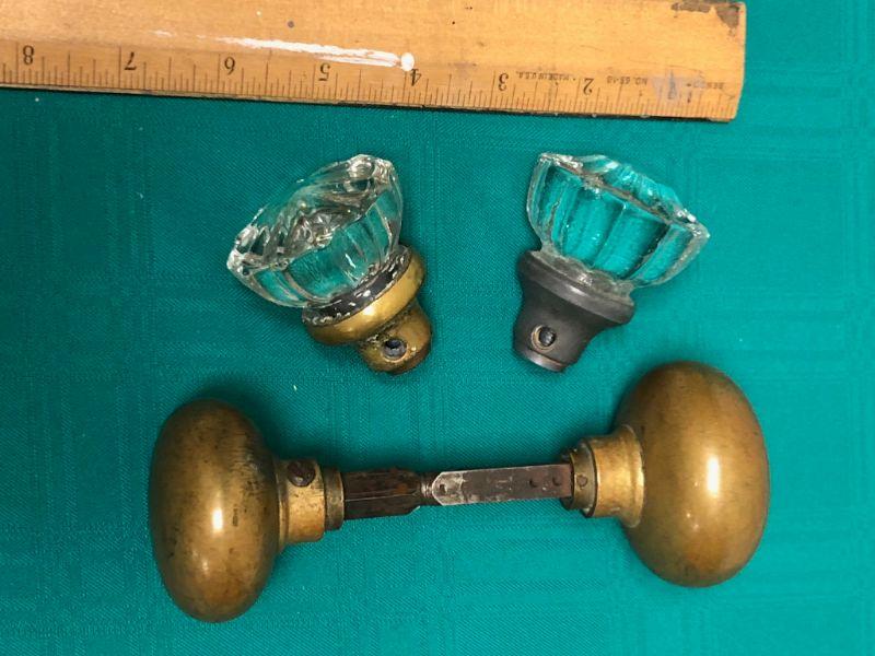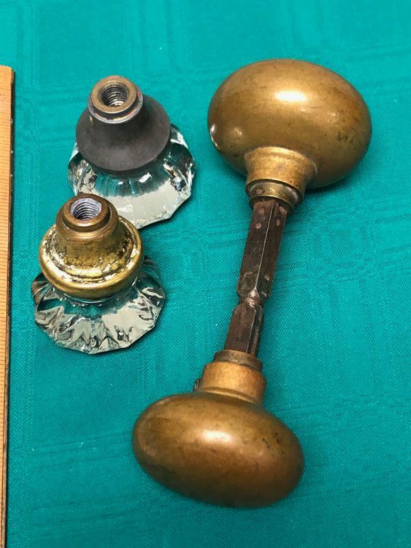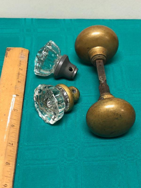 Vintage door knob set. Brass handle door knob and a pair of crystal/glass knobs. Vintage condition.