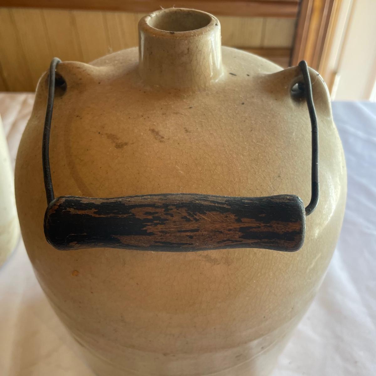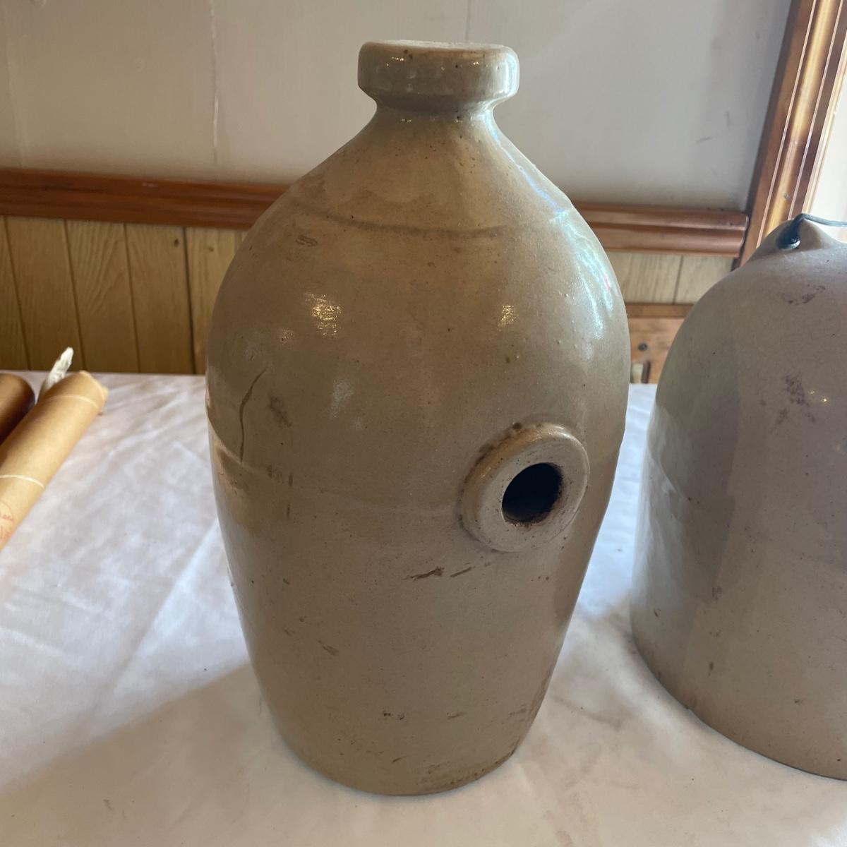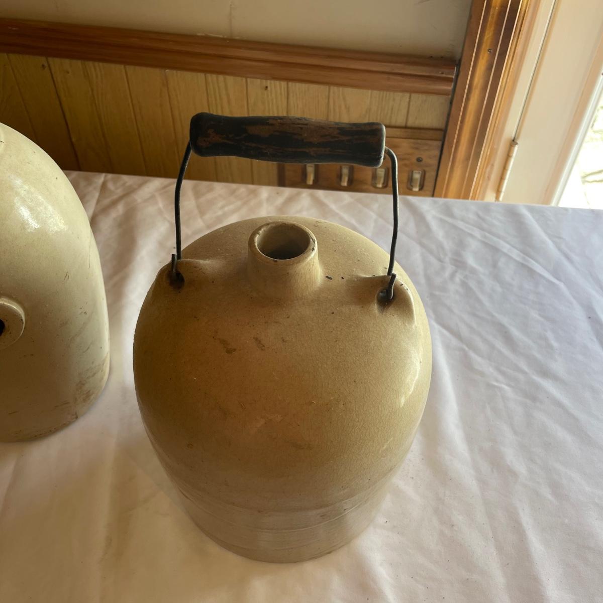 This vintage Dorchester foot warmer has been paired with another stoneware item that is a jug with a wood on metal handle that has no makers mark. It measures 7” d x 10” tall. Both items are in great condition.
