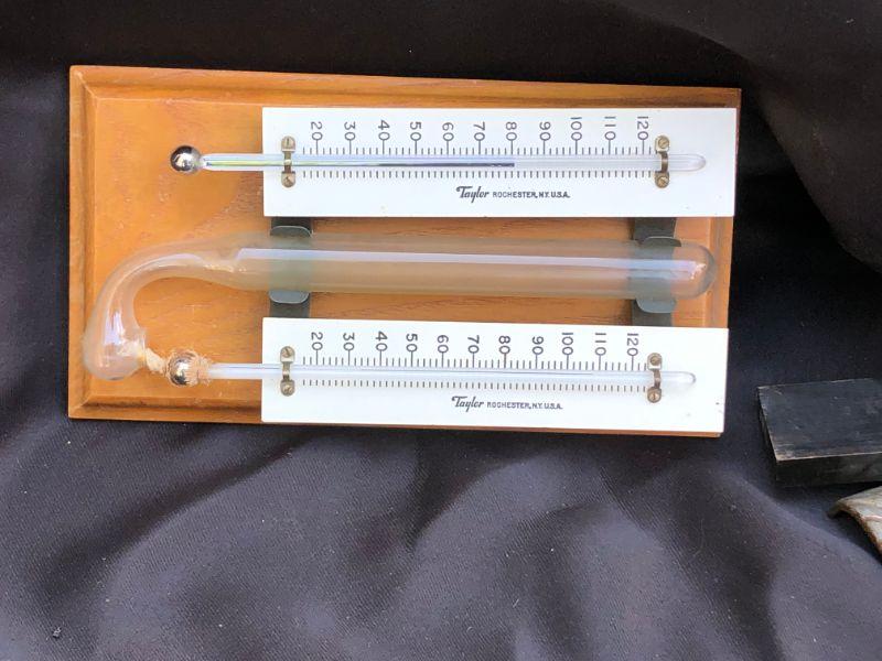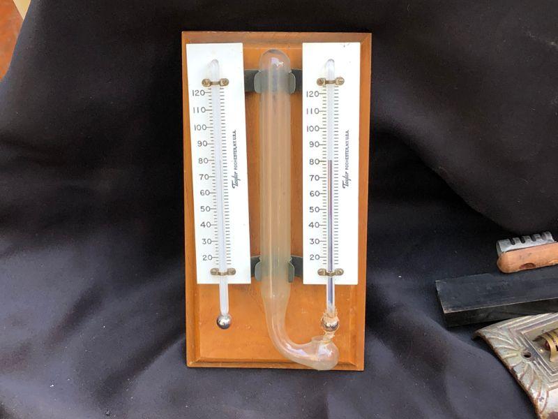 Vintage Glass Double Taylor Humidiguide Thermometer. Made in Rochester NY and Mounted on Oak Wood. 8.5"