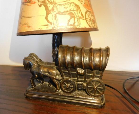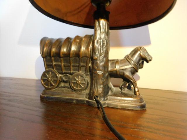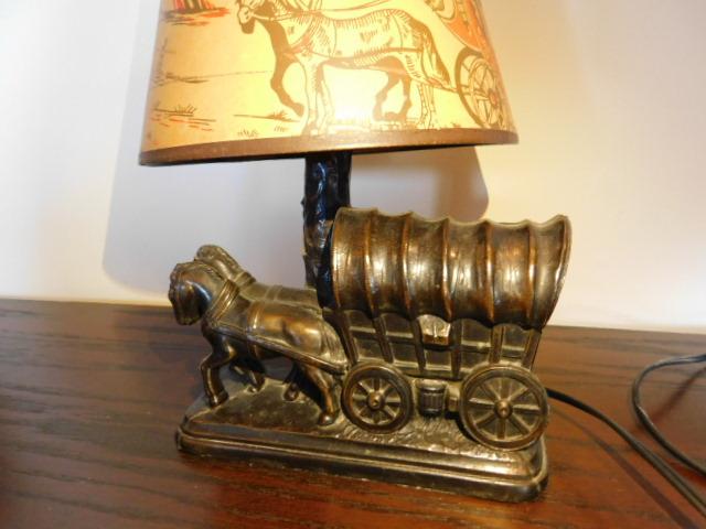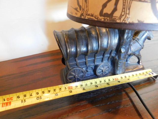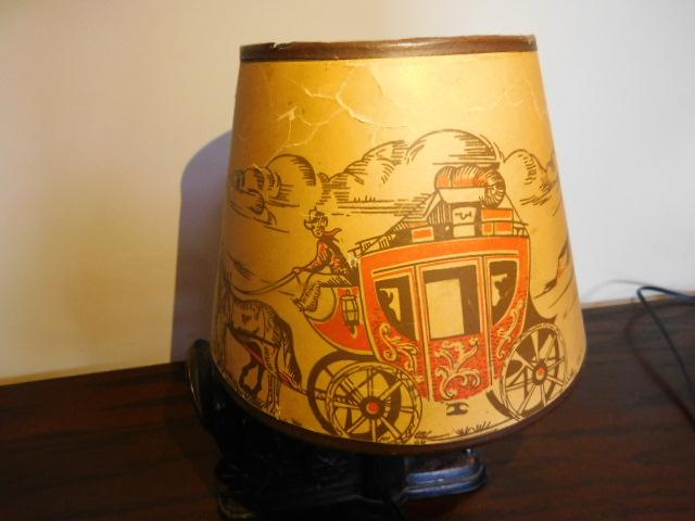 Vintage Double Horse Team Stagecoach Ceramic Lamp and Shade 8"x12" shade has some age cracking but no tears or holes. Nice desk top item.
