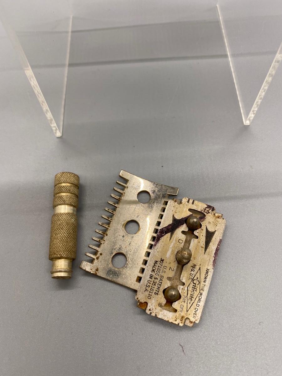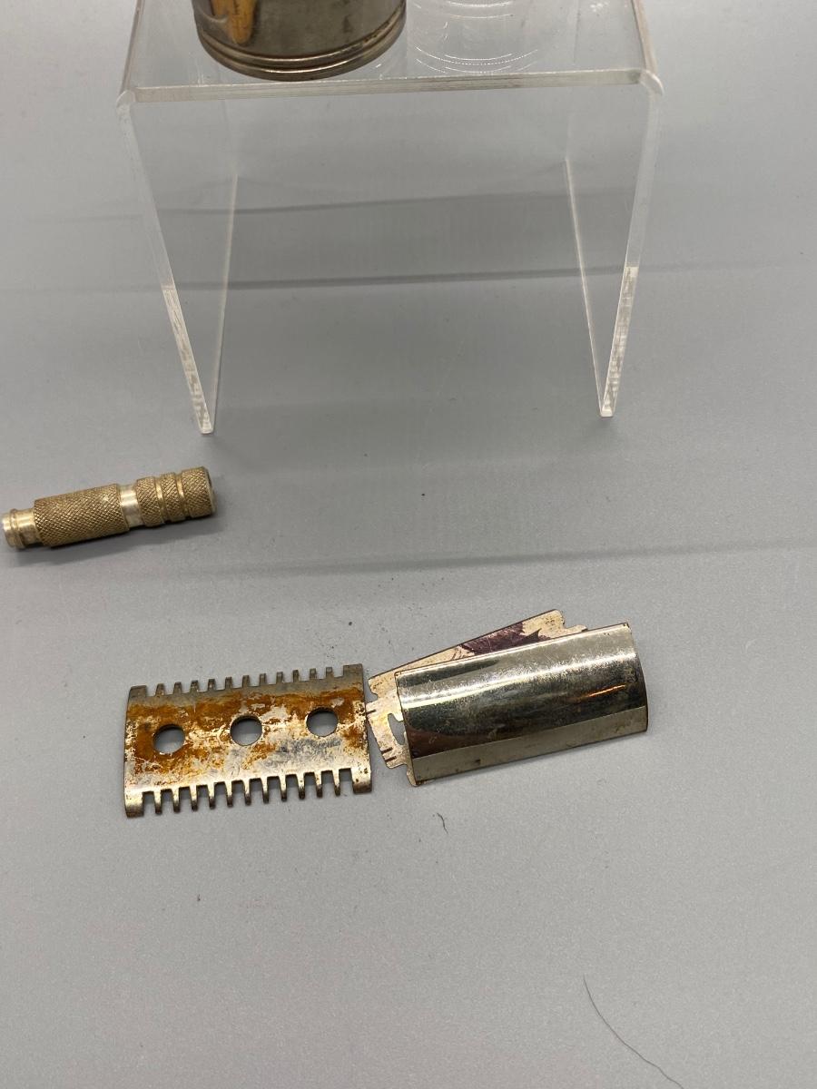 Vintage shaving stick tin with a partial razor. Double sided stick tin in vintage condition. Looks clean enough to use. Includes a vintage metal razor. Razor is missing a piece or two from the screw together handle. 4" length.