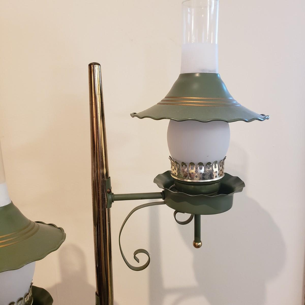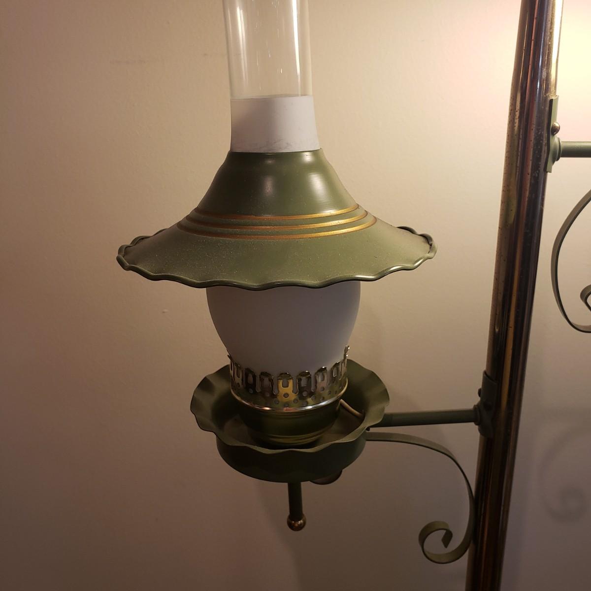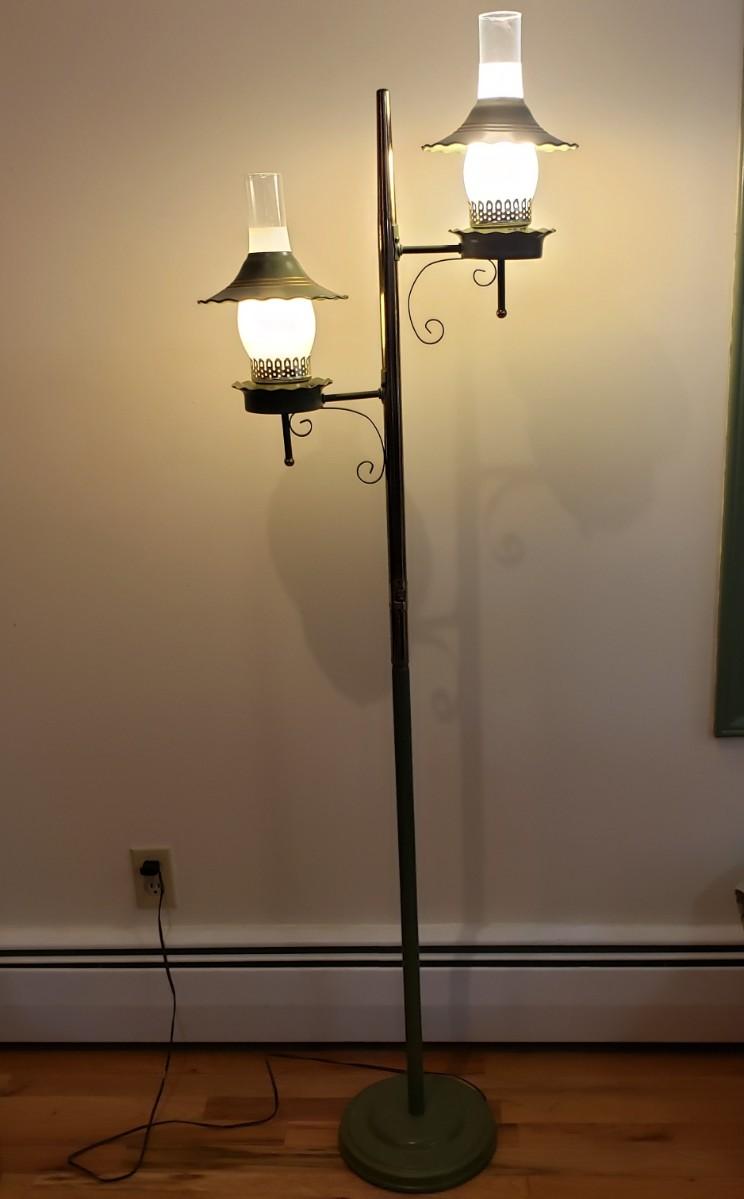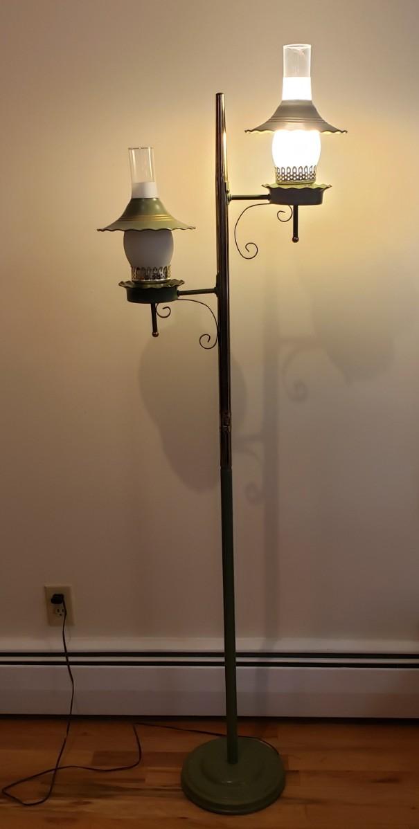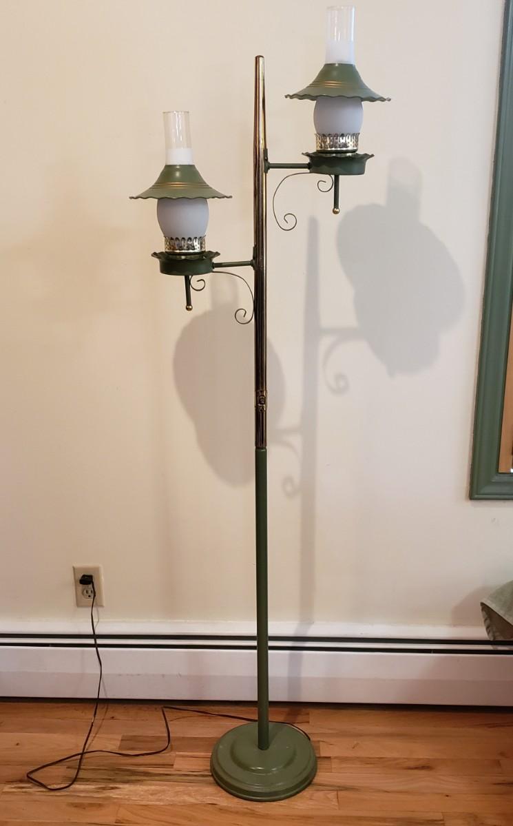 This vintage double floor lamp has two lamps that can have both or one on at a time. The metal shades have a brass and green coloring to them. The lamp stands approximately 64" tall. One glass piece is a little wiggly in its slot. The lamp powered on when plugged in.