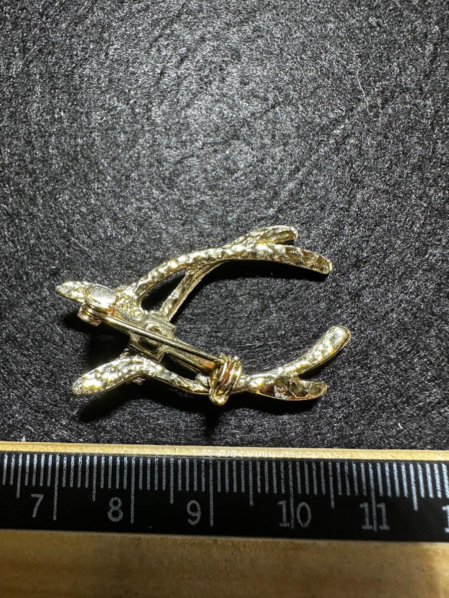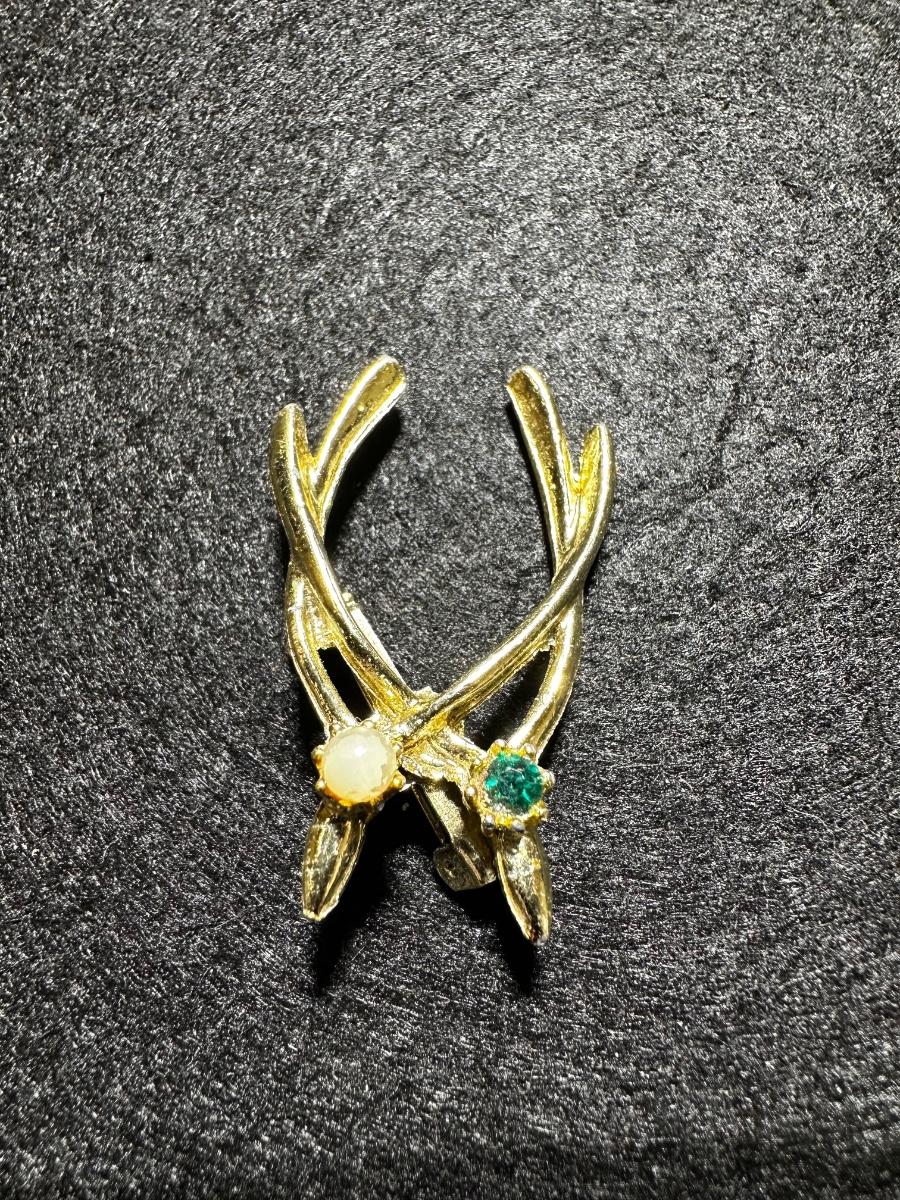 Vintage double wishbone faux pearl and green rhinestone brooch