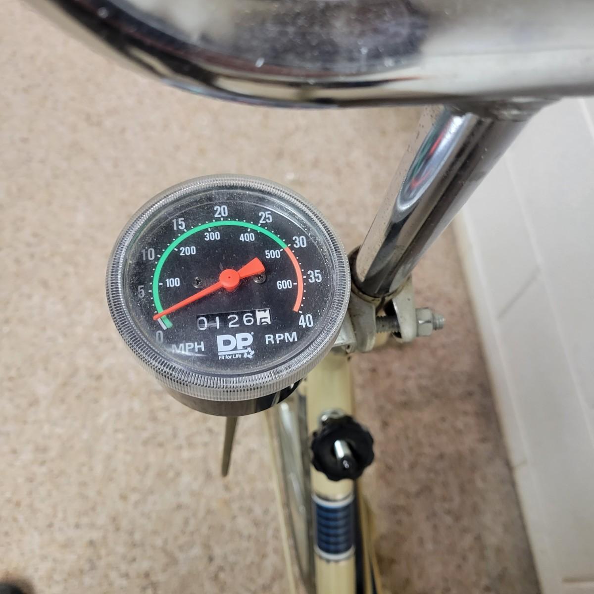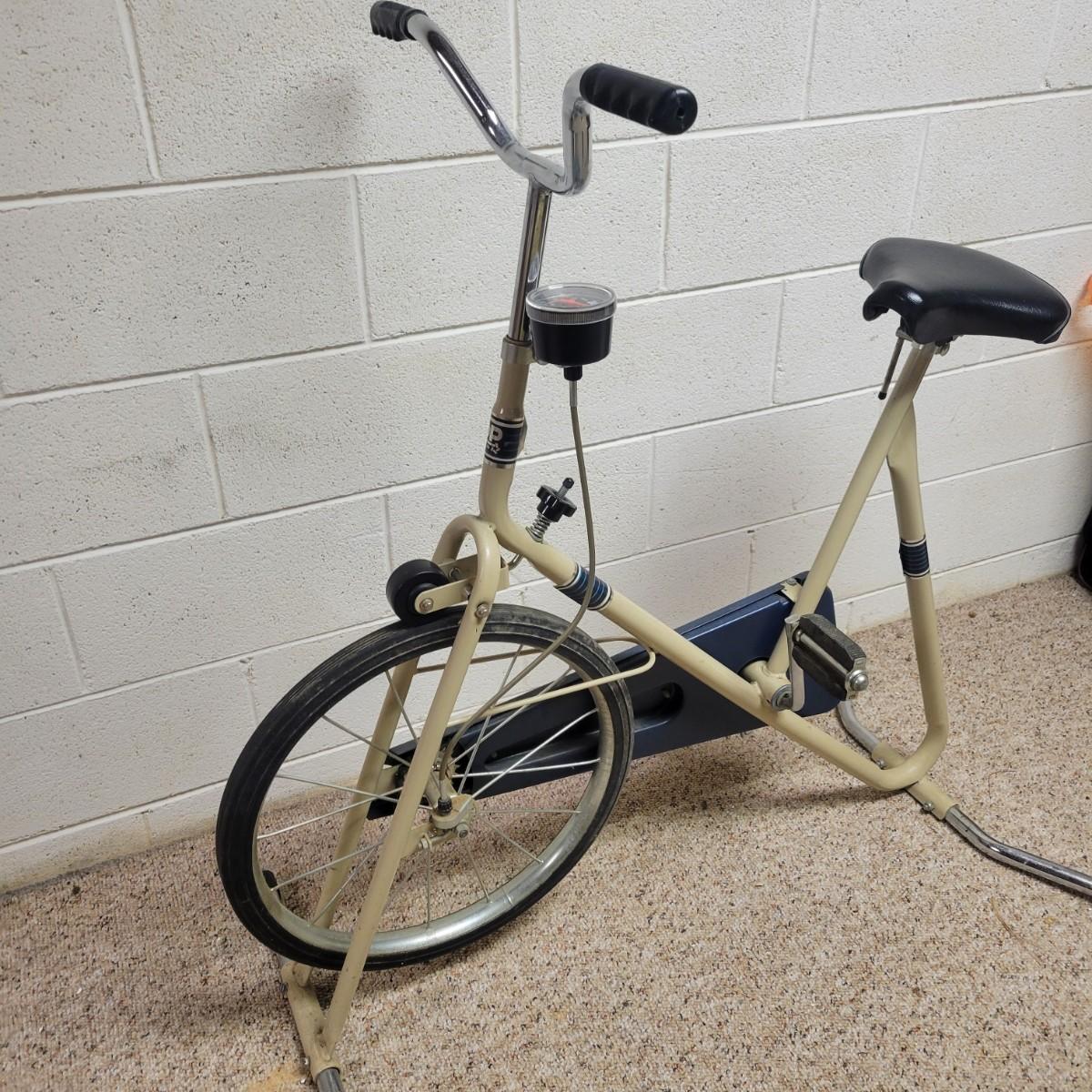 A vintage exercise bike in good condition, but the speedometer doesn't read correctly when used. This old school exercise bike is a DP124 that has an adjustable seat, handlebars and tension mechanism. Measures approximately 44" x 19" x 43". Local pickup only