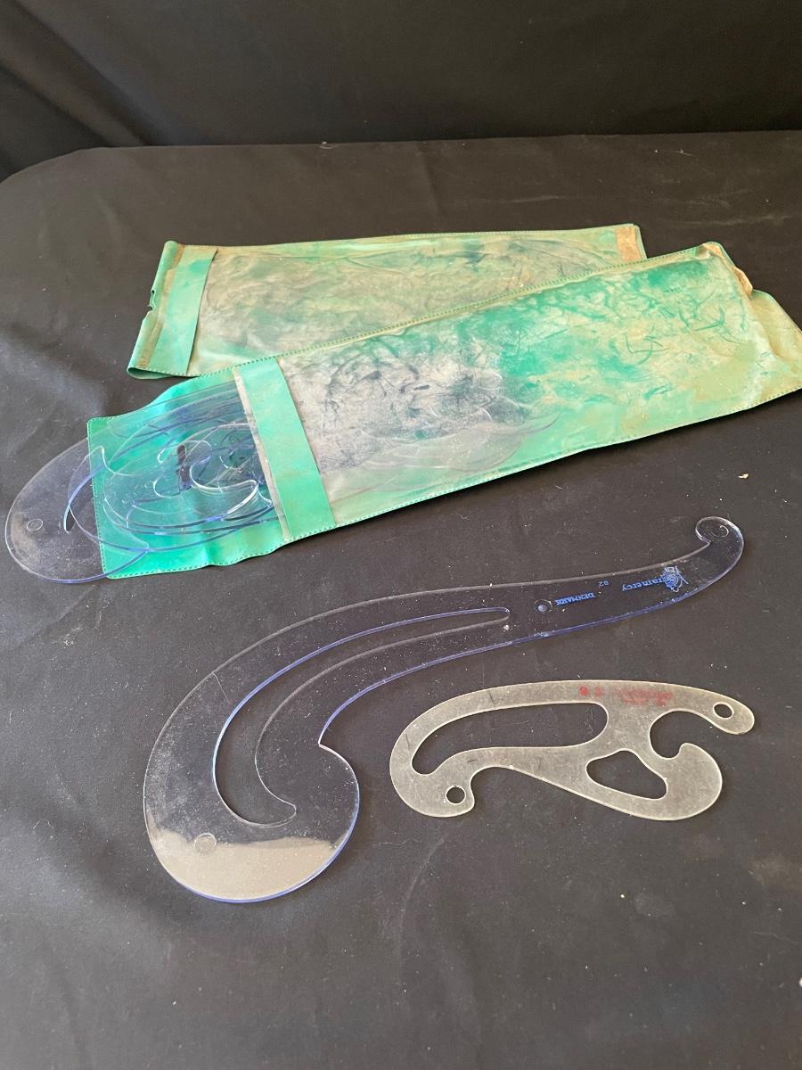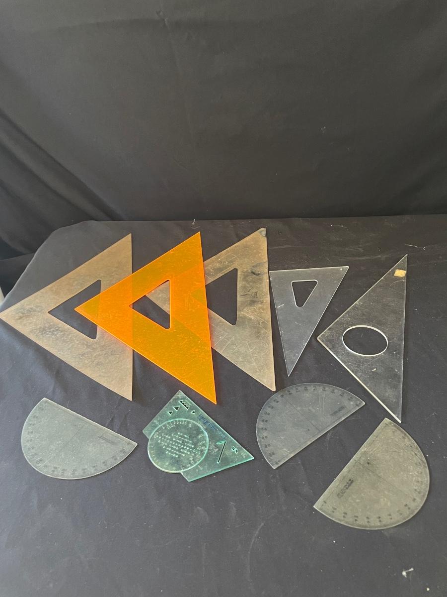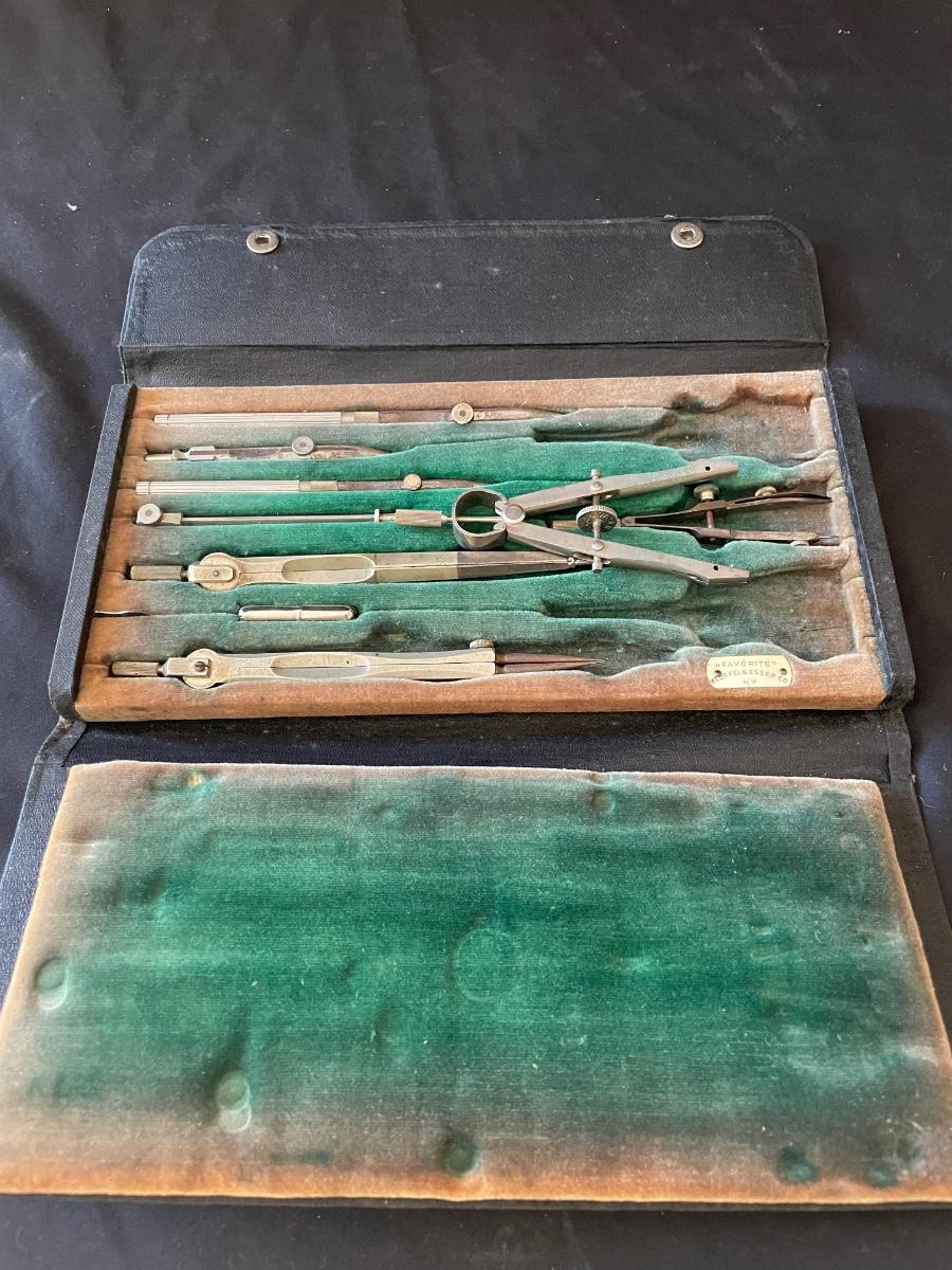 This large lot of drafting tools includes five vintage drafting tool kits from around the world; as you will see from images, some tools are missing from the cases that may or may not be found within the lose tools included. Lot also includes a plethora of rulers, stencils, protractors and erasers. Two metal edged wood/pine drafting/cutting boards. Largest board is 26" x20", smaller is 24" x18".
