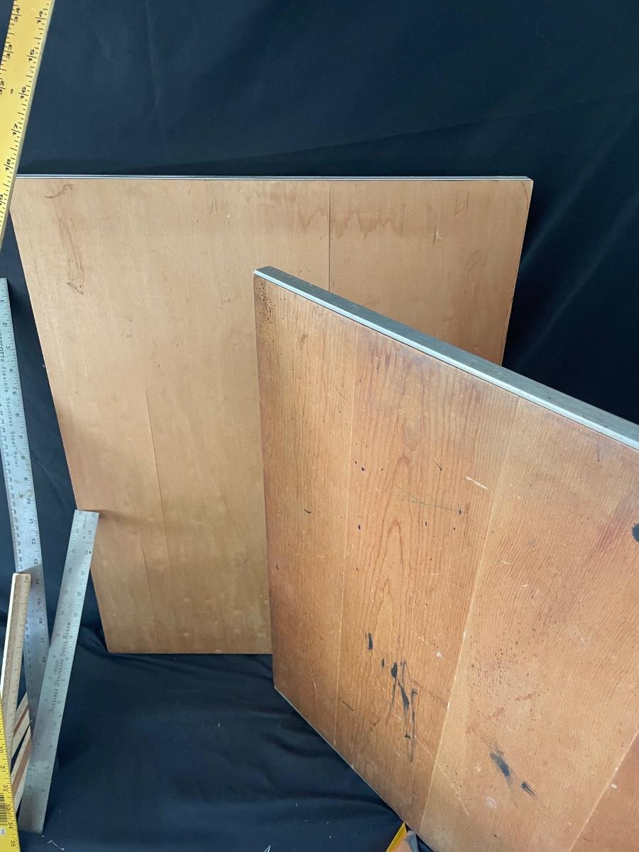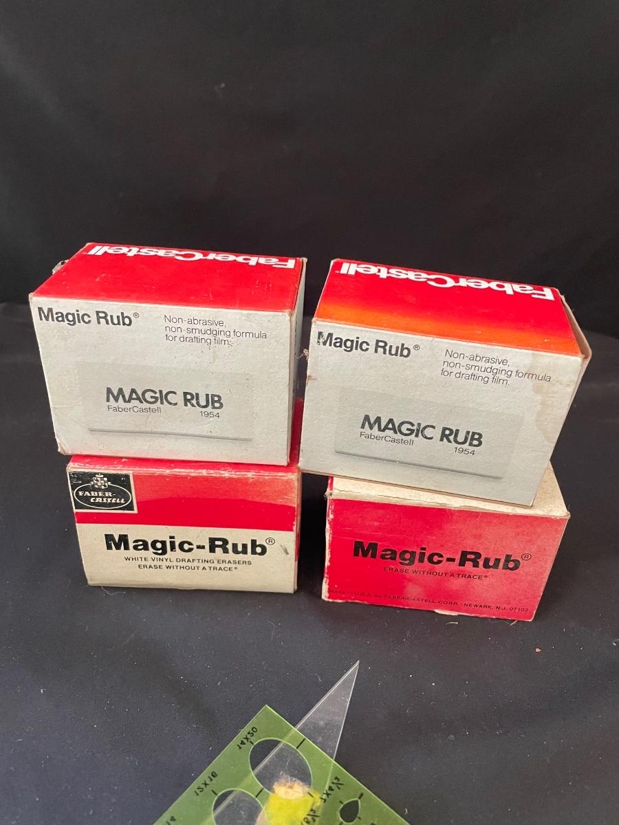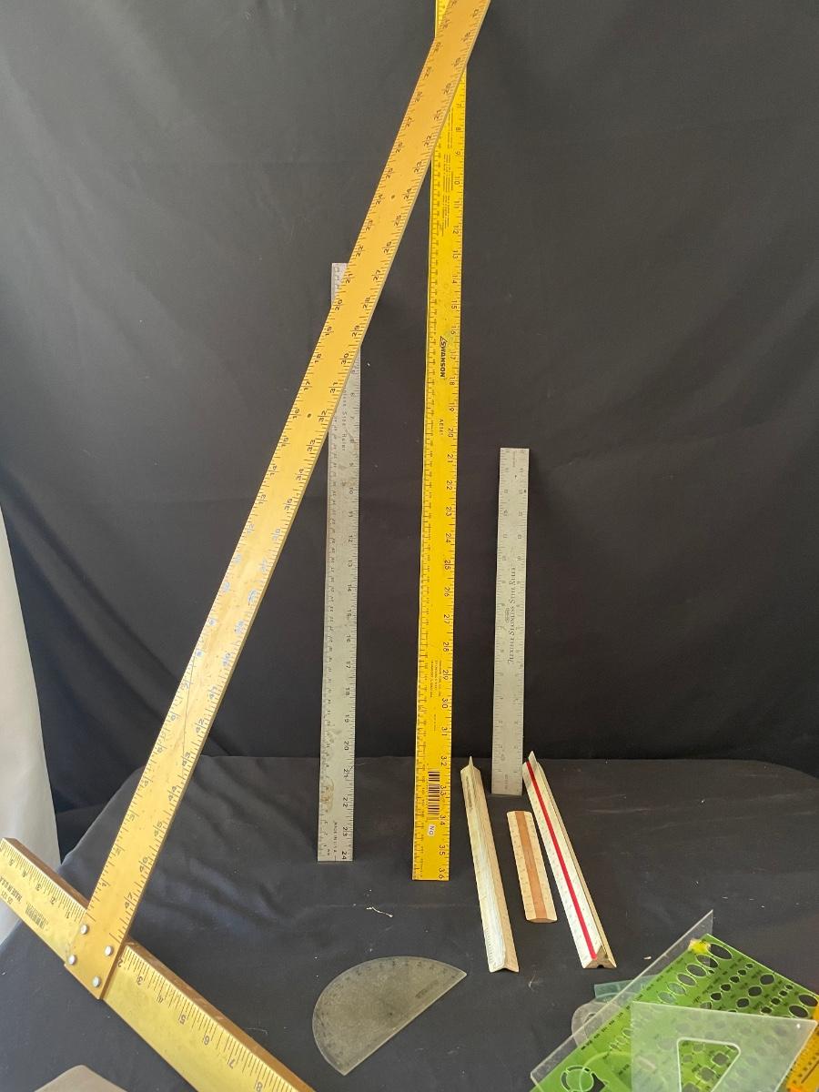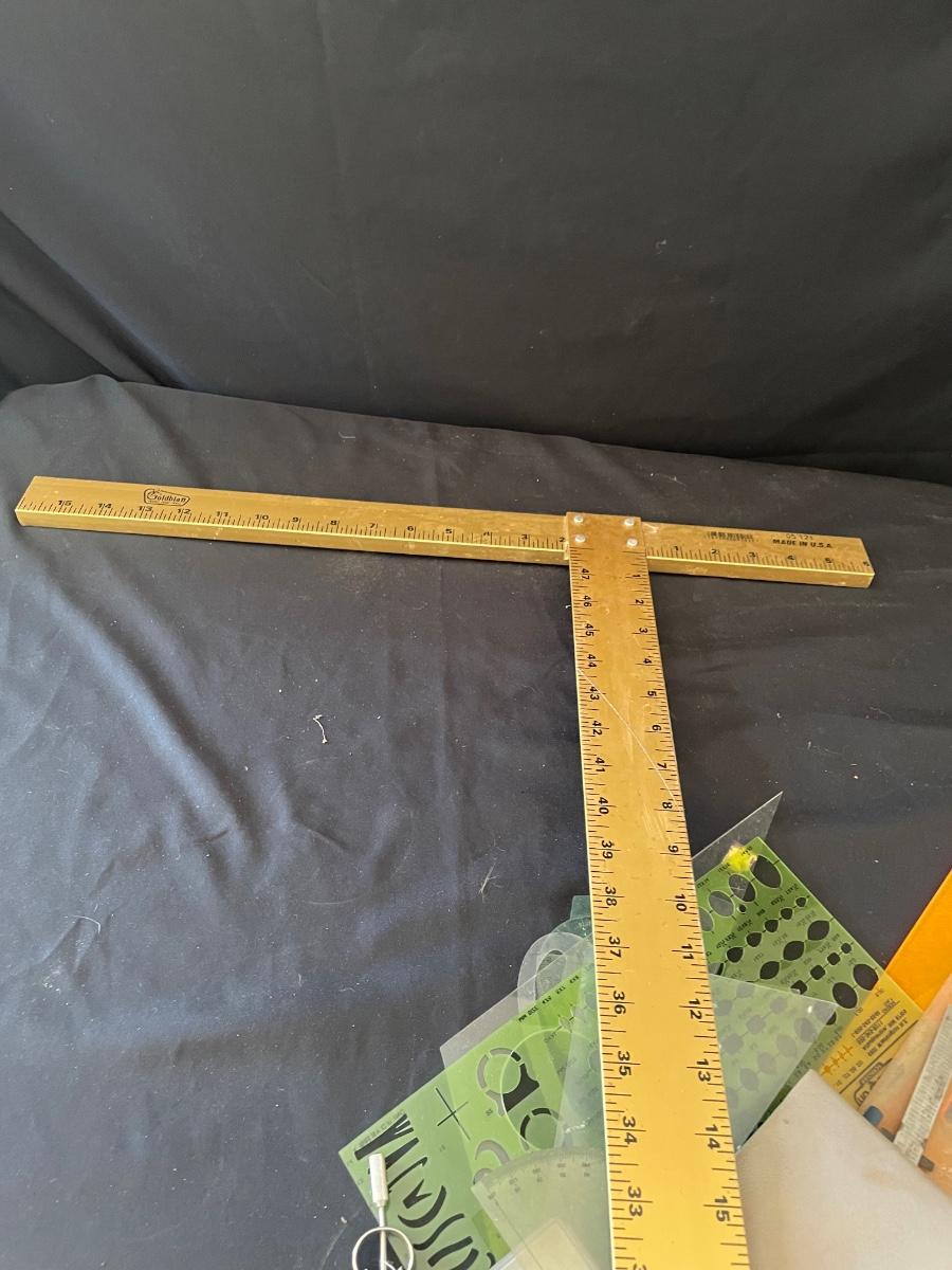 This large lot of drafting tools includes five vintage drafting tool kits from around the world; as you will see from images, some tools are missing from the cases that may or may not be found within the lose tools included. Lot also includes a plethora of rulers, stencils, protractors and erasers. Two metal edged wood/pine drafting/cutting boards. Largest board is 26" x20", smaller is 24" x18".