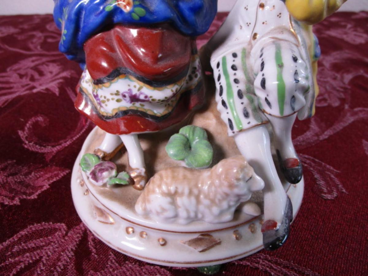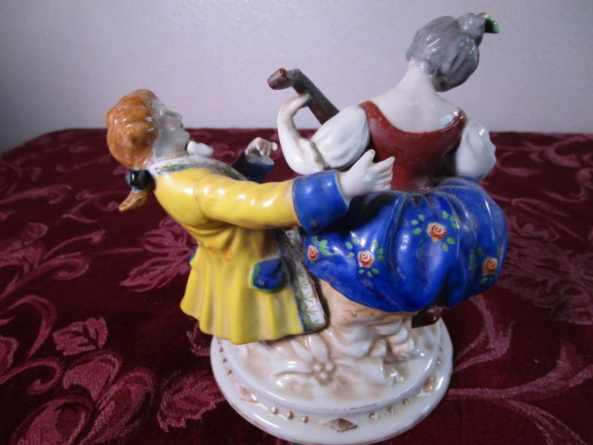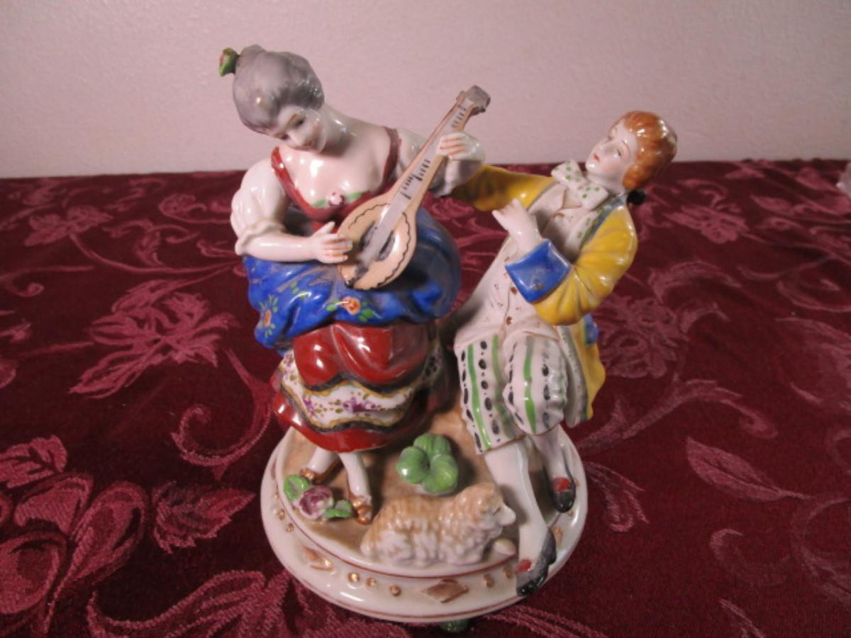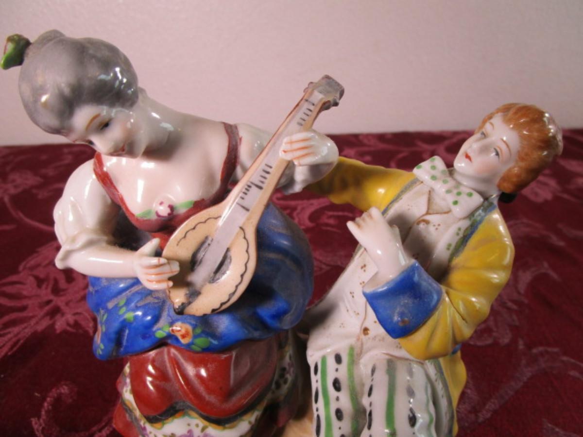 Vintage Dresden-style Figurine of woman playing lute with gentleman, porcelain