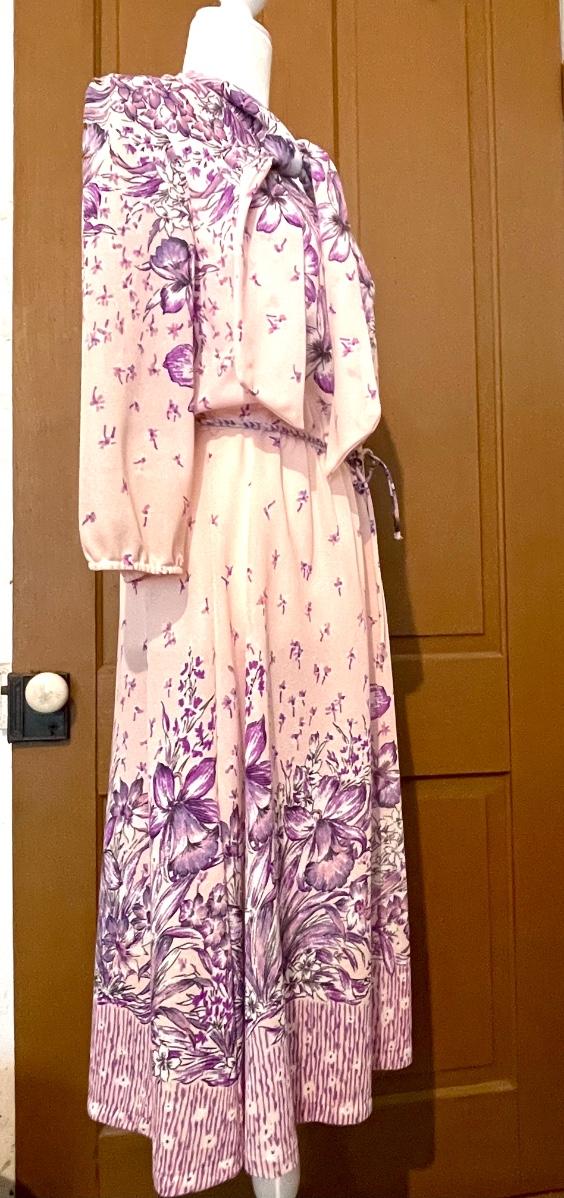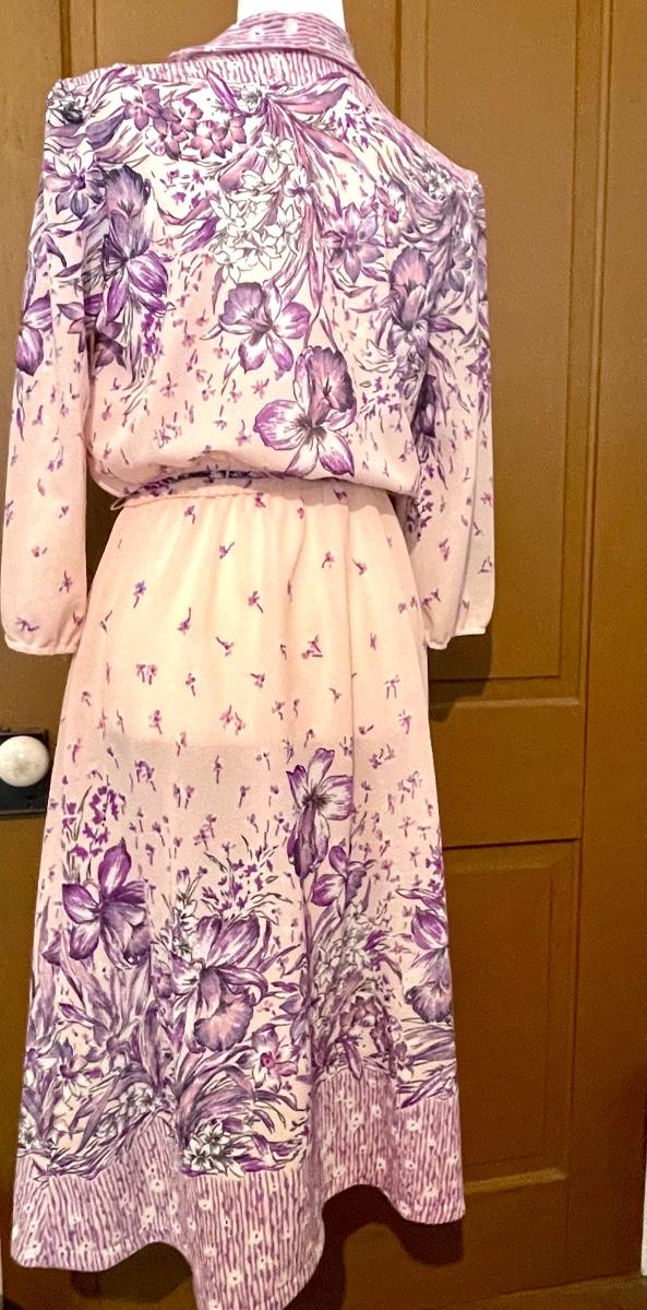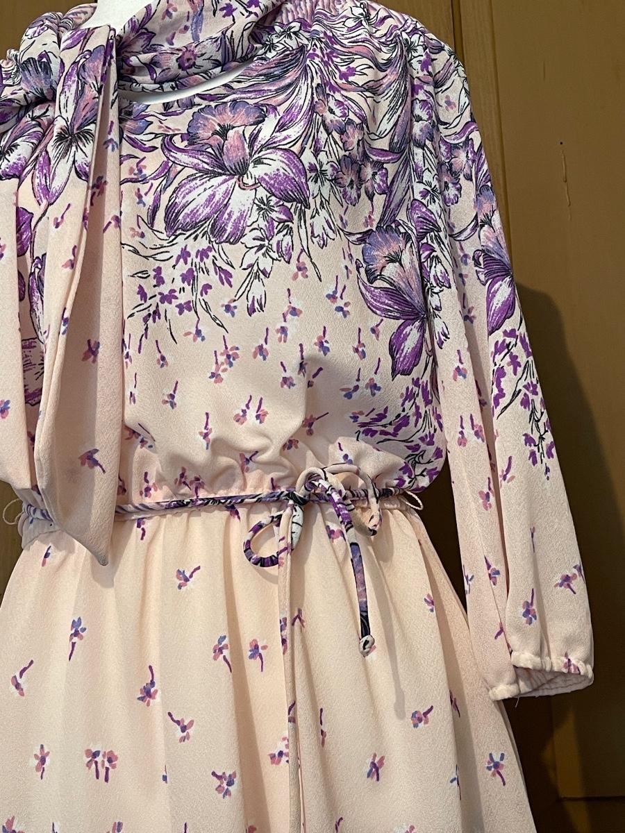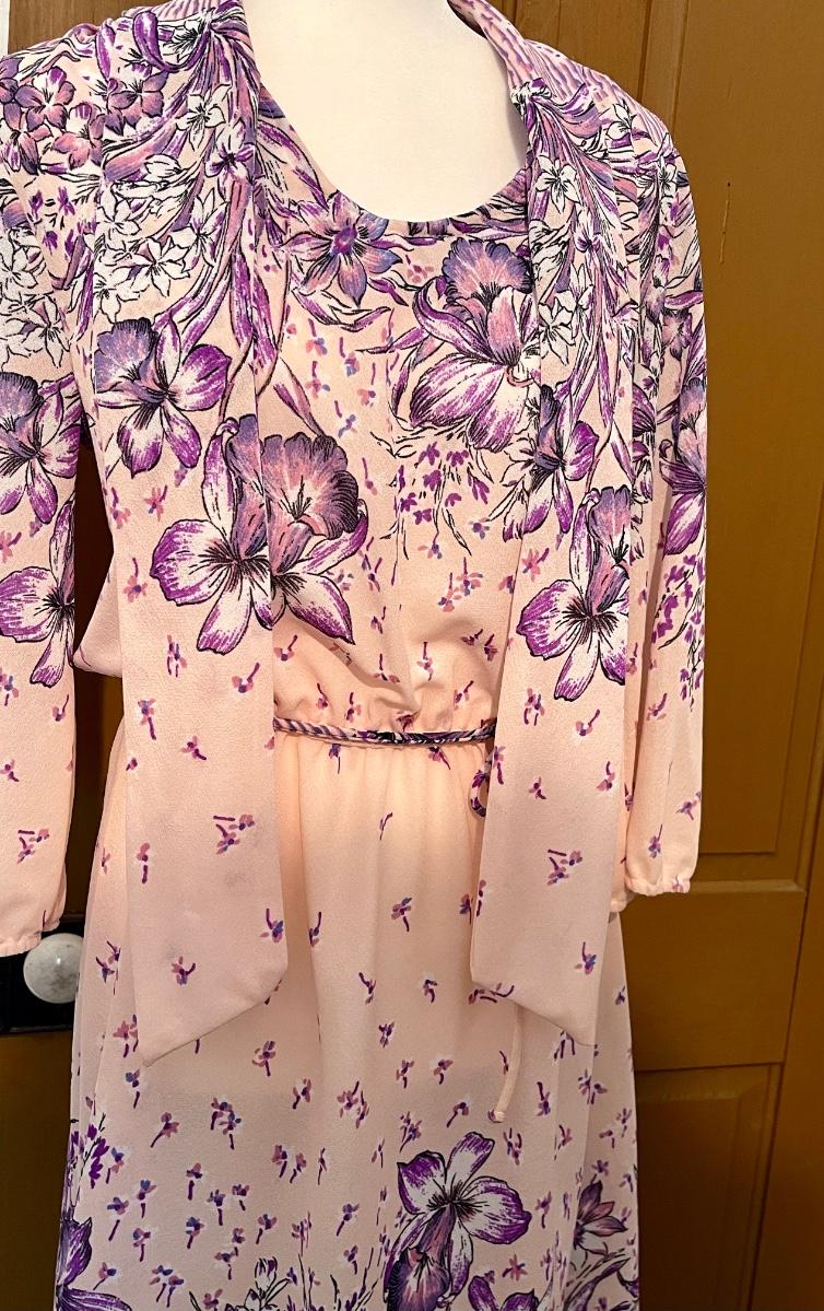 How pretty is this? Probably smaller than a size 16 today. Vintage sizes are smaller. Elastic waistband has a tie for the waist and attached loops. Also, has attached neck tie. So pretty in pinks and lavenders. Wouldn’t this be a beautiful Easter dress? These older style dresses are all the rage now. Simply beautiful! I feel the size 16 is older sizing- I believe it would be smaller than the size 16 of today. Please message with any questions.