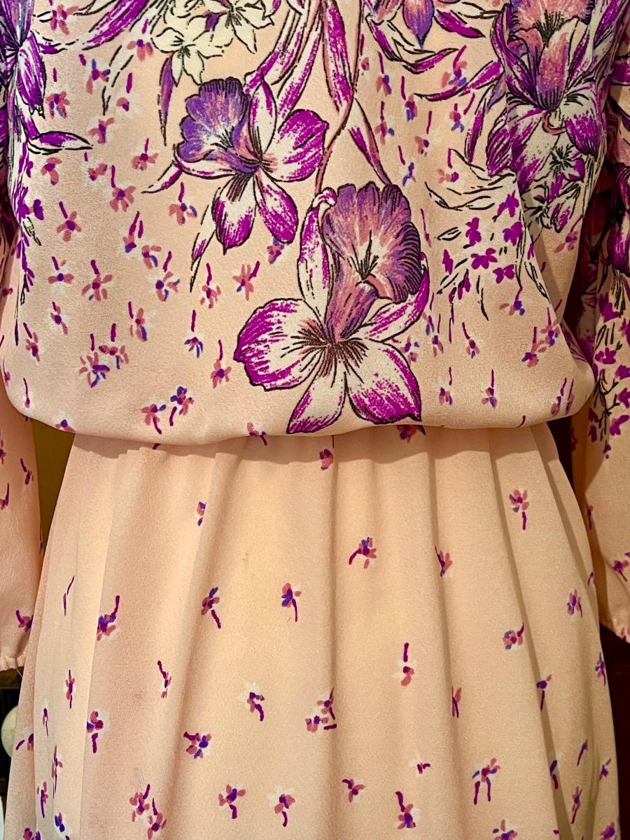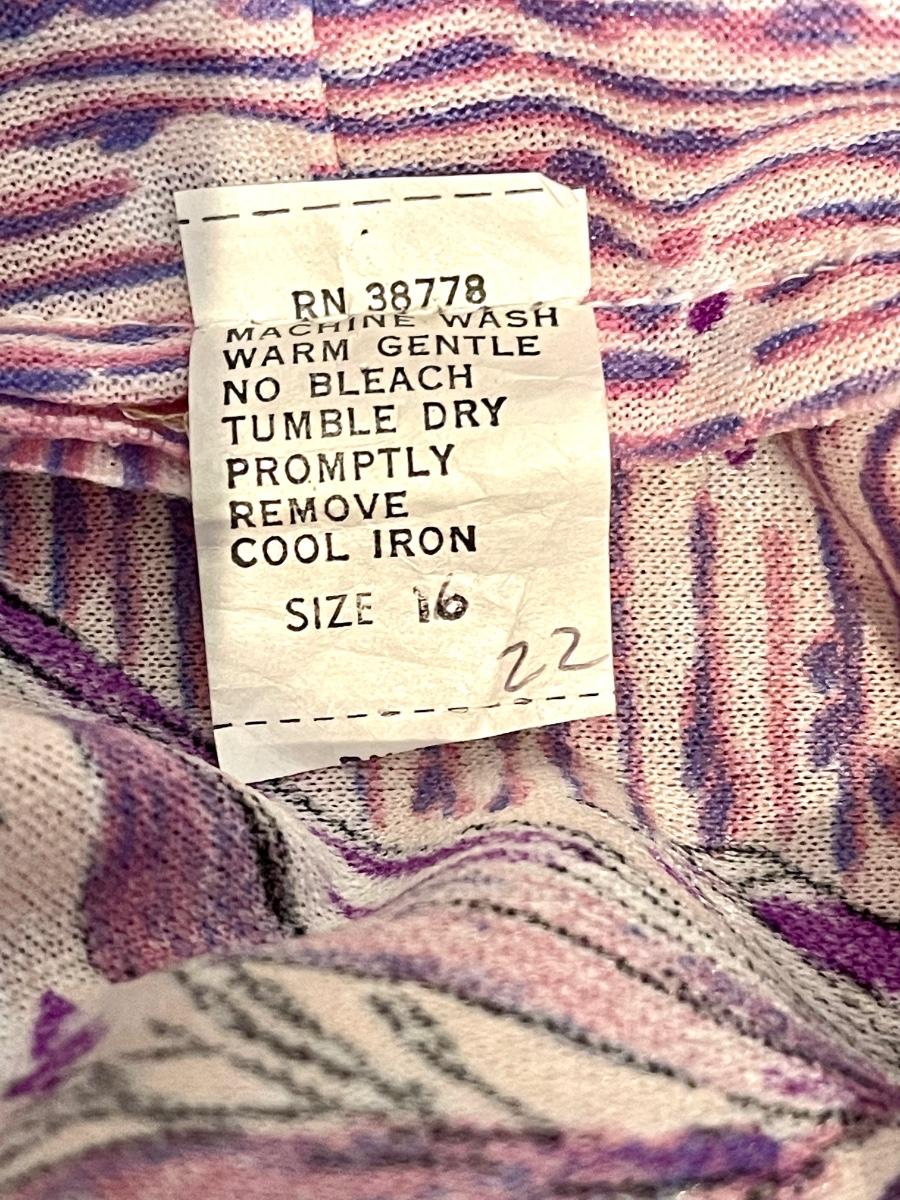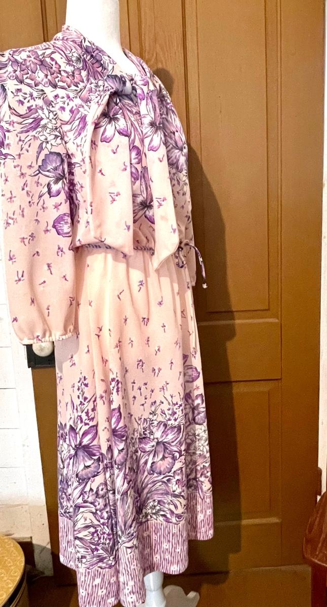 How pretty is this? Probably smaller than a size 16 today. Vintage sizes are smaller. Elastic waistband has a tie for the waist and attached loops. Also, has attached neck tie. So pretty in pinks and lavenders. Wouldn’t this be a beautiful Easter dress? These older style dresses are all the rage now. Simply beautiful! I feel the size 16 is older sizing- I believe it would be smaller than the size 16 of today. Please message with any questions.