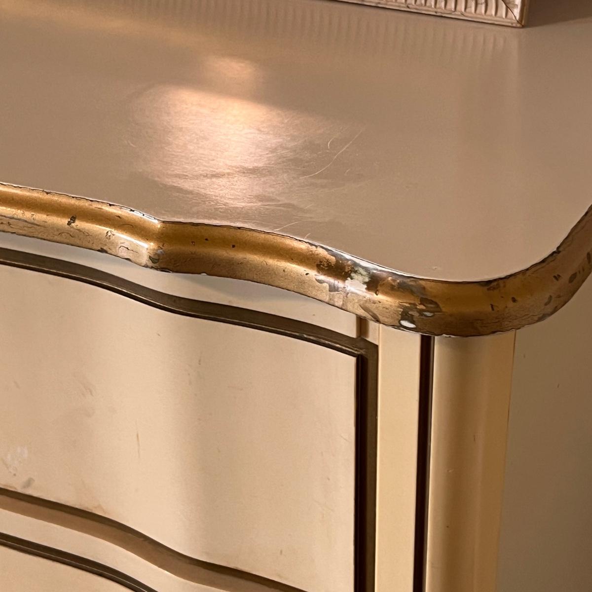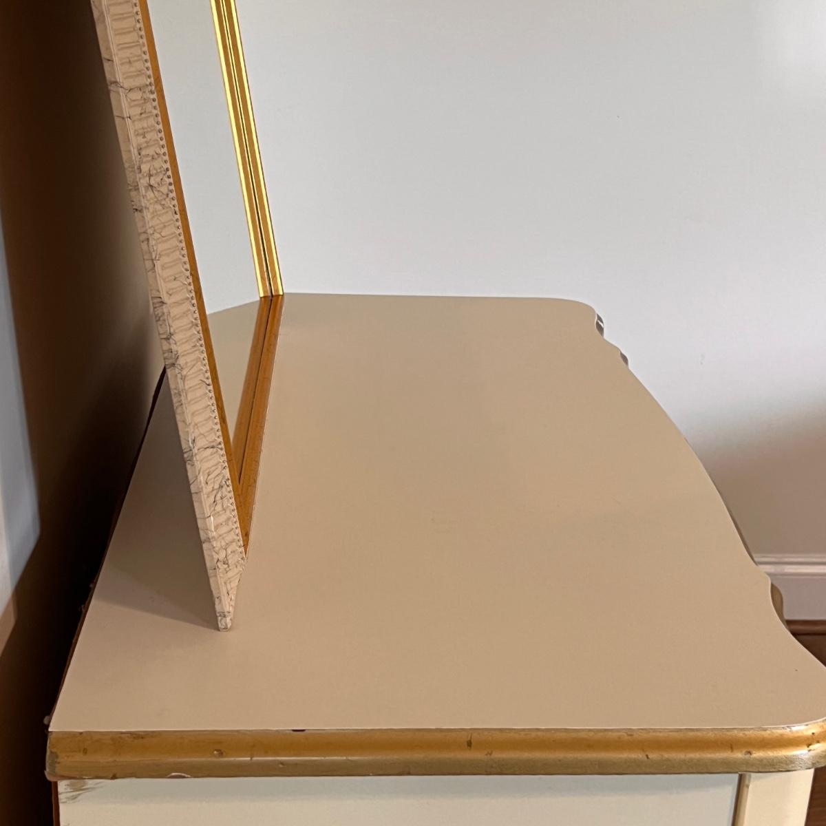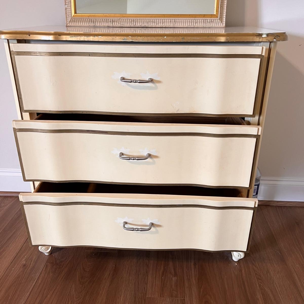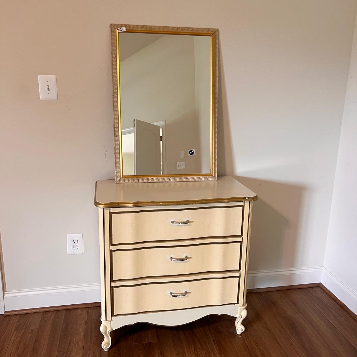 3 drawer vintage dresser in cream and gold and framed leaning mirror. Has some discoloration and scratches. Top drawer is a bit loose from track. Great piece with decorative accents to repaint or touch up. See pics for measurements.