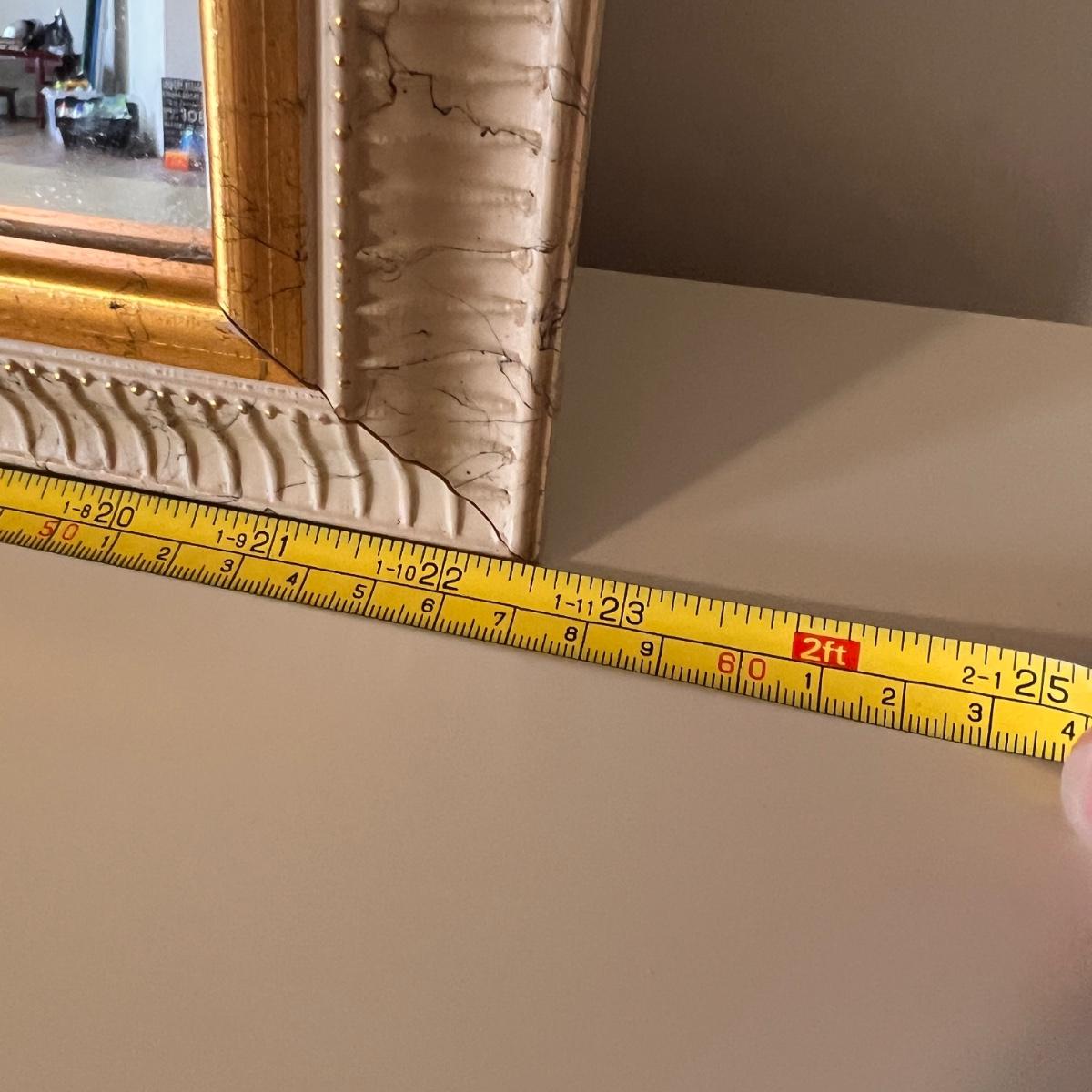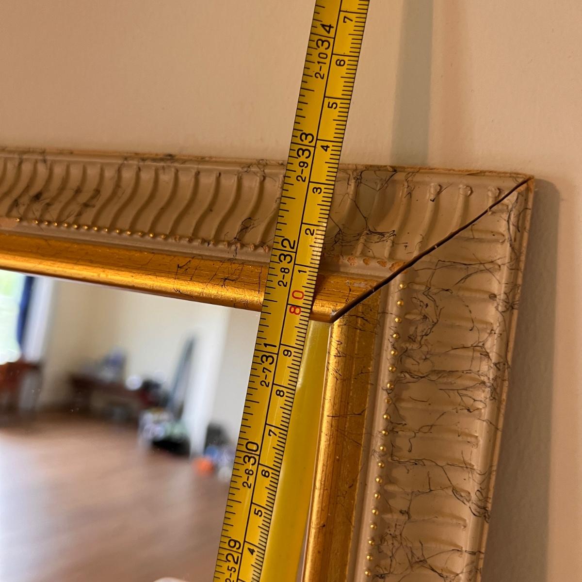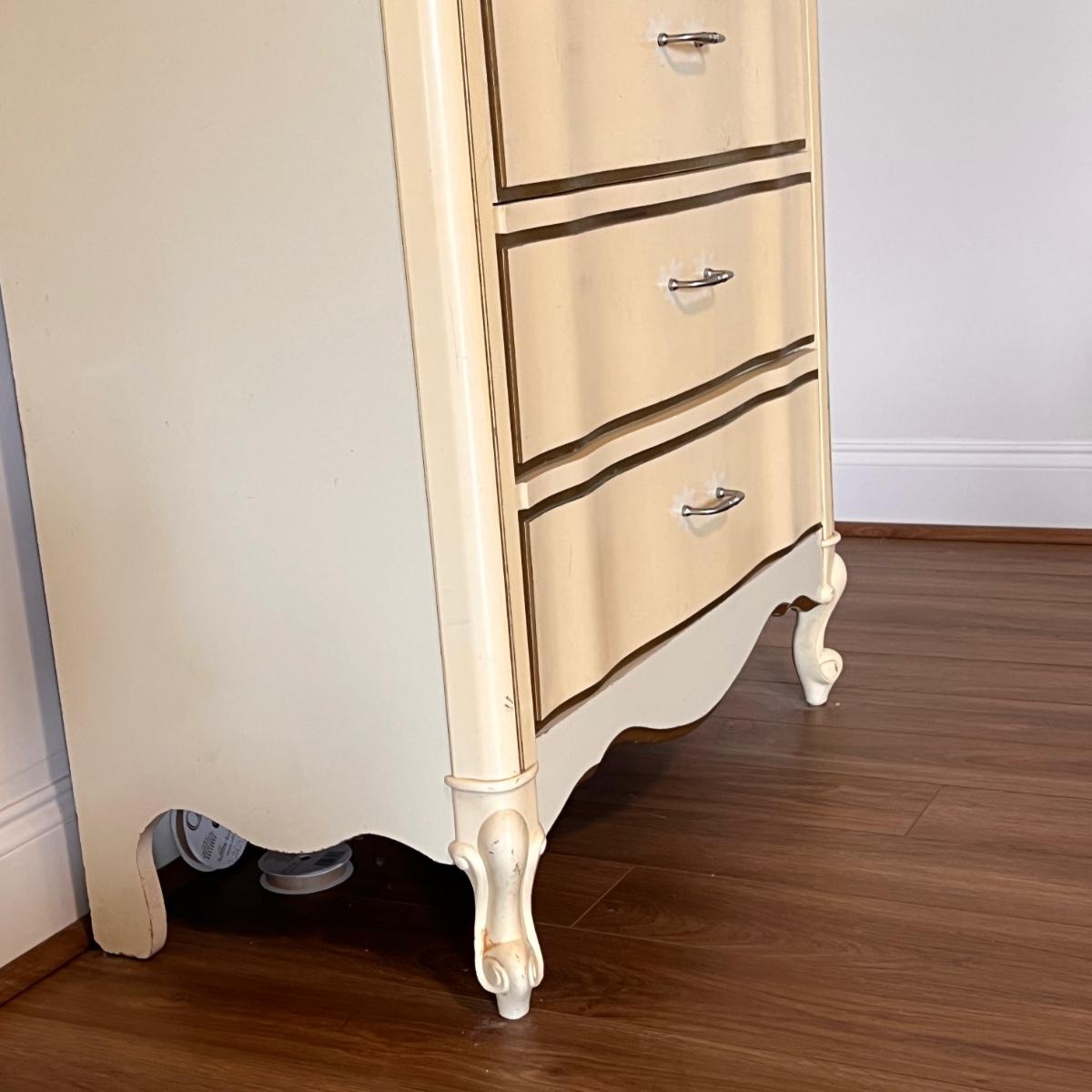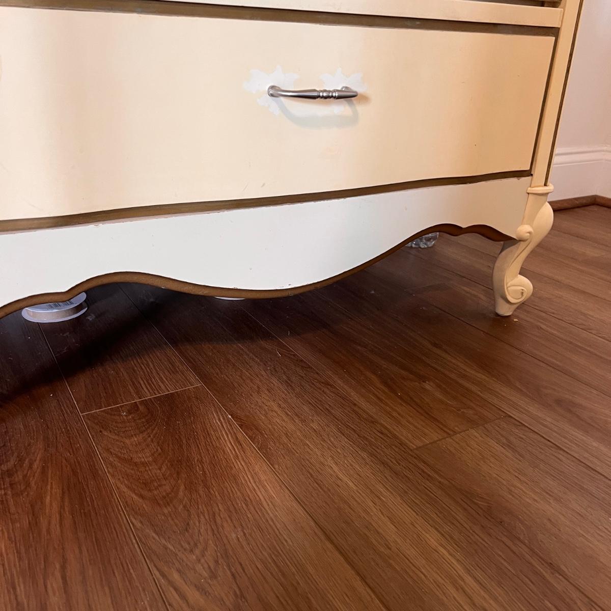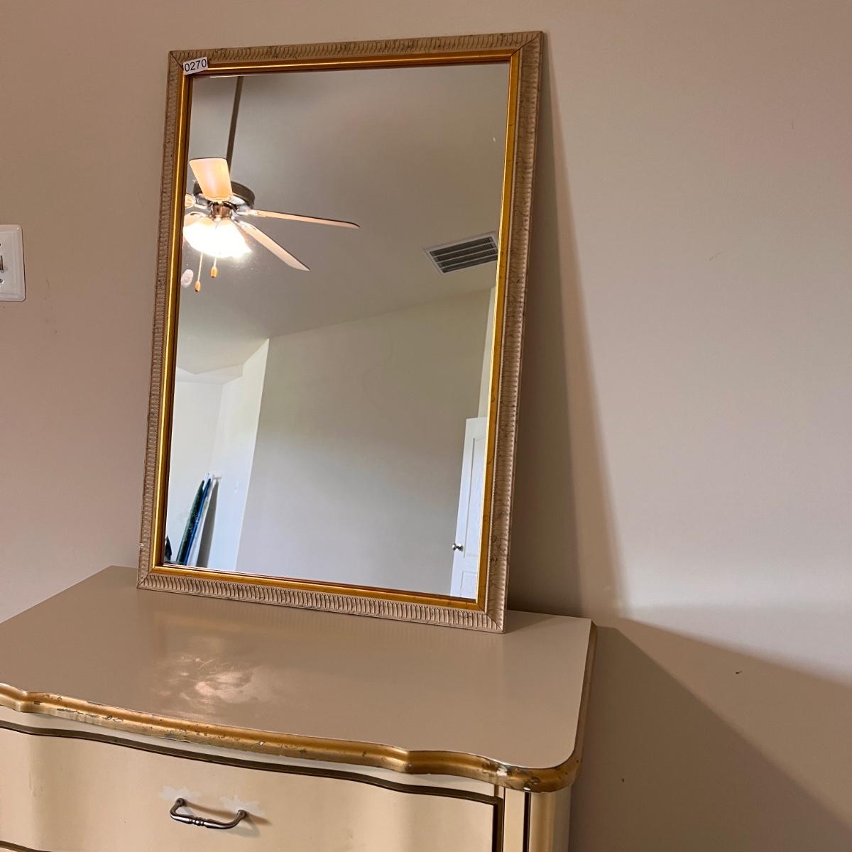 3 drawer vintage dresser in cream and gold and framed leaning mirror. Has some discoloration and scratches. Top drawer is a bit loose from track. Great piece with decorative accents to repaint or touch up. See pics for measurements.