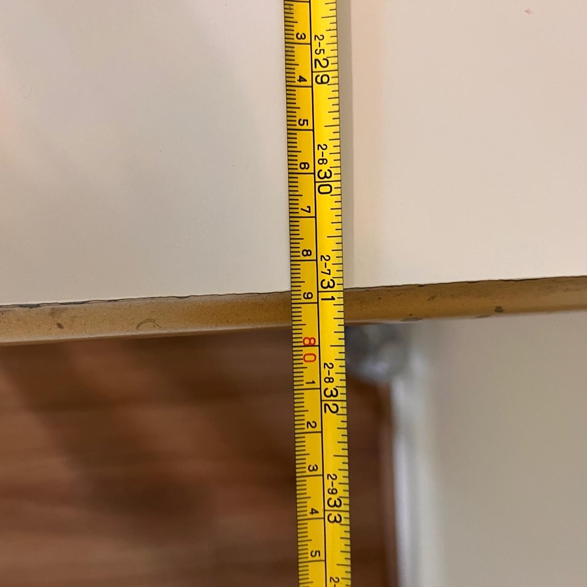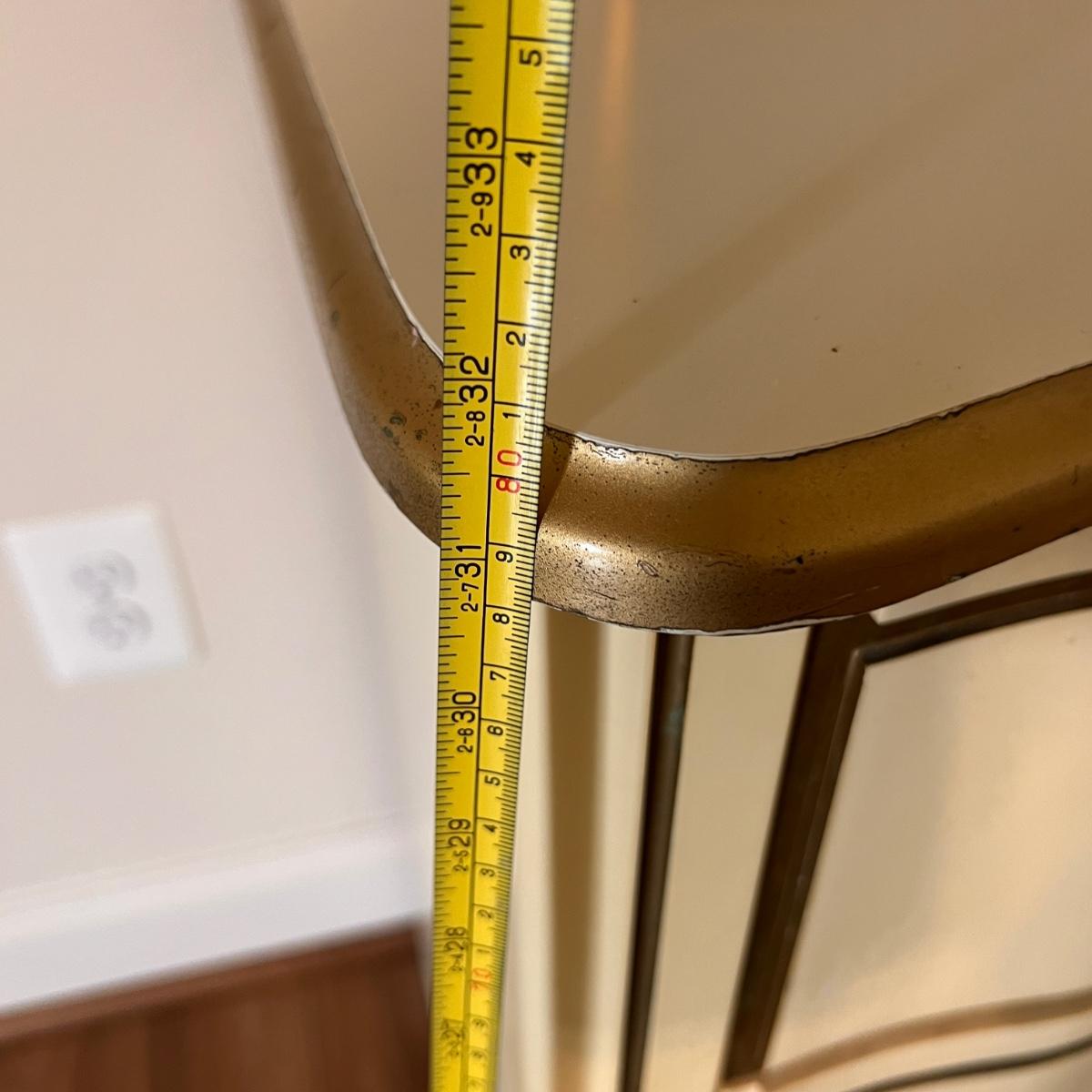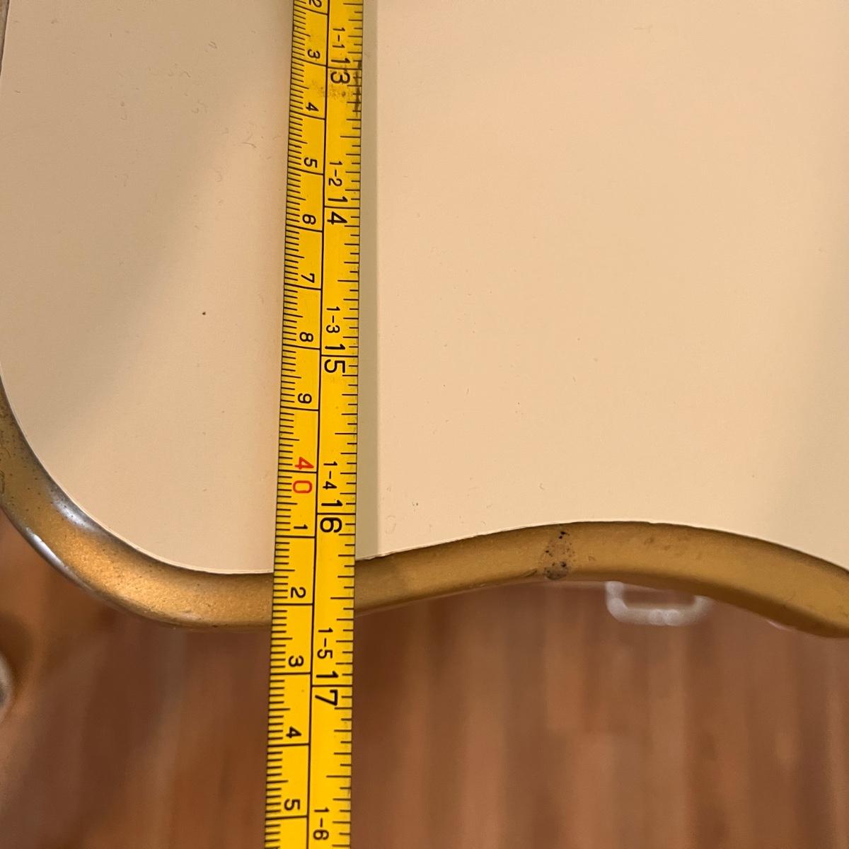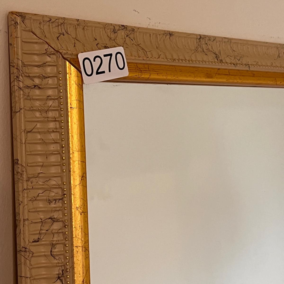 3 drawer vintage dresser in cream and gold and framed leaning mirror. Has some discoloration and scratches. Top drawer is a bit loose from track. Great piece with decorative accents to repaint or touch up. See pics for measurements.