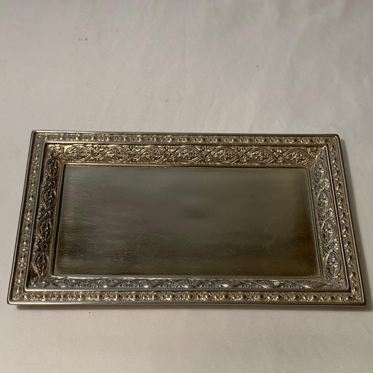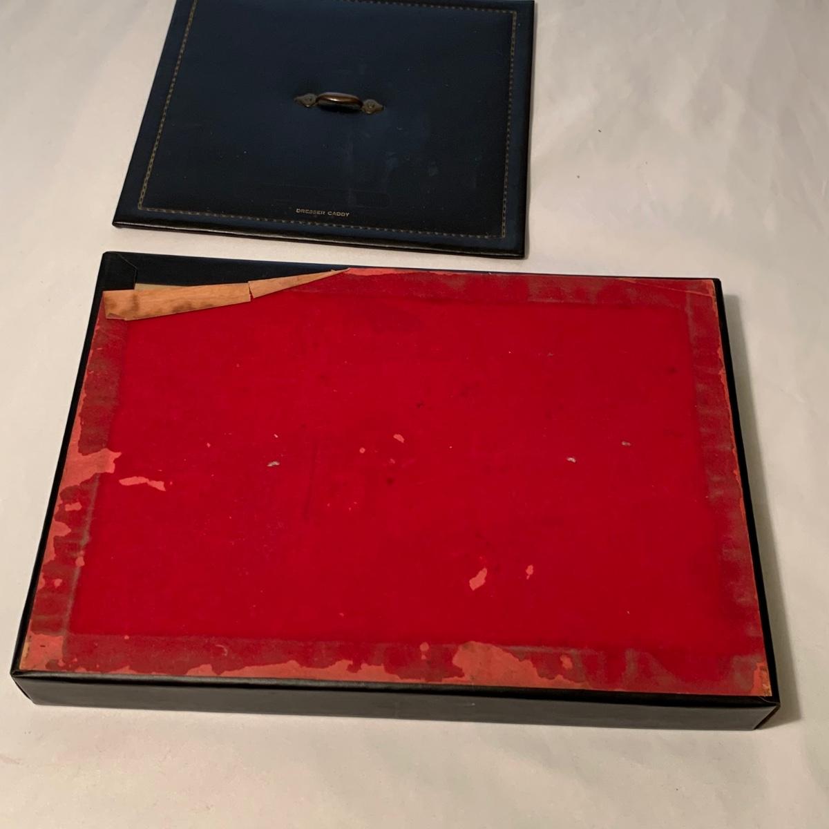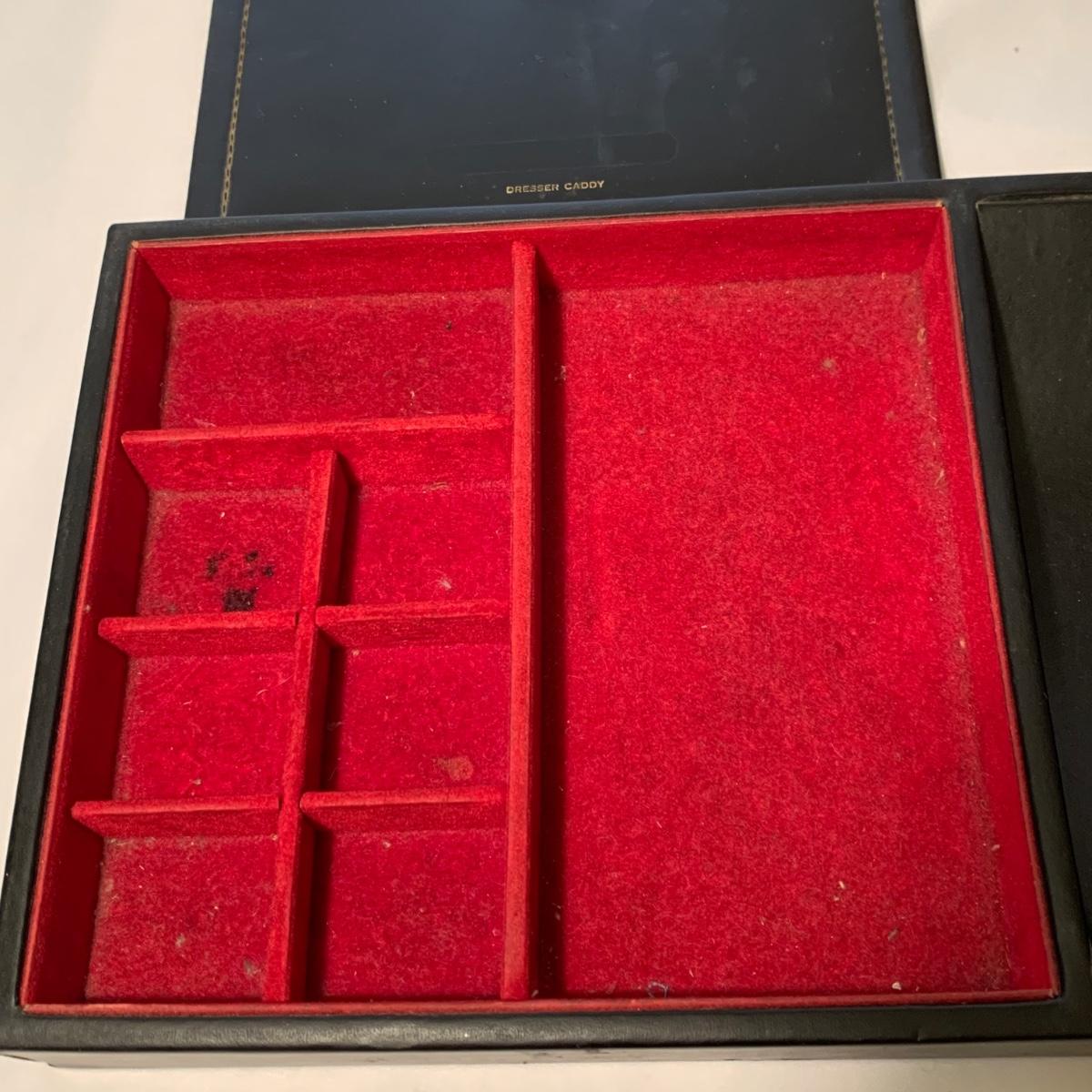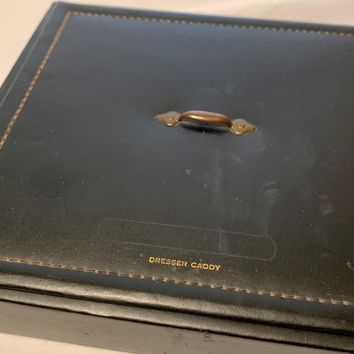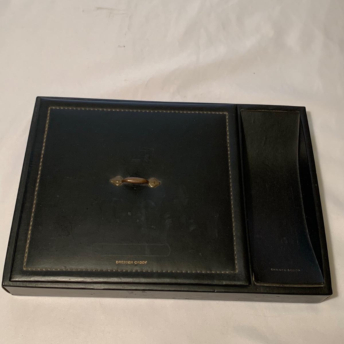 A vintage dresser caddy with a change scoop. Caddy feels like it’s leather and has a soft red inner lining. It measures 11.5” x 8” x 1.5”. It is used and shows some wear and dust inside. Two unique tie tacks and two animal pins. Two pocketknives, both with a little rust. One pair of vintage ornate tweezers. A small rectangular jewelry case that appears to be unused. A small round lidded Brazilian made wooden box and a nickel colored cambria tray. Shipping available.