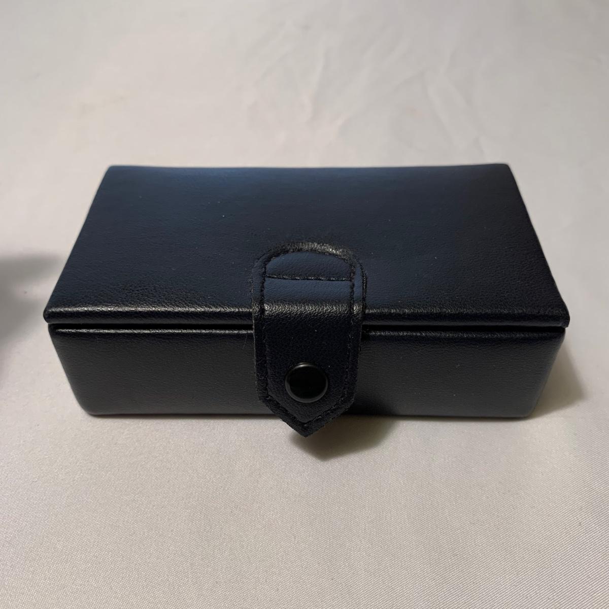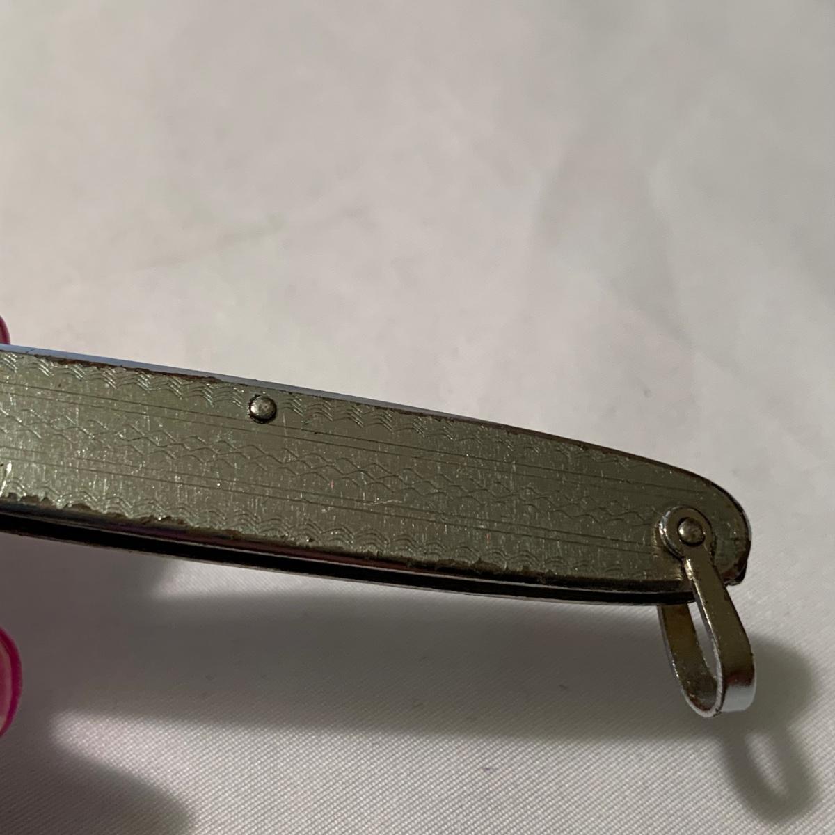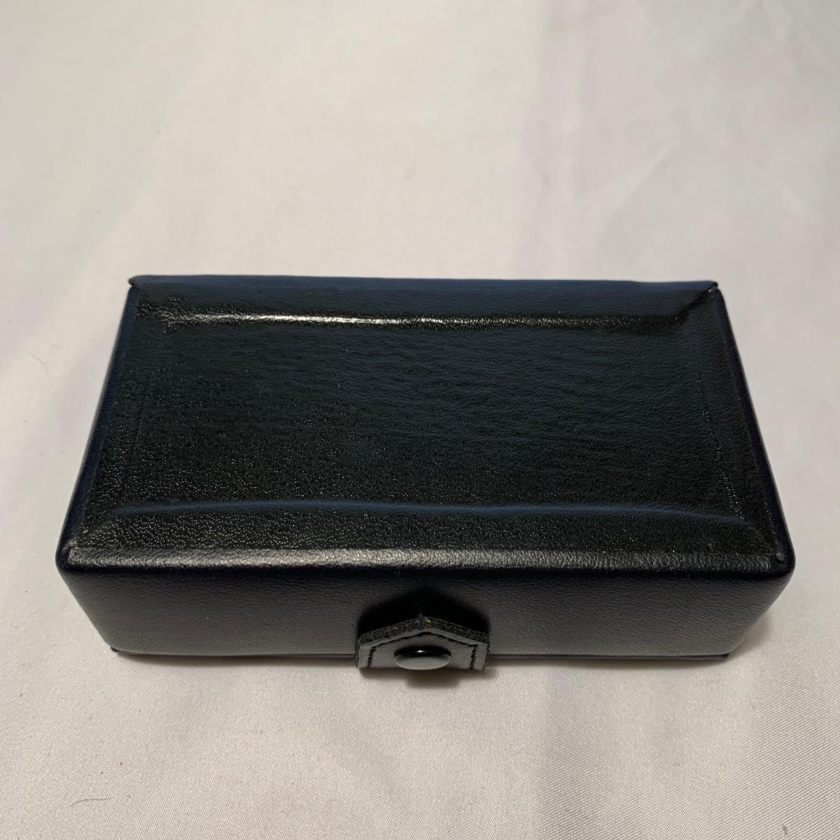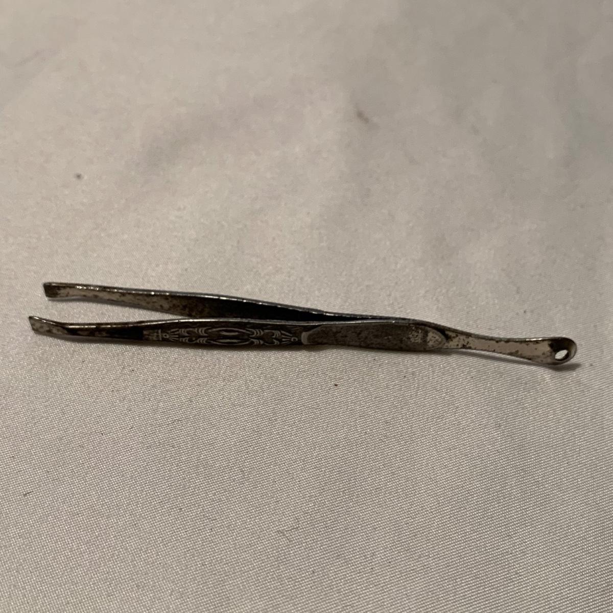 A vintage dresser caddy with a change scoop. Caddy feels like it’s leather and has a soft red inner lining. It measures 11.5” x 8” x 1.5”. It is used and shows some wear and dust inside. Two unique tie tacks and two animal pins. Two pocketknives, both with a little rust. One pair of vintage ornate tweezers. A small rectangular jewelry case that appears to be unused. A small round lidded Brazilian made wooden box and a nickel colored cambria tray. Shipping available.