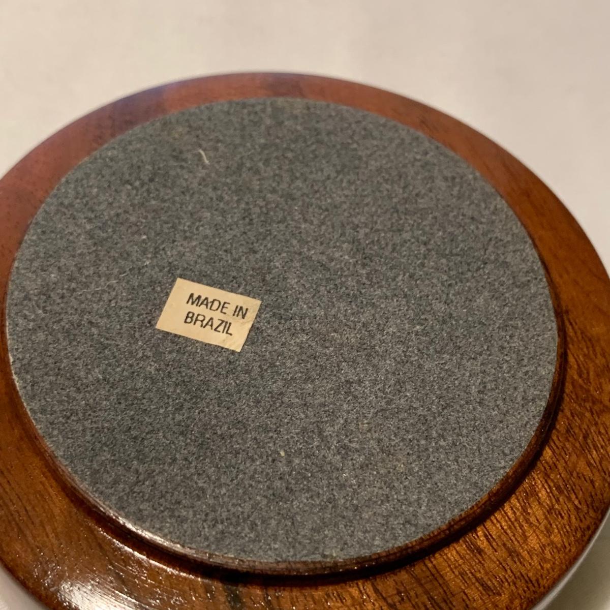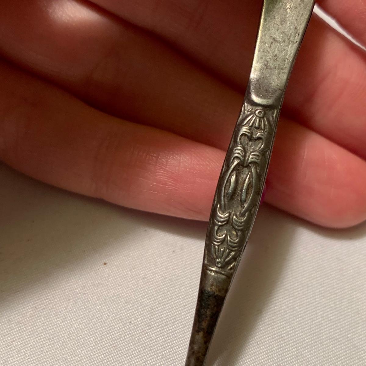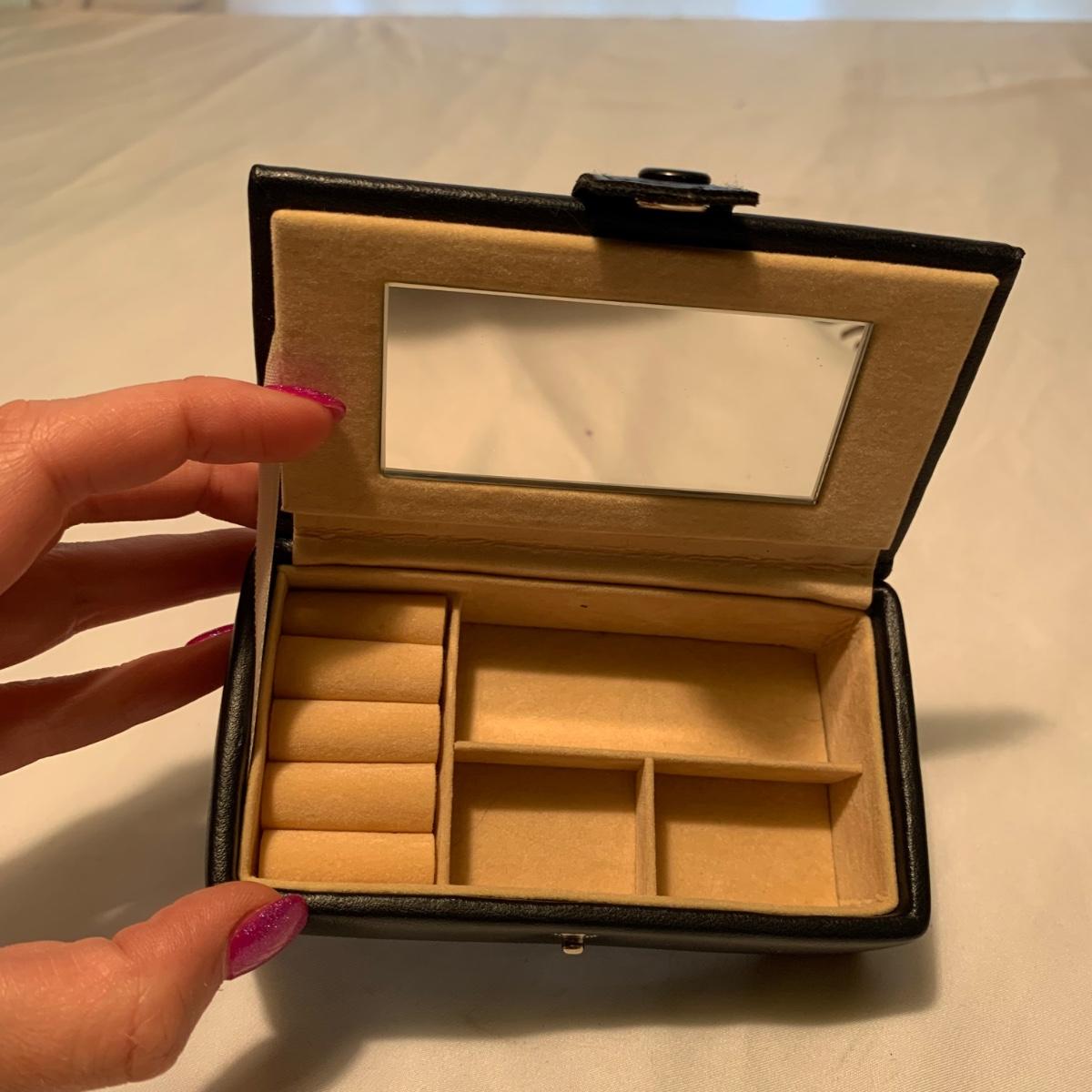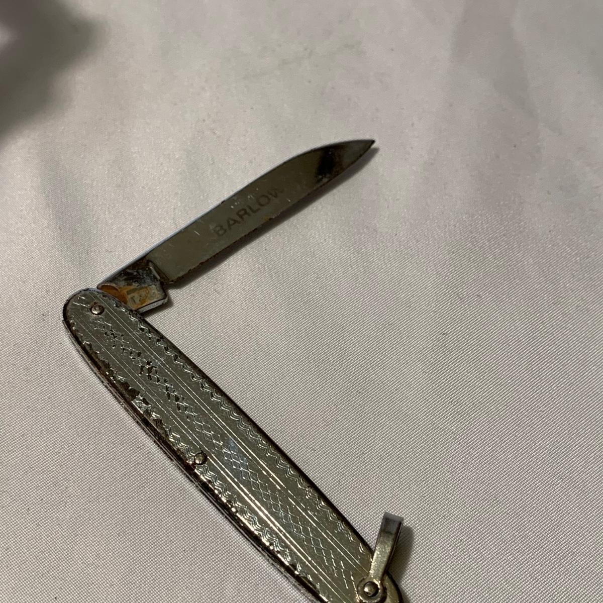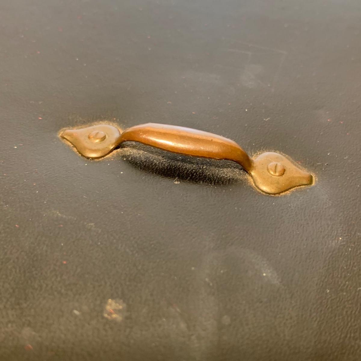 A vintage dresser caddy with a change scoop. Caddy feels like it’s leather and has a soft red inner lining. It measures 11.5” x 8” x 1.5”. It is used and shows some wear and dust inside. Two unique tie tacks and two animal pins. Two pocketknives, both with a little rust. One pair of vintage ornate tweezers. A small rectangular jewelry case that appears to be unused. A small round lidded Brazilian made wooden box and a nickel colored cambria tray. Shipping available.