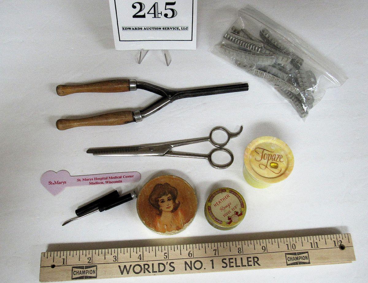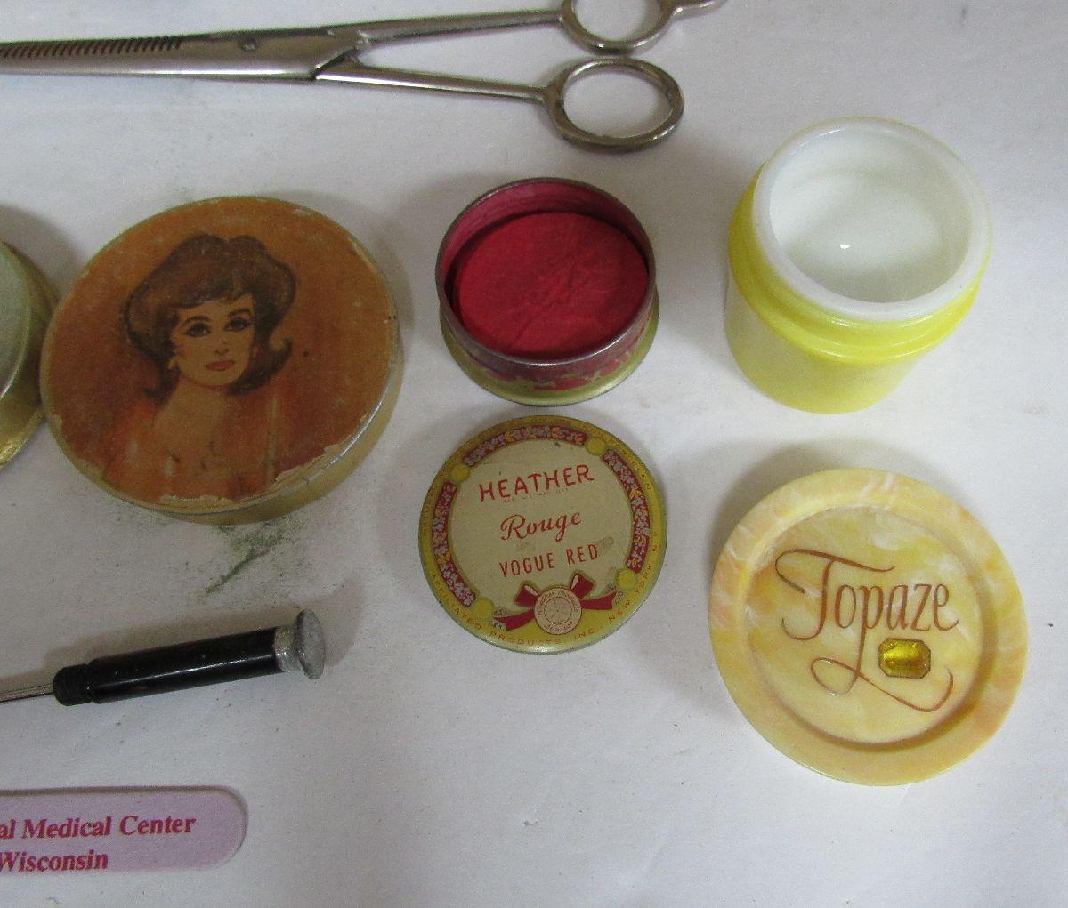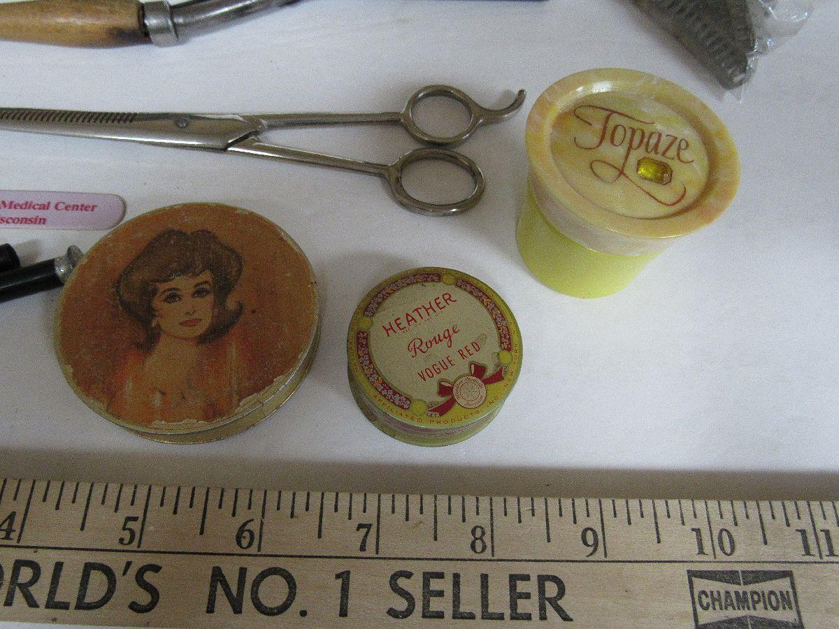 Vintage Dresser Items, Old Curling Iron, Old Rouge Tin, More
