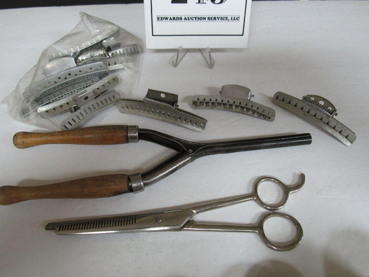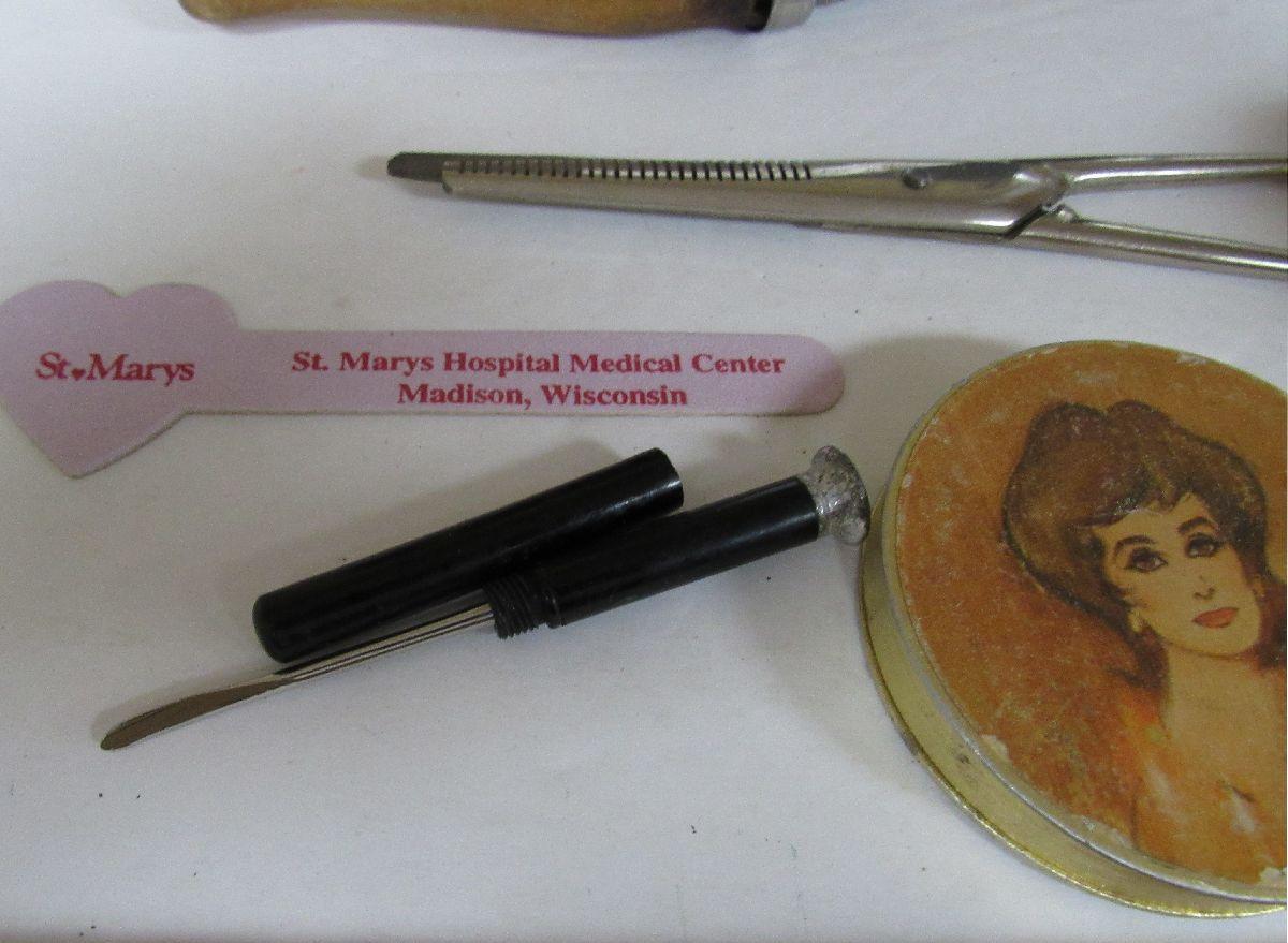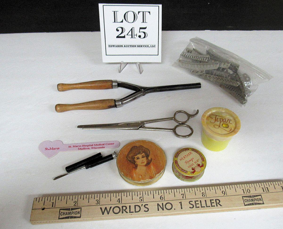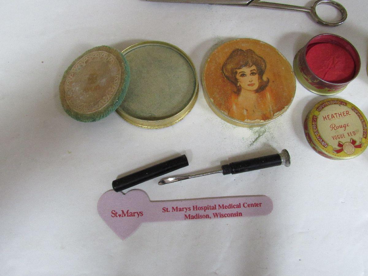 Vintage Dresser Items, Old Curling Iron, Old Rouge Tin, More