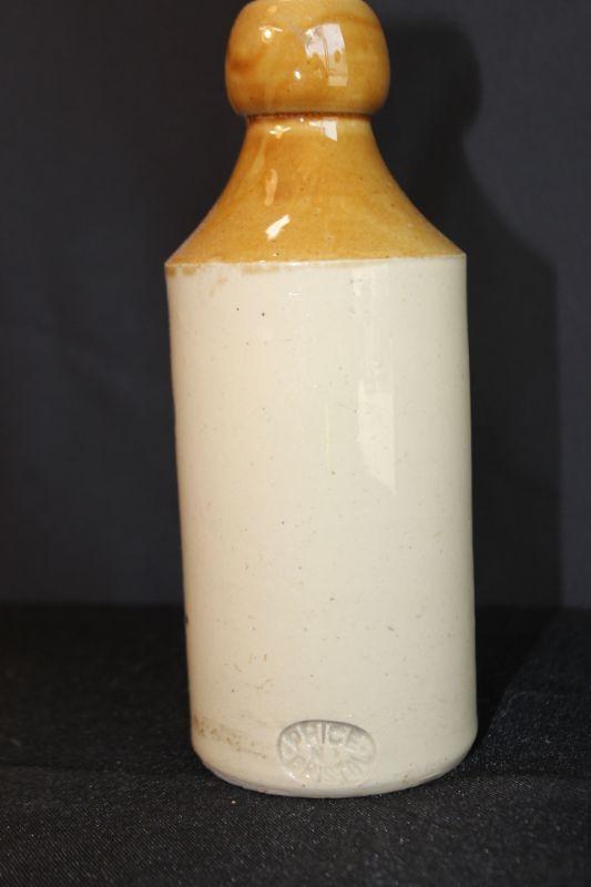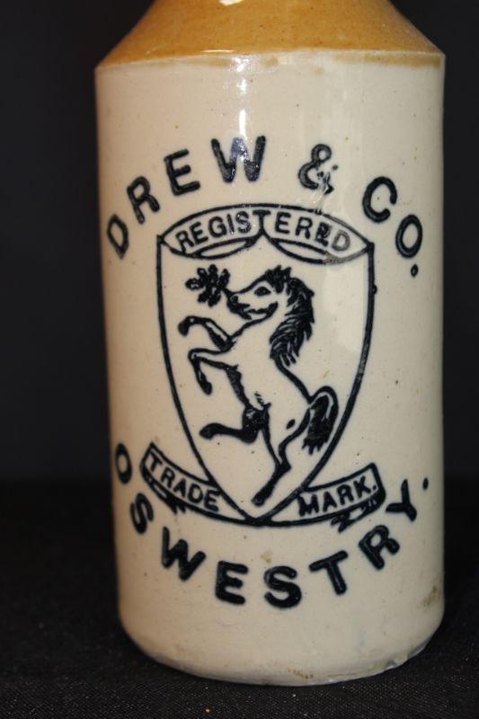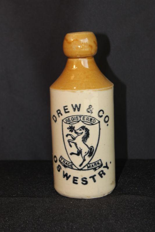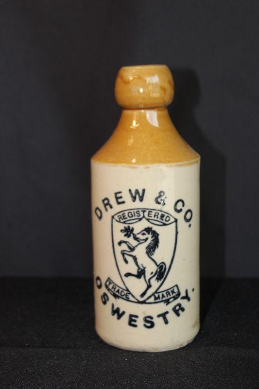 Old Drew & Co Oswestry Bottle. Glazed outside. No stopper. Stamped "Price N Bristol" along the bottom edge. No chips.
