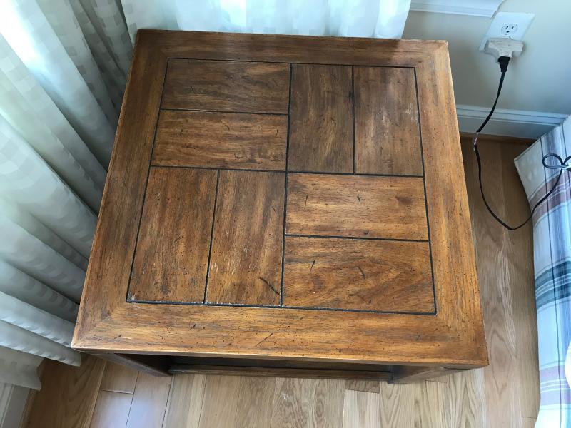 Vintage Drexel Heritage oak end table with antique brass trim. Parque style top. Pull out side tray. Shelf at botoom. Square simple legs. 26" x 26" x 21" Some minor finish wear.