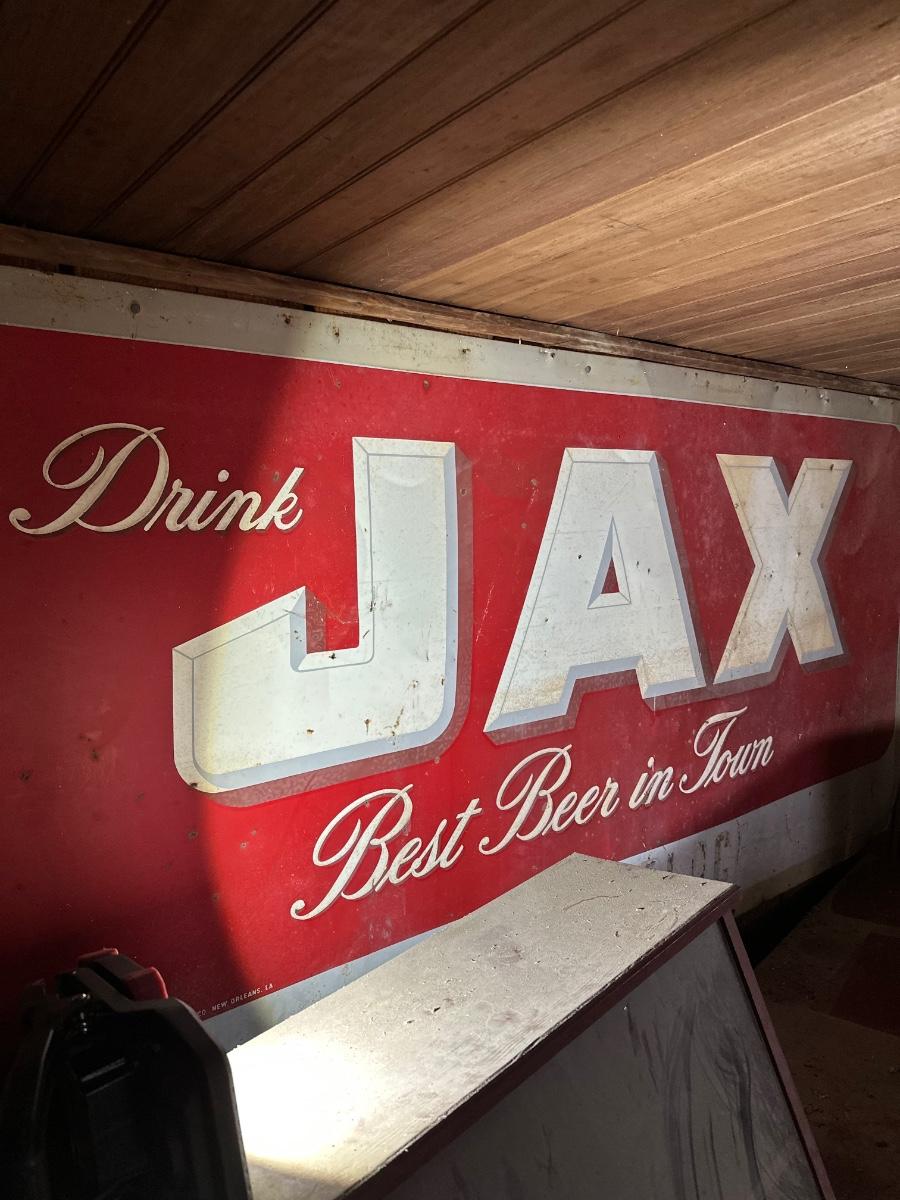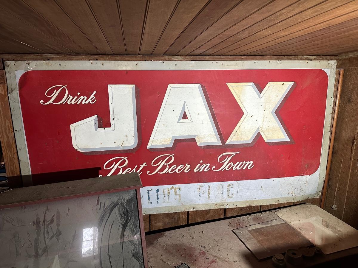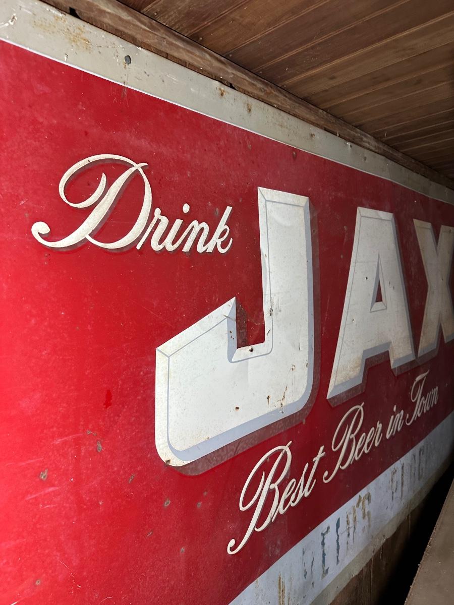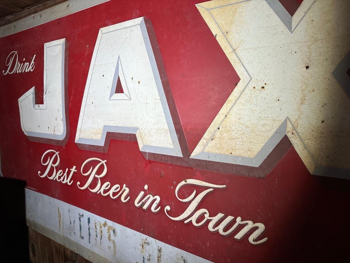 Authentic double sided vintage JAX Beer advertising sign from Jackson Brewing Company, New Orleans, Louisiana. Classic red-and-white design featuring the slogan “Drink JAX – Best Beer in Town.”