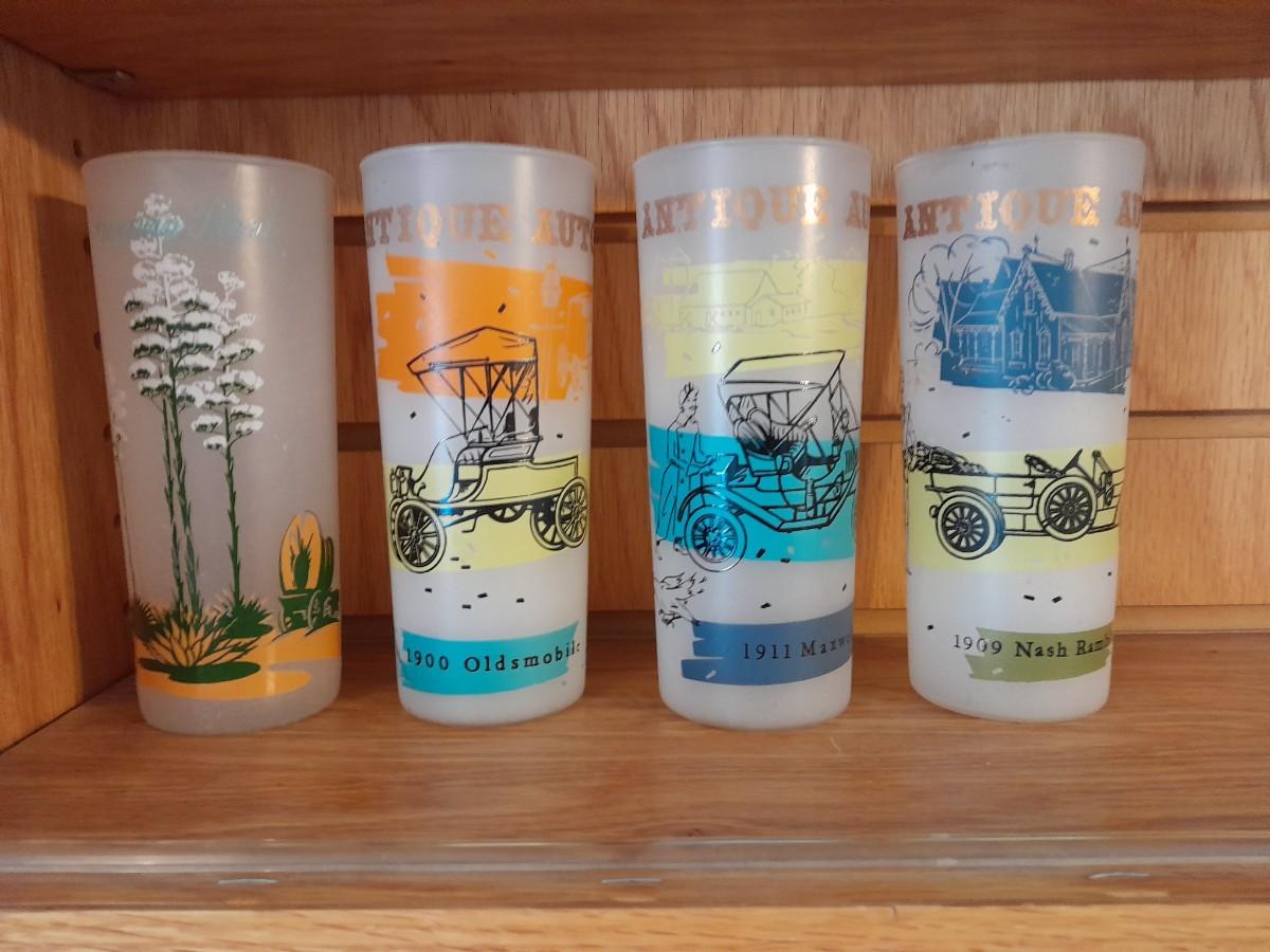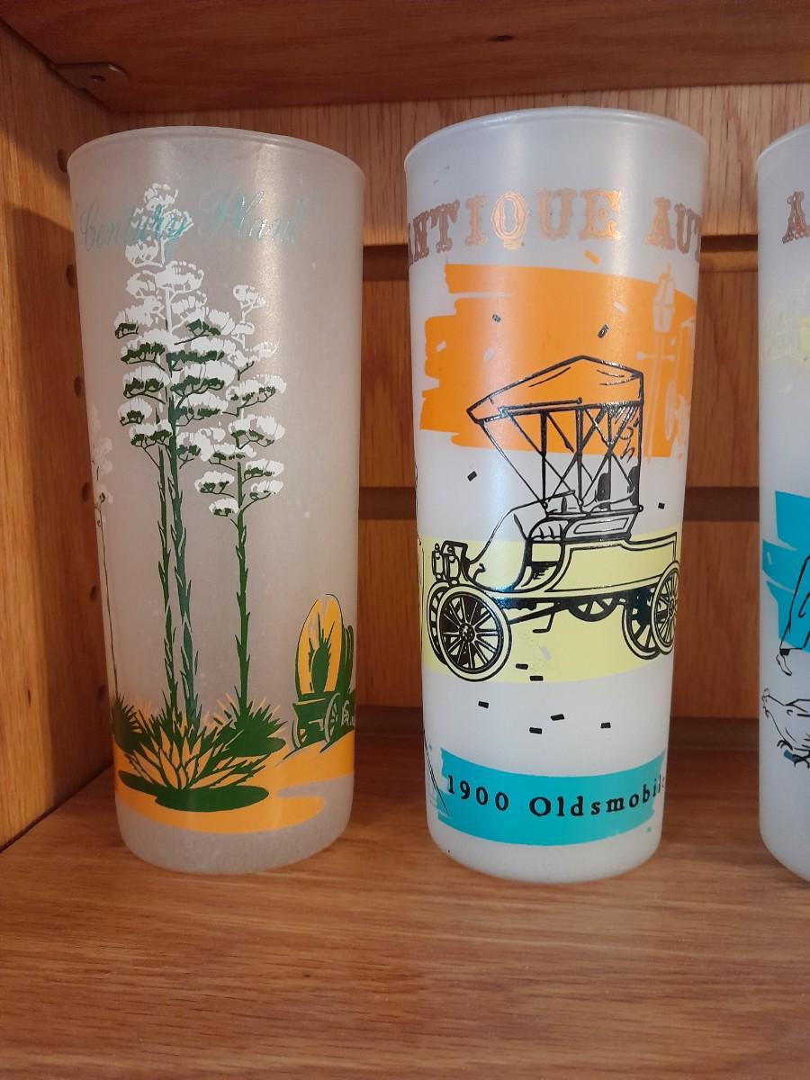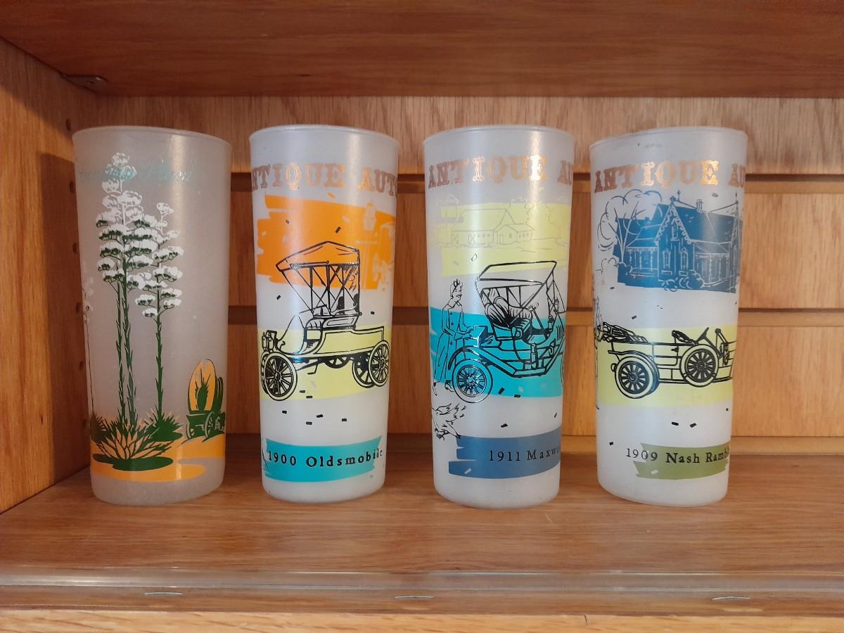 VINTAGE DRINKING GLASSES, ANTIQUE CARS AND A VINTAGE BLAKELY PREMIUM CACTUS FROSTED TUMBLER