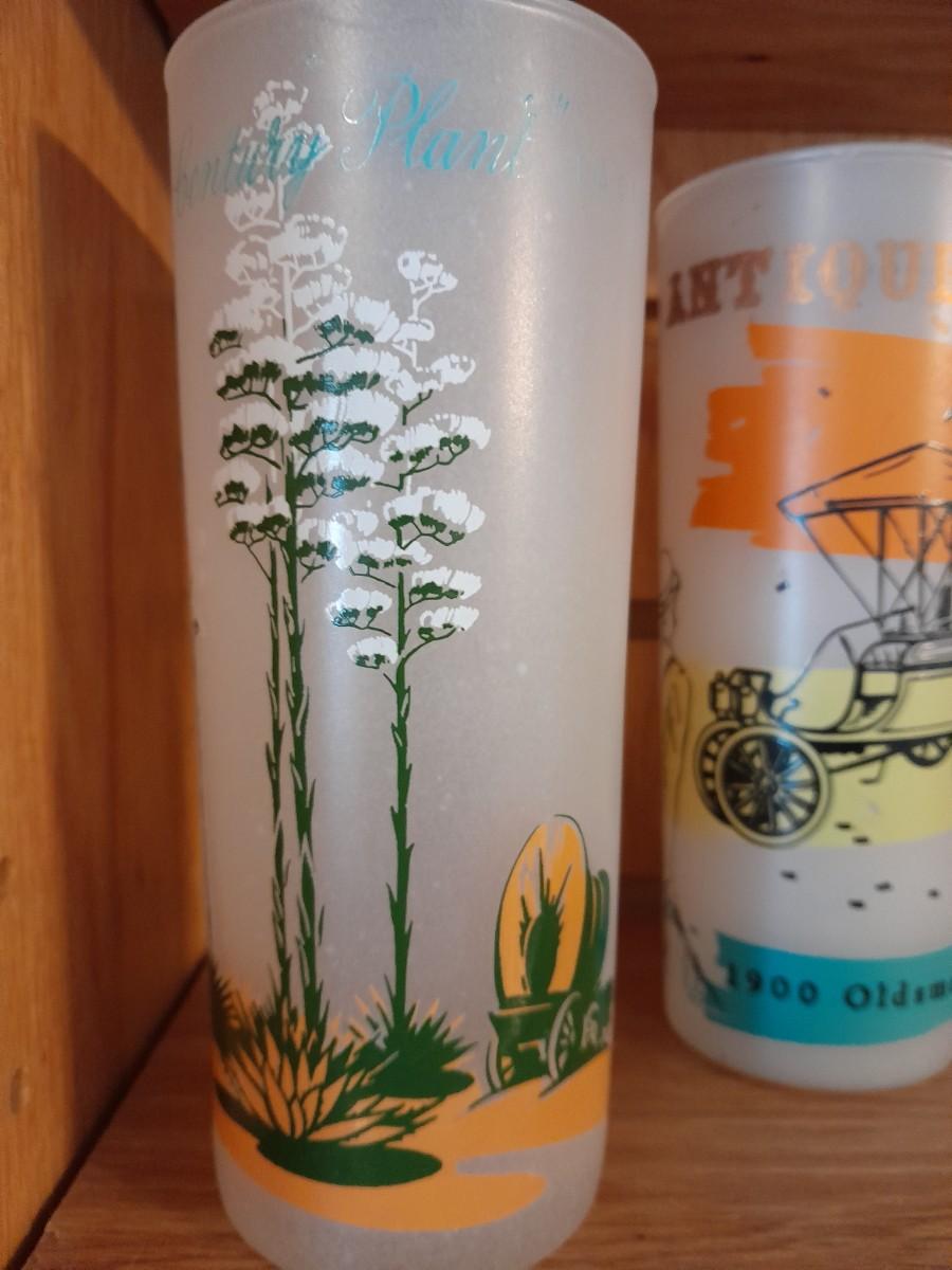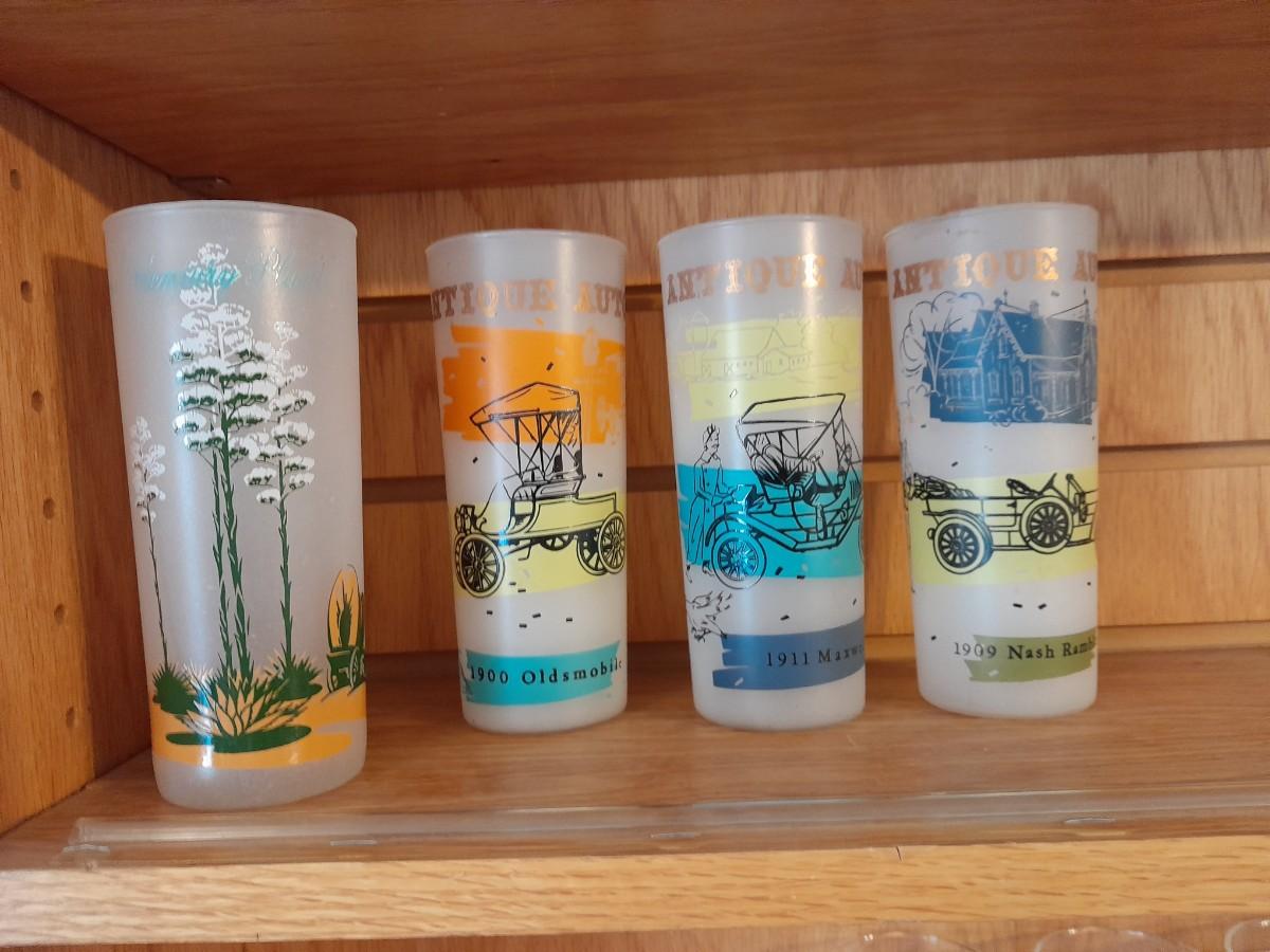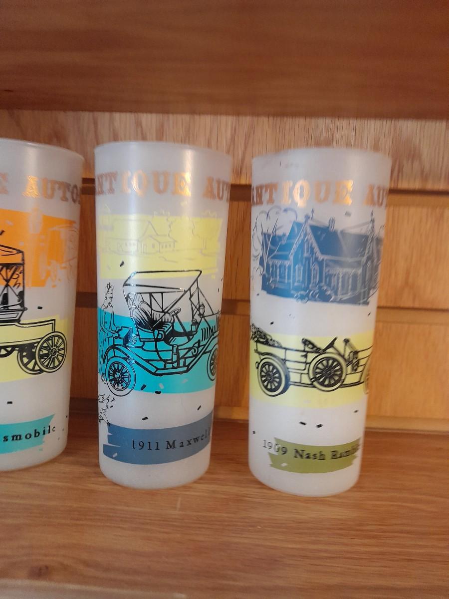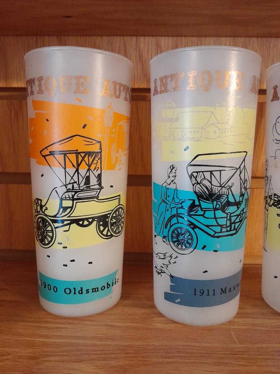 VINTAGE DRINKING GLASSES, ANTIQUE CARS AND A VINTAGE BLAKELY PREMIUM CACTUS FROSTED TUMBLER