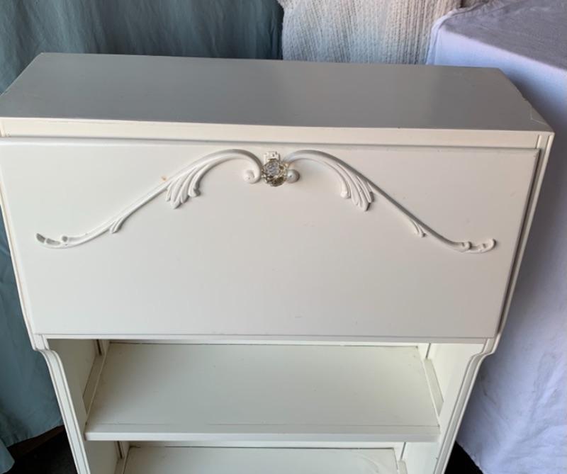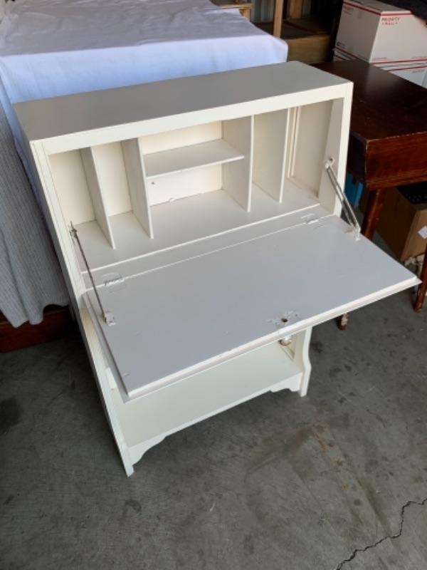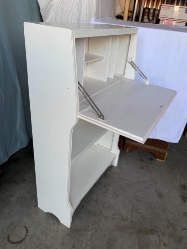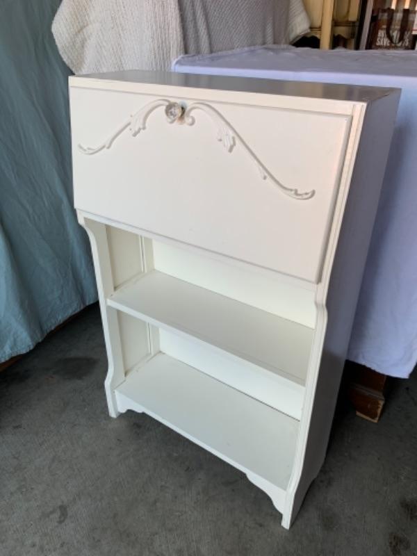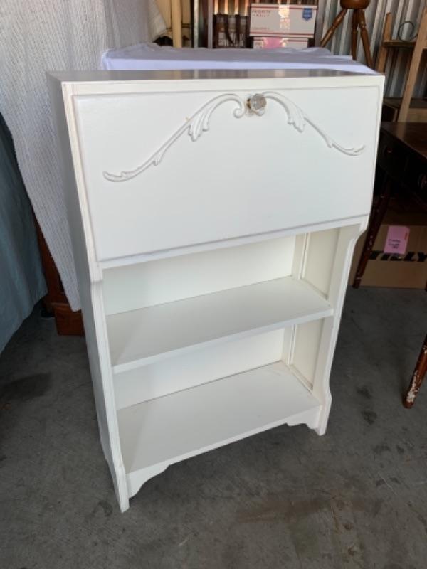 Solid wood with drop front. Storage cubbies inside and book shelves below. Excellent vintage condition with typical surface wear. 24” x 9” x .28.”