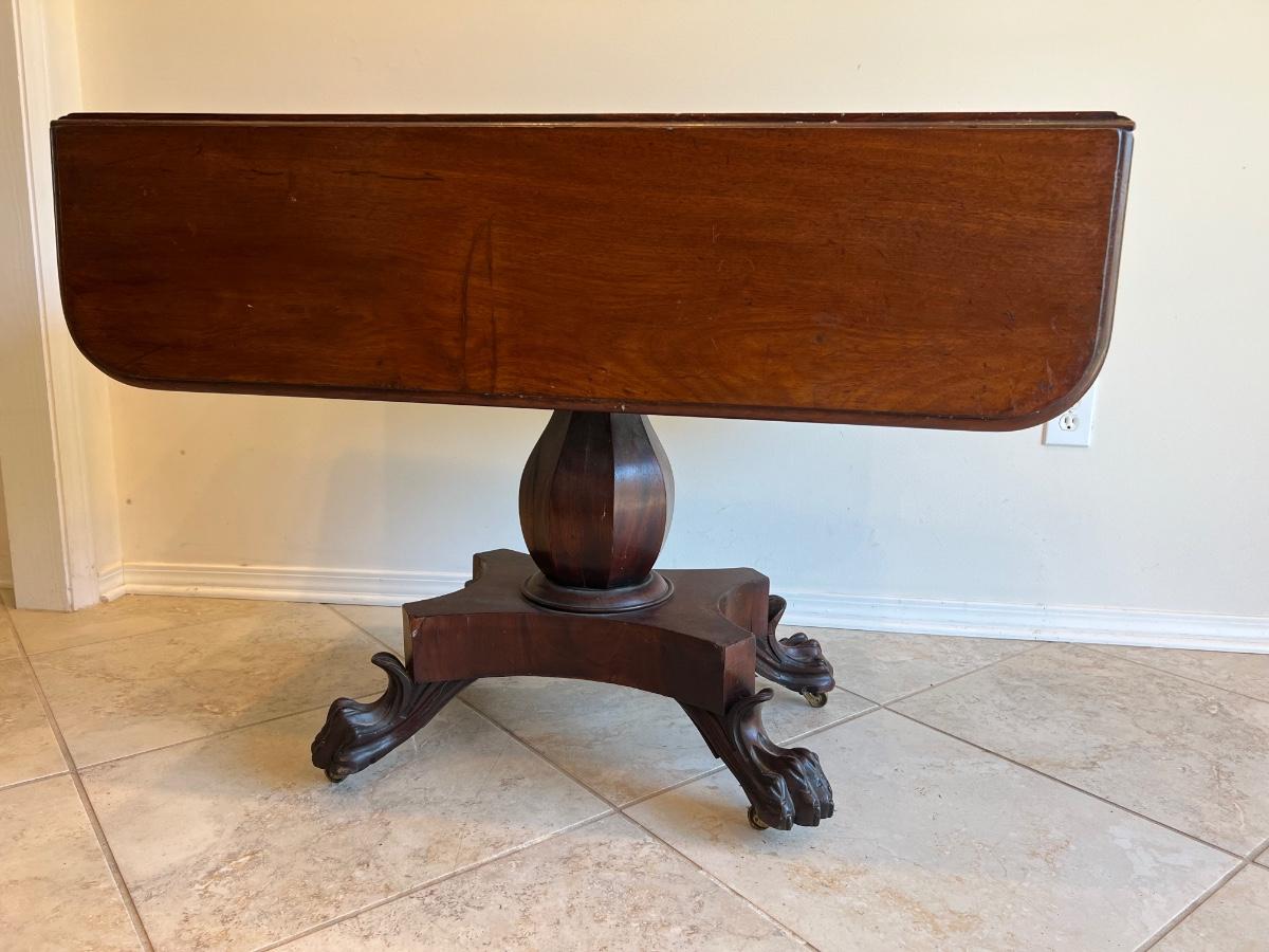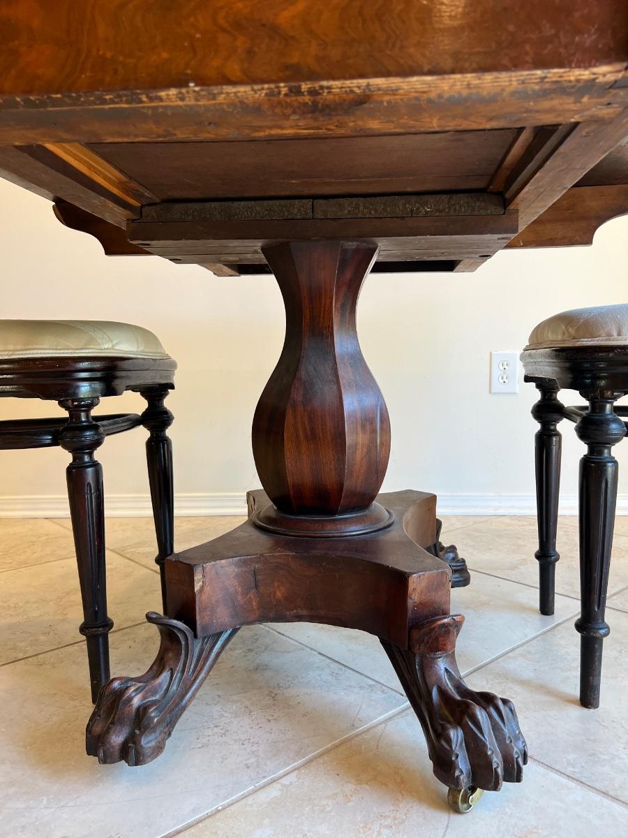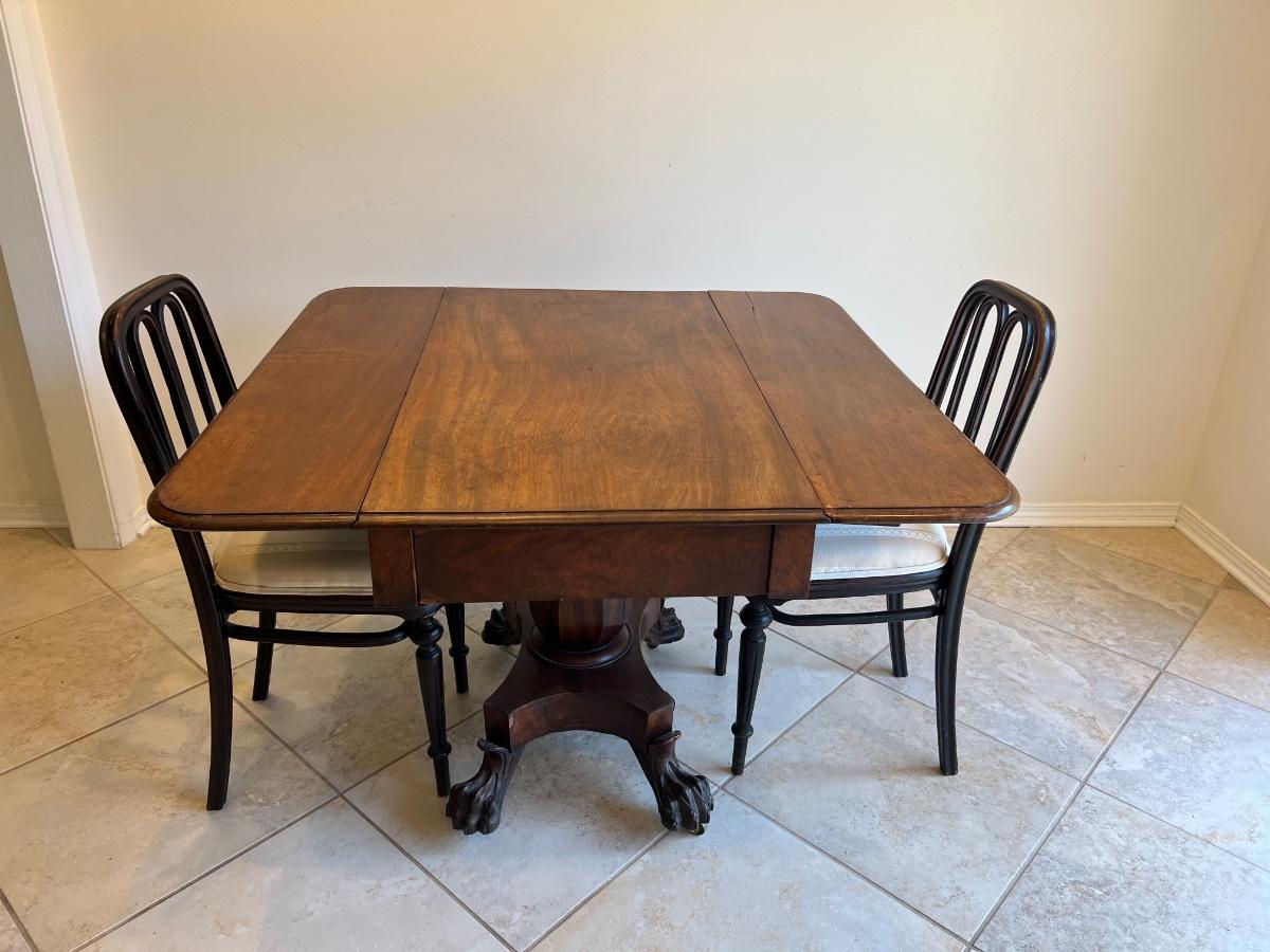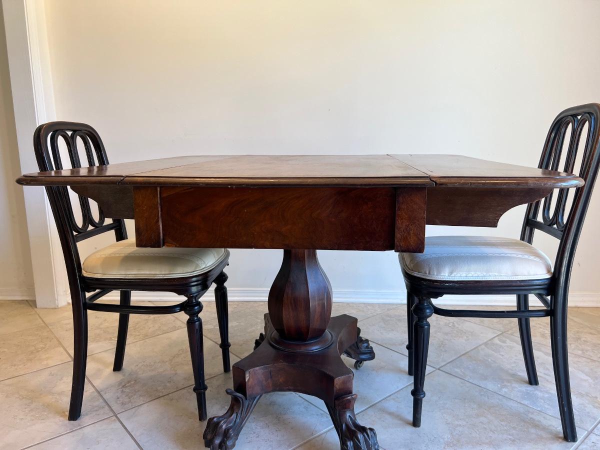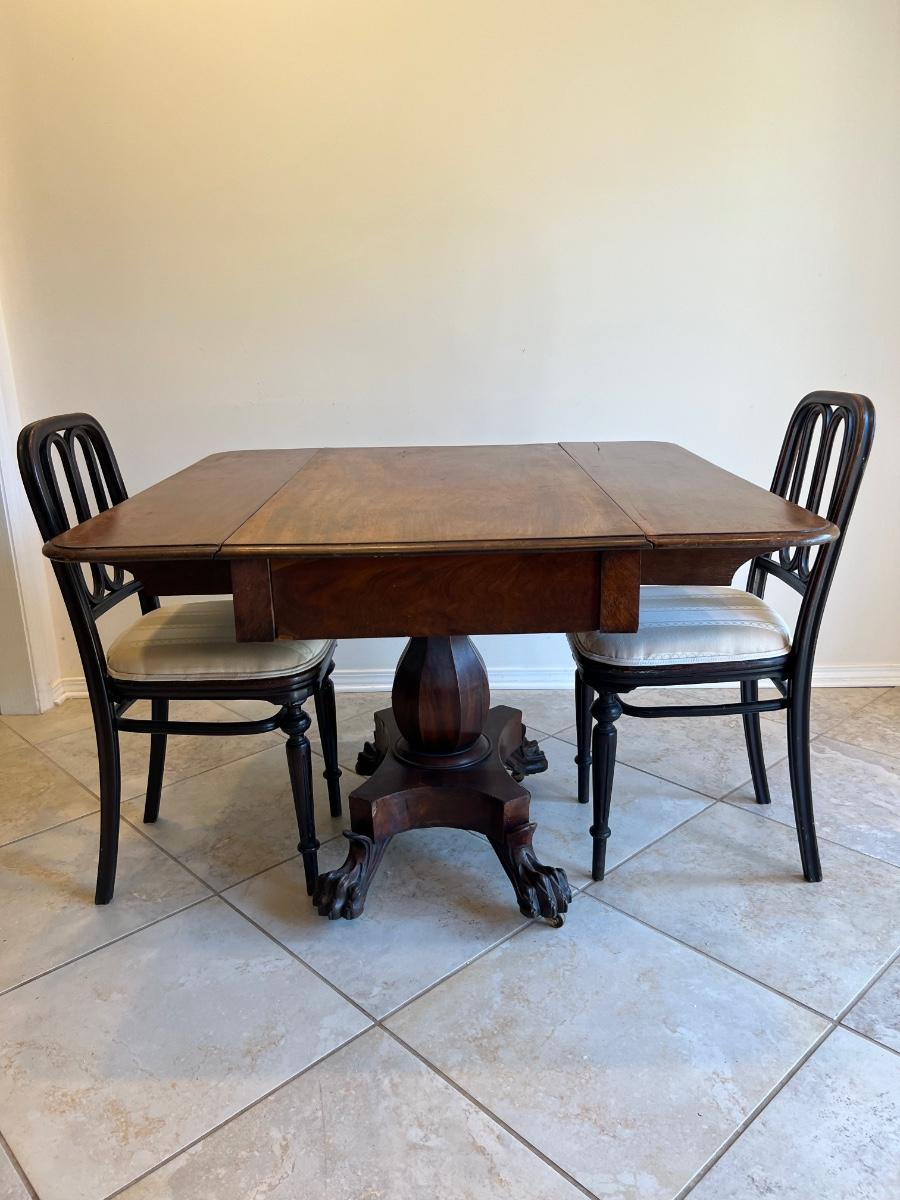 Vintage Mahogany (?) Drop Leaf Table and two chairs. Table is solid wood and has gold casters under the claw feet. Table Measures 44 inches wide, 41 inches deep and 30 1/2 inches tall. Chairs measure 36 inches tall, floor to seat measures 20 inches. Seat measures 16 1/2 inches wide and 17 inches deep. Some minor imperfections as pictured.