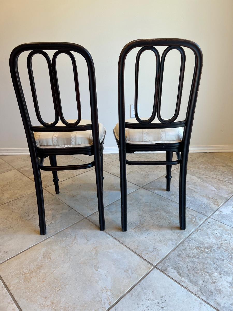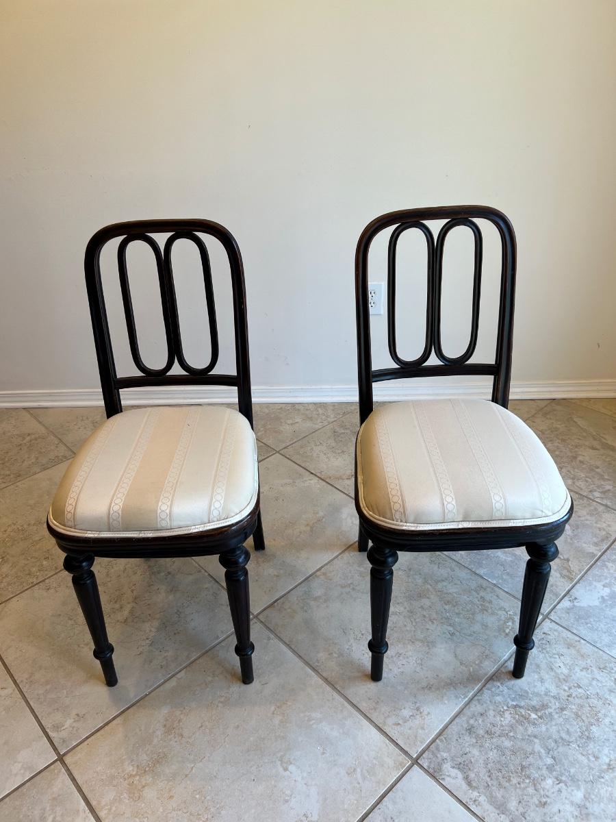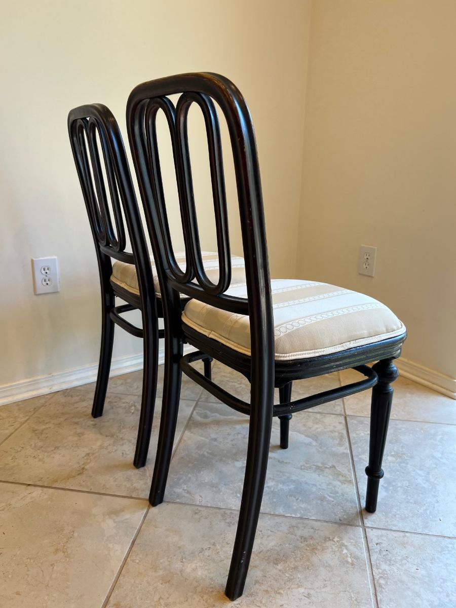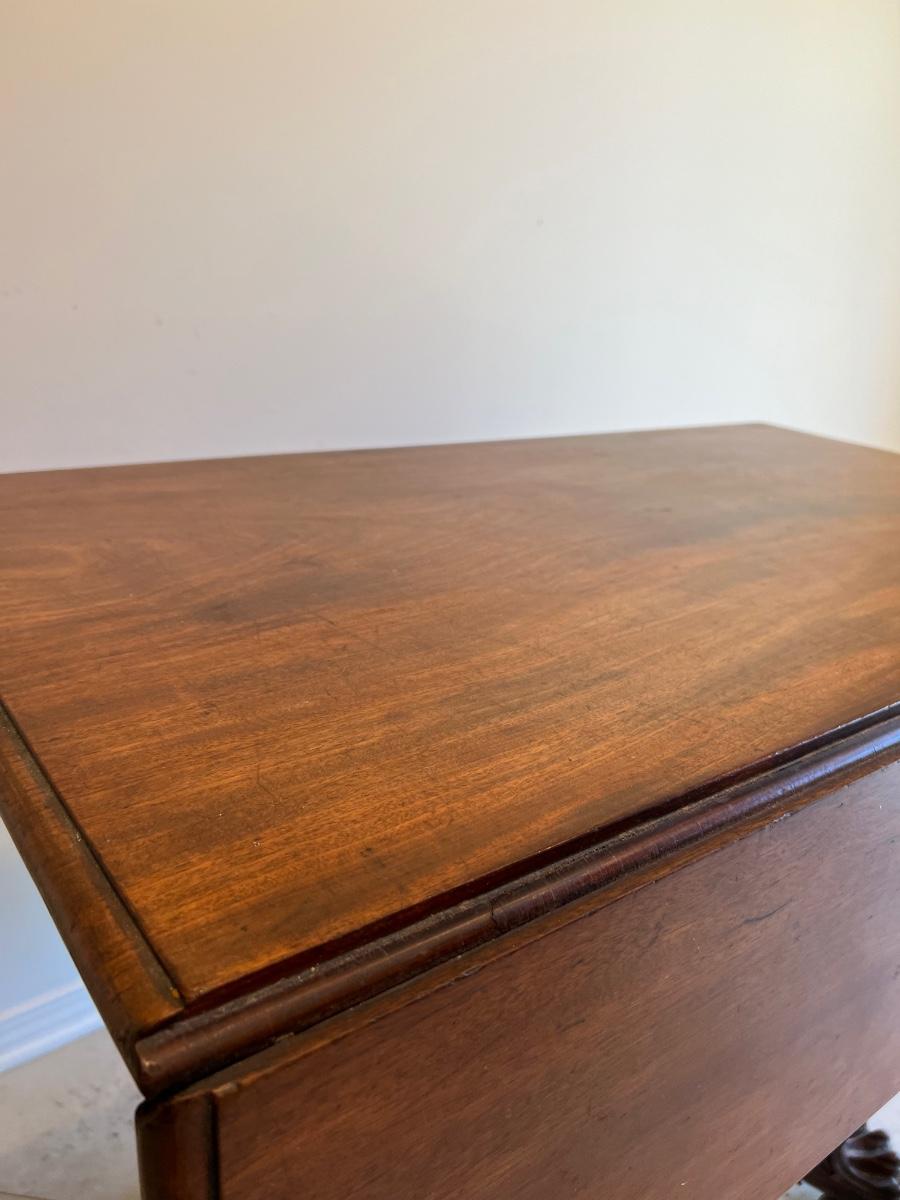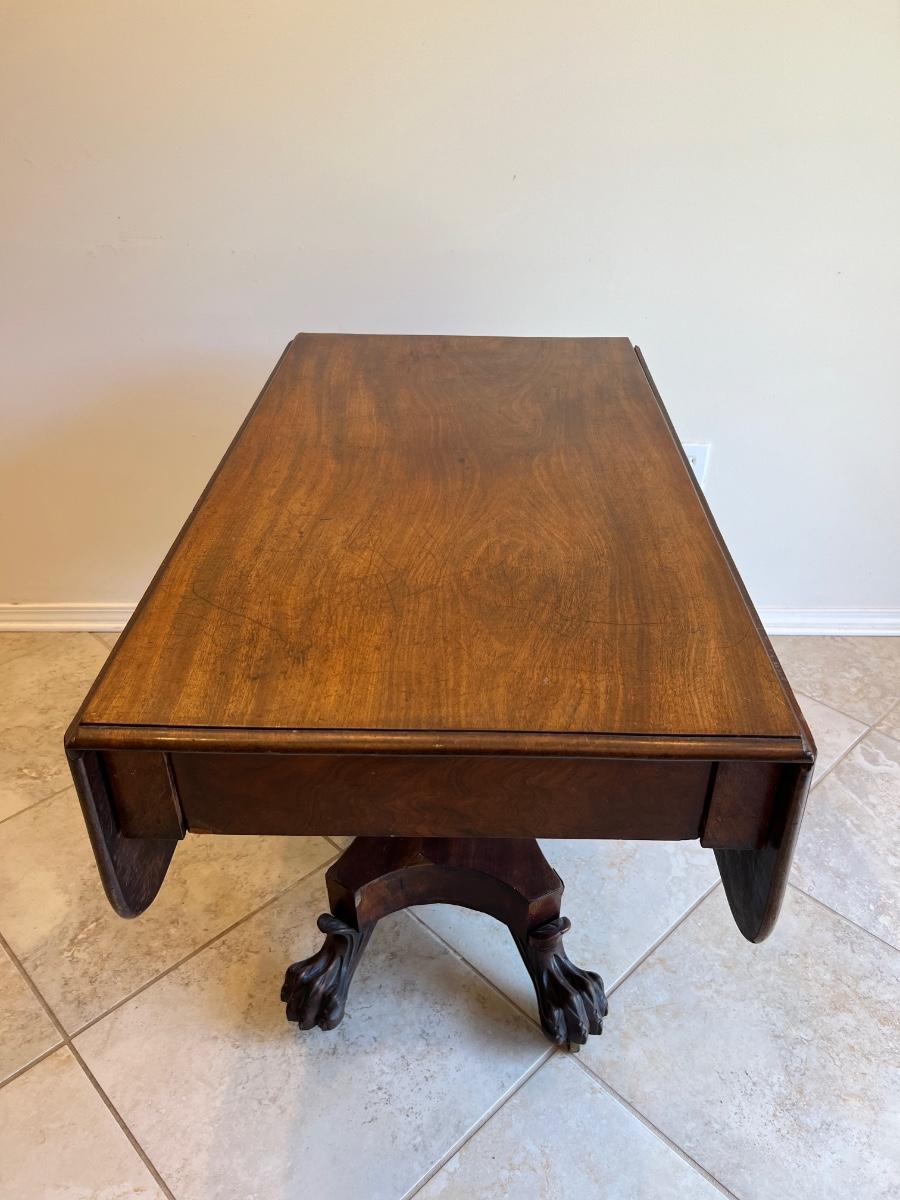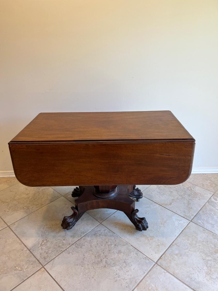 Vintage Mahogany (?) Drop Leaf Table and two chairs. Table is solid wood and has gold casters under the claw feet. Table Measures 44 inches wide, 41 inches deep and 30 1/2 inches tall. Chairs measure 36 inches tall, floor to seat measures 20 inches. Seat measures 16 1/2 inches wide and 17 inches deep. Some minor imperfections as pictured.