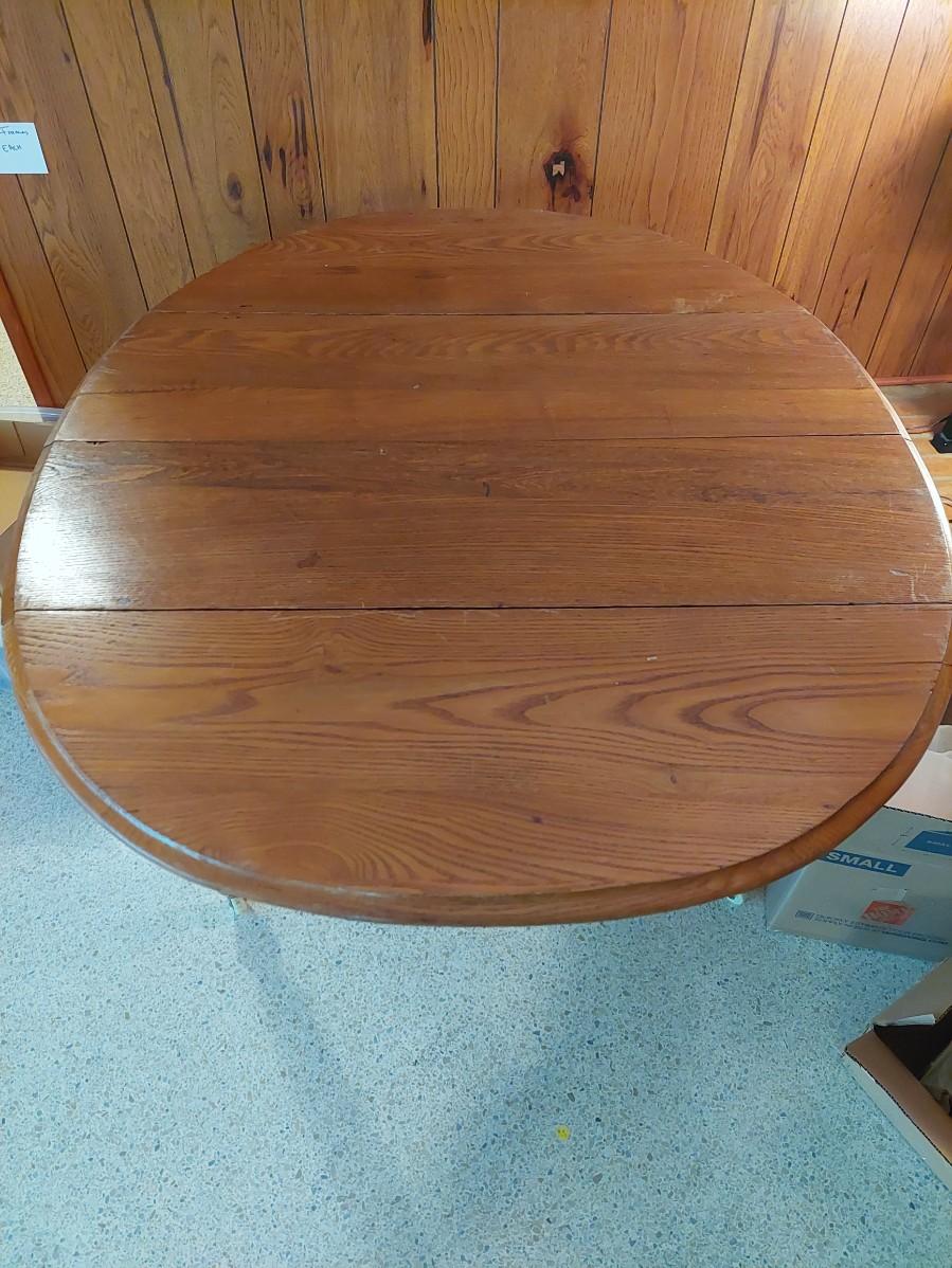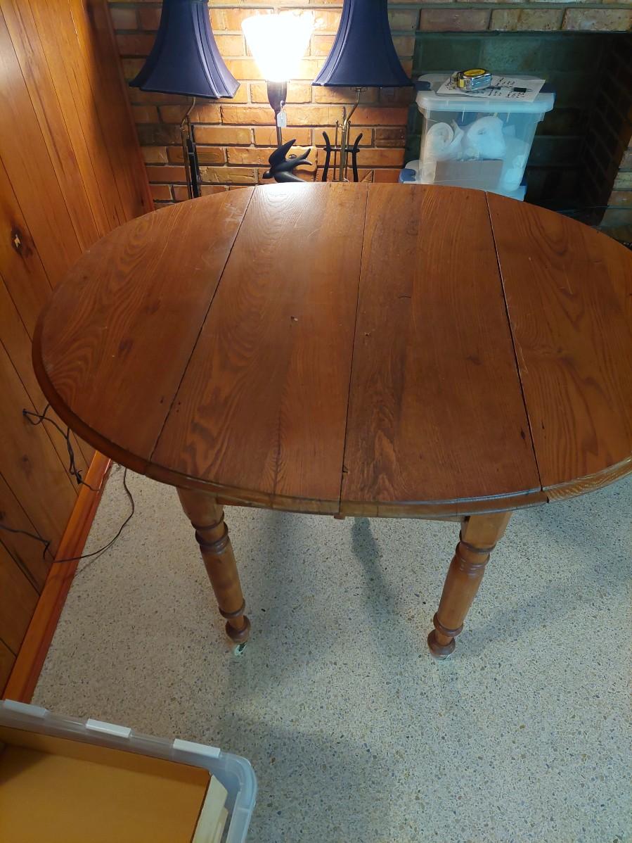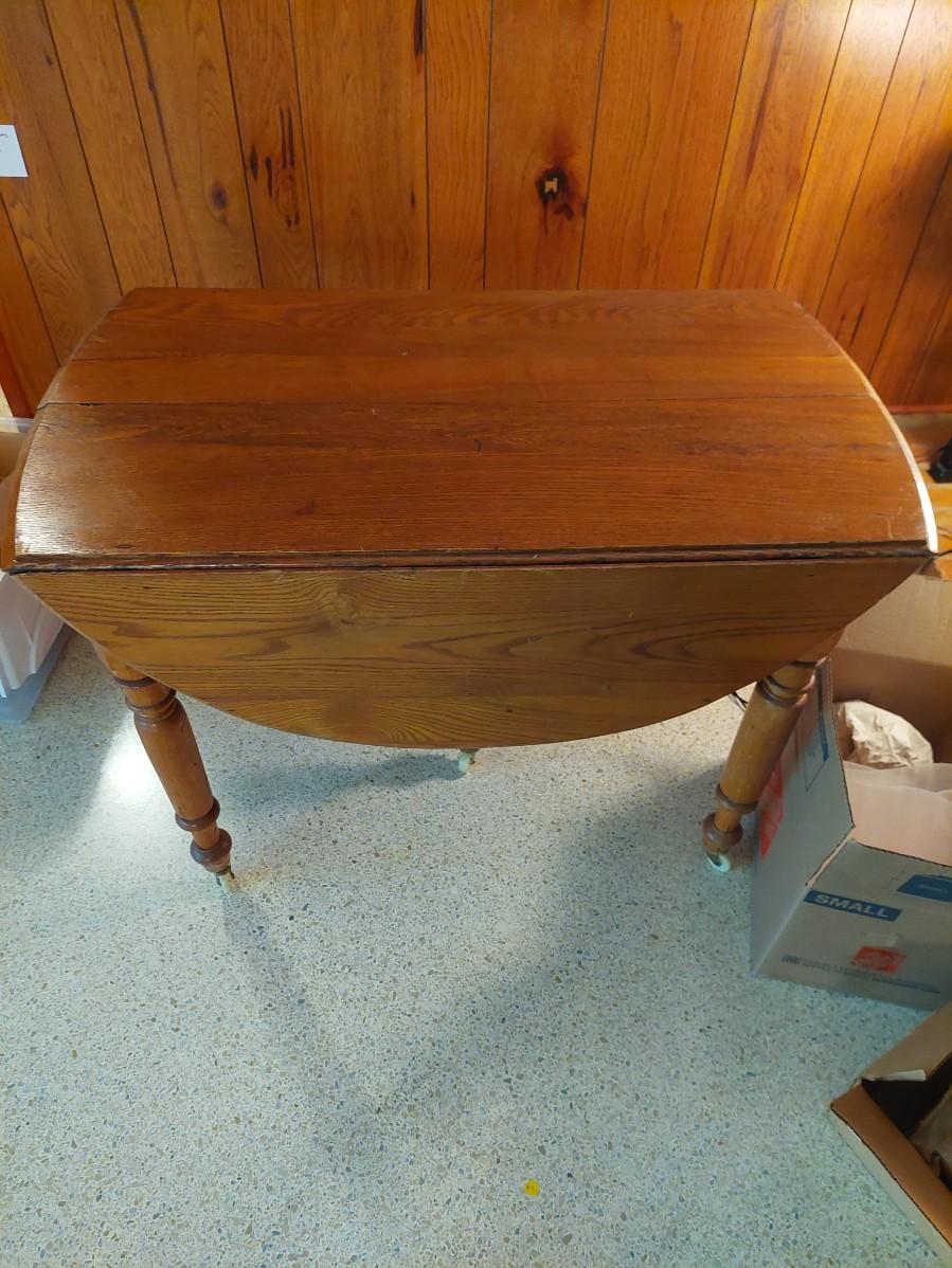 A great all wood table with both sides are a drop leaf it is also on wheels. Dimensions open are 29" tall 50" length & 42" width