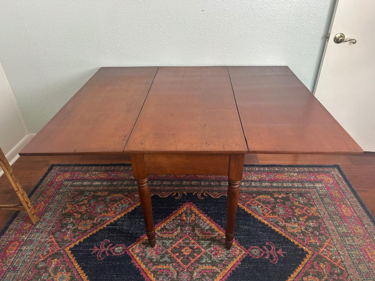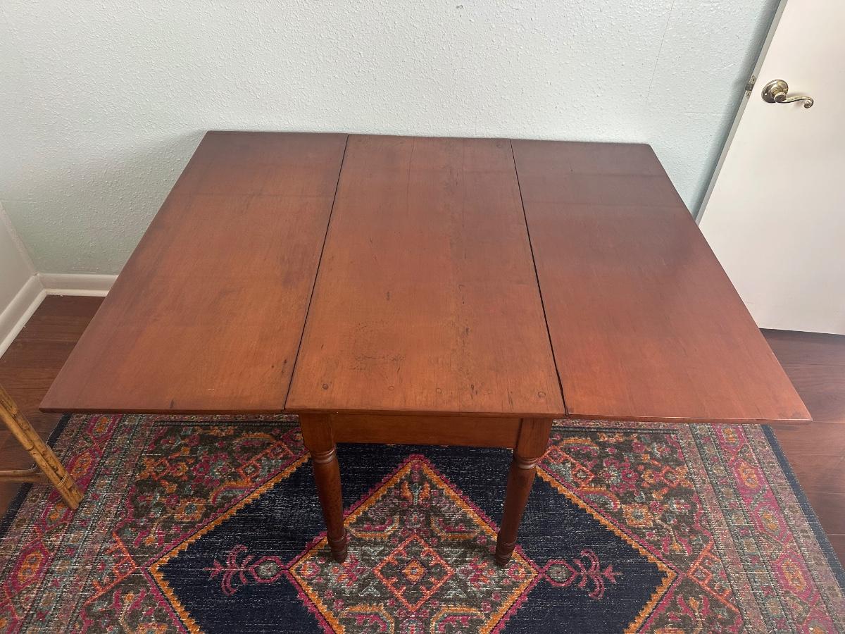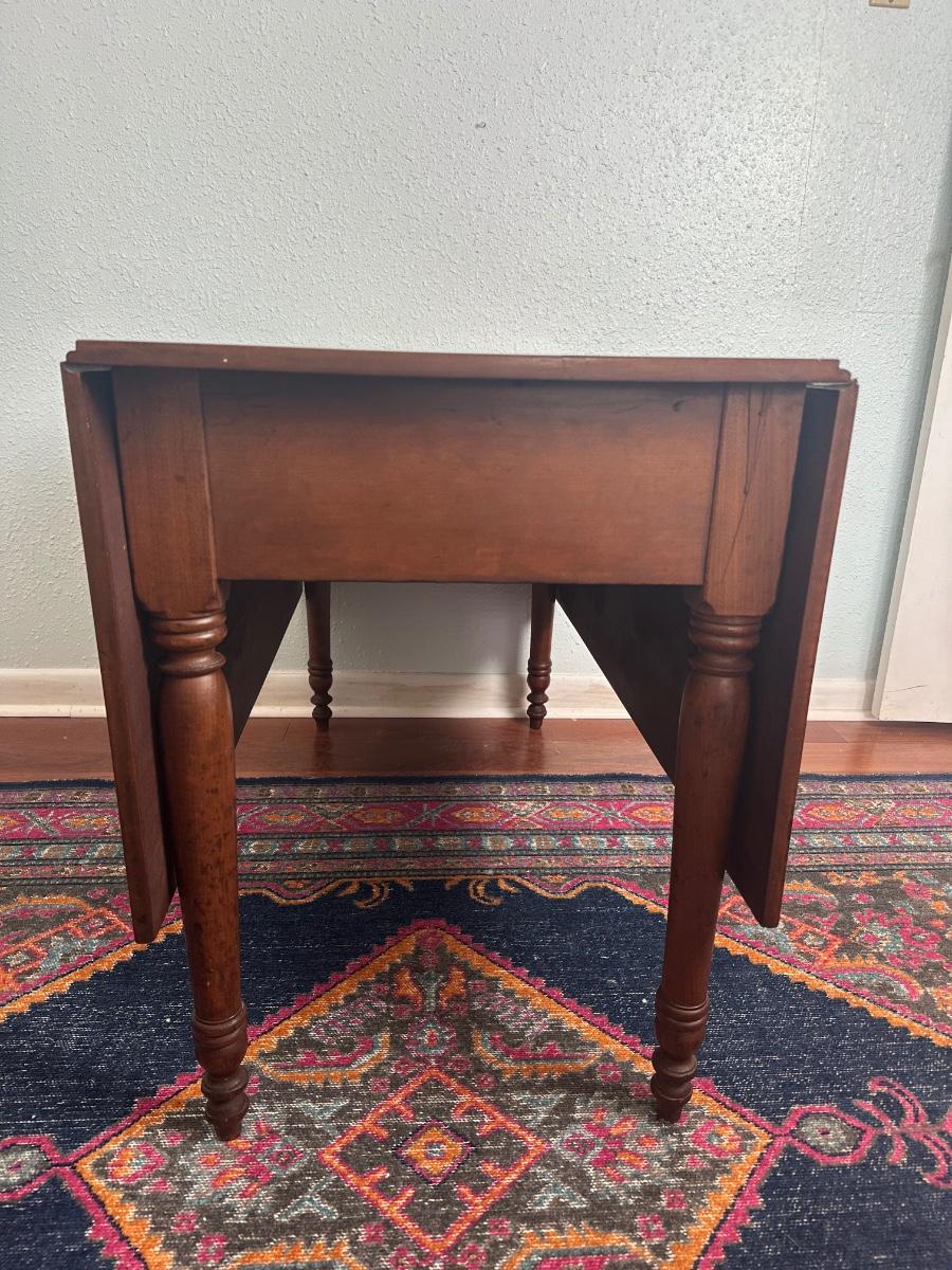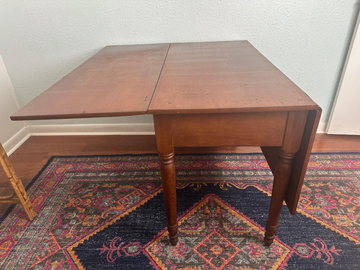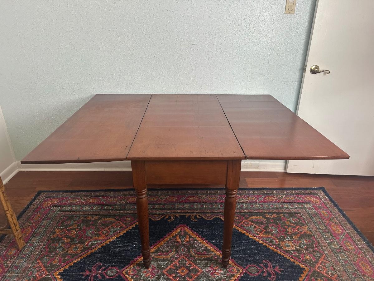 Vintage drop-leaf table with solid wood top and turned legs. Features two folding leaves for expanded surface when needed. Surface shows natural wood grain variation and wear consistent with age and use. Sturdy and functional, great as a small dining table or occasional table.