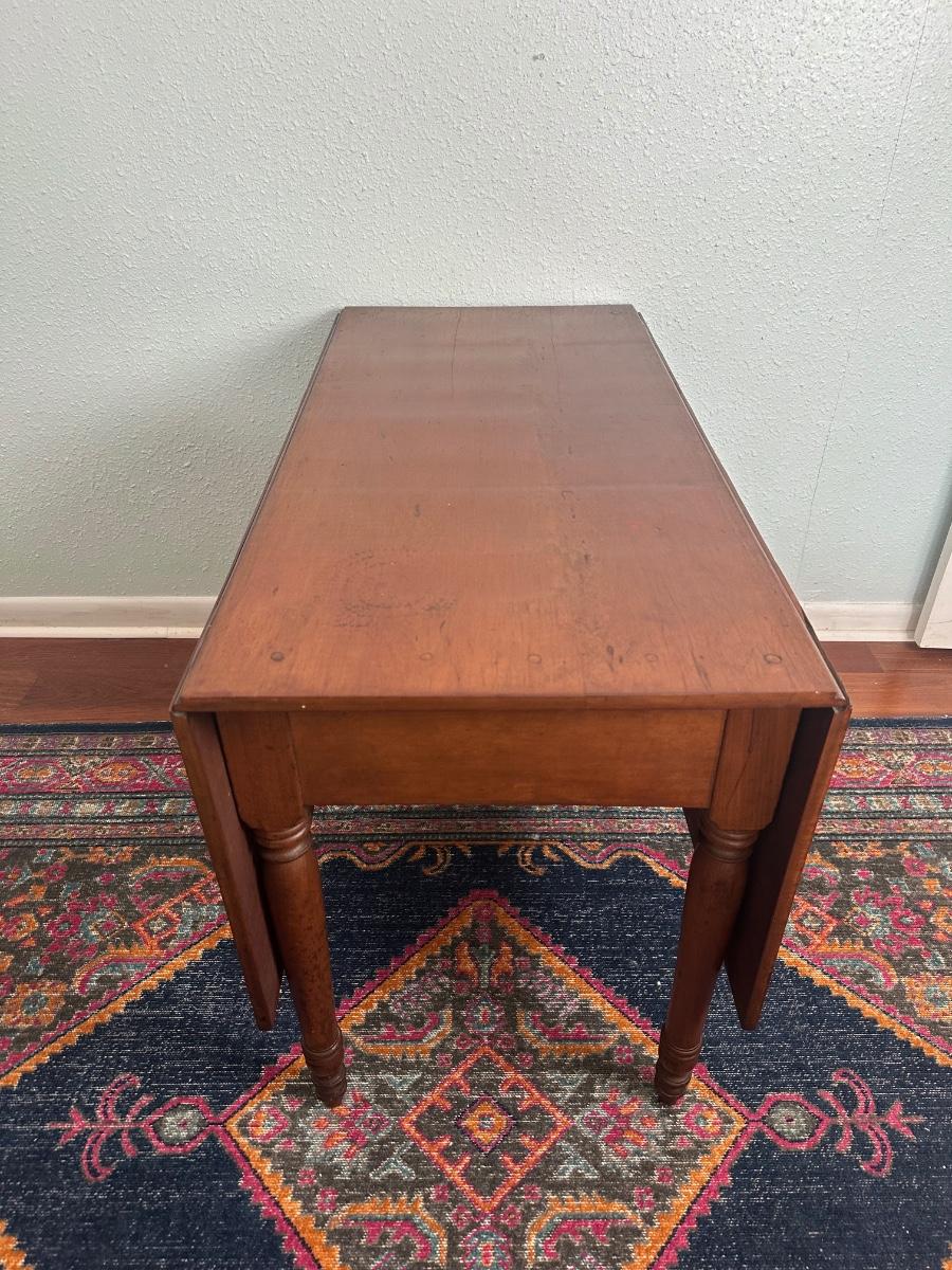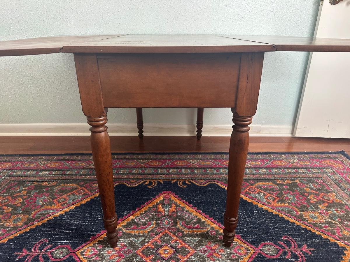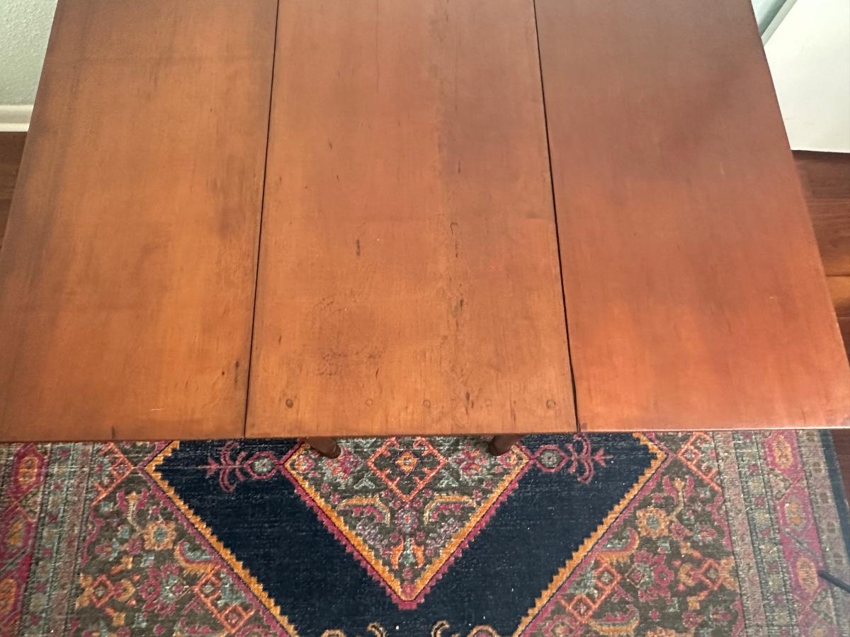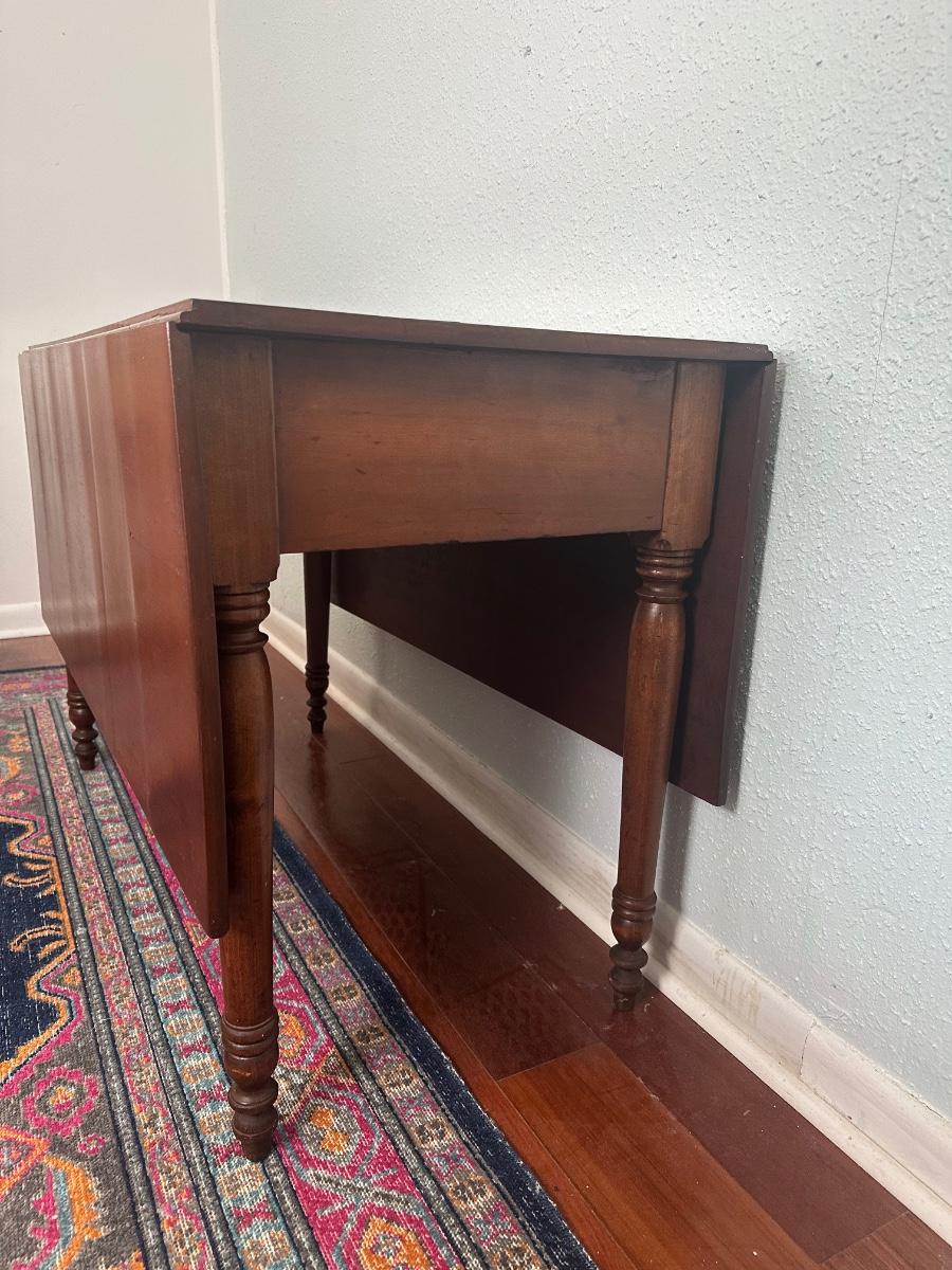 Vintage drop-leaf table with solid wood top and turned legs. Features two folding leaves for expanded surface when needed. Surface shows natural wood grain variation and wear consistent with age and use. Sturdy and functional, great as a small dining table or occasional table.