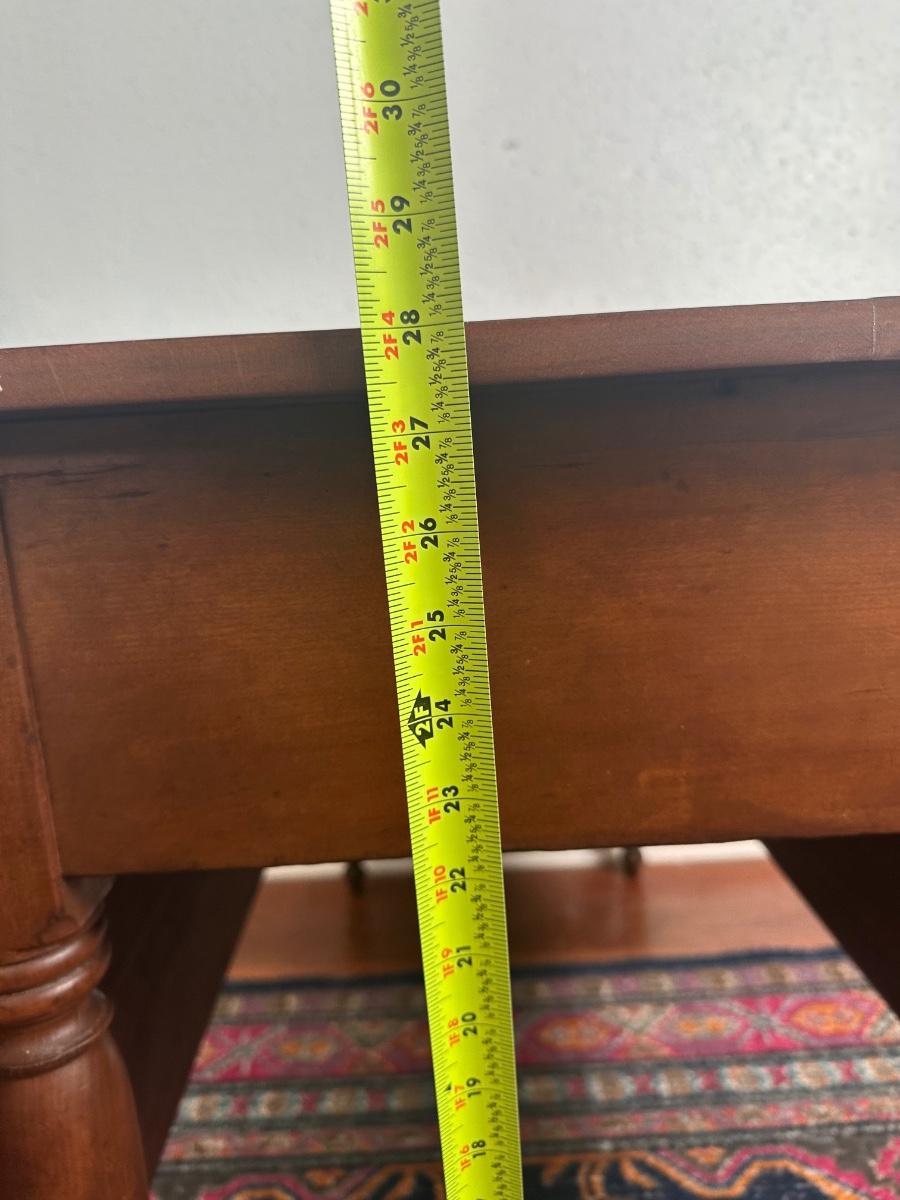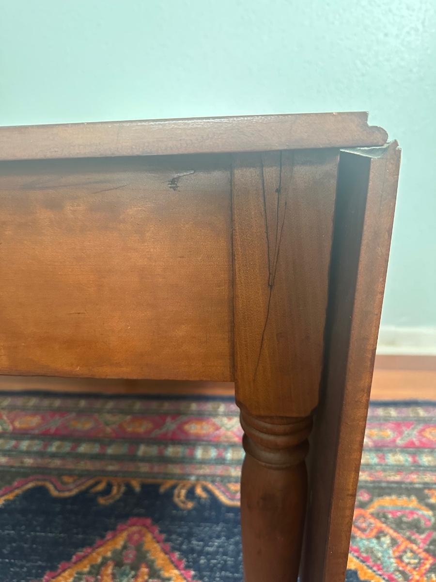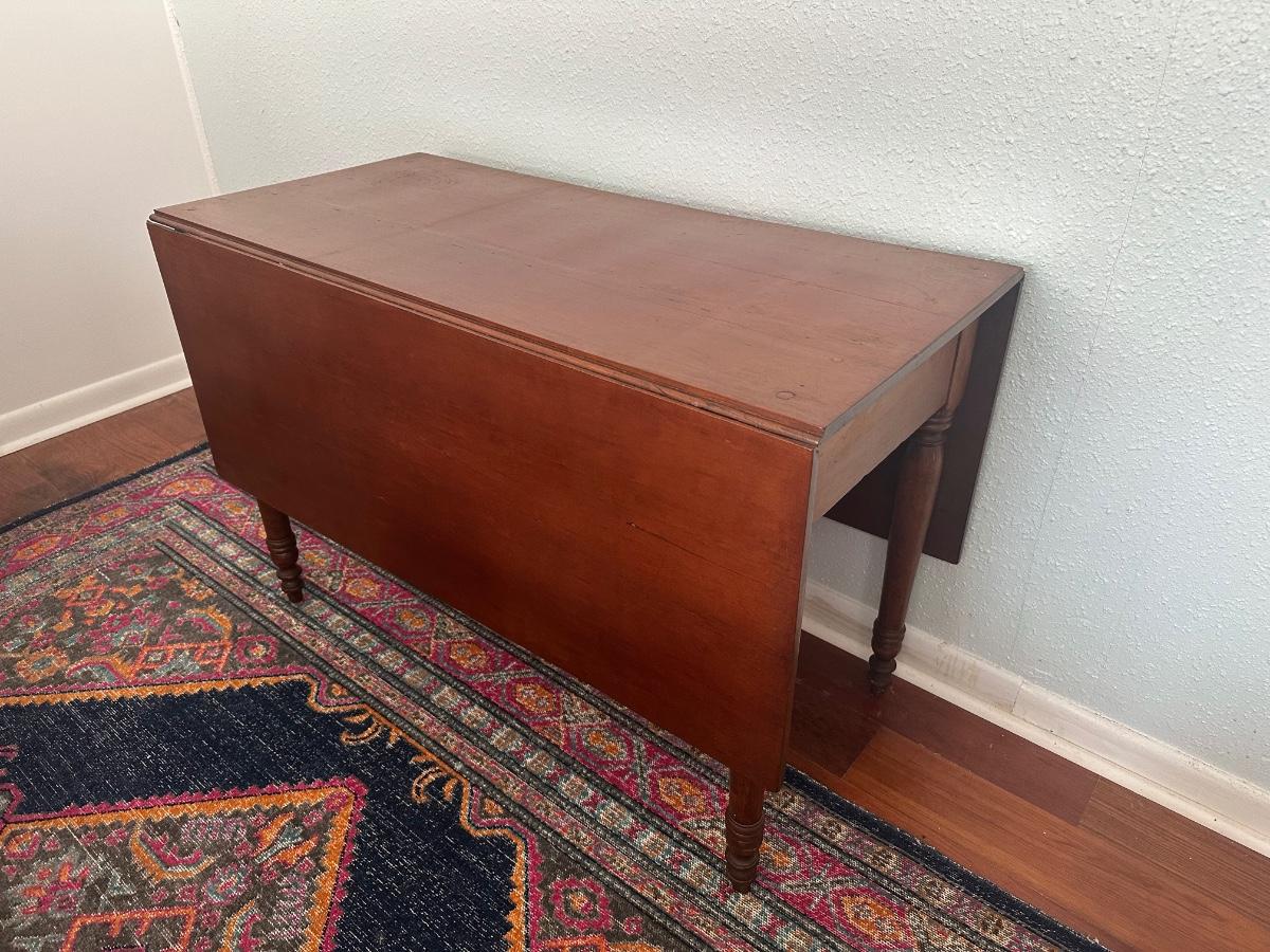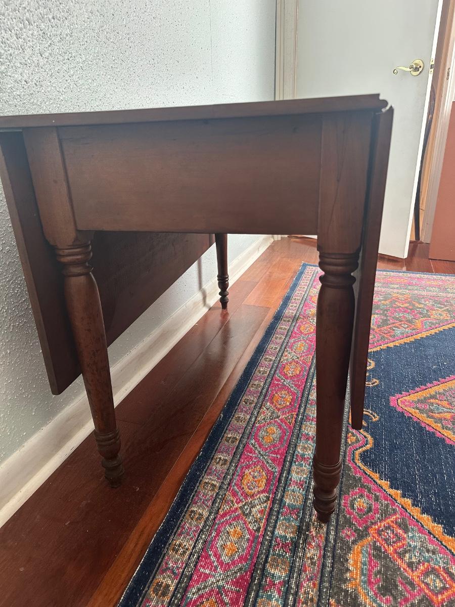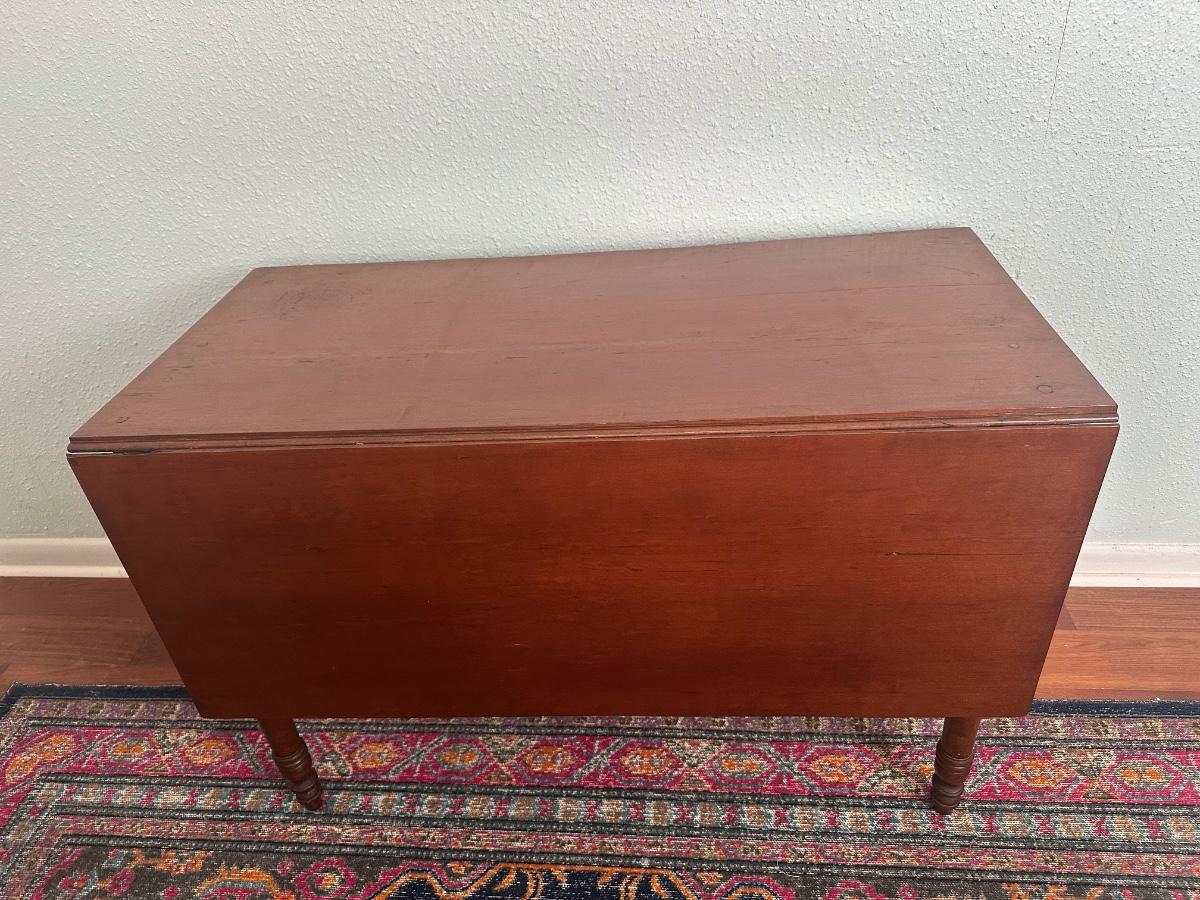 Vintage drop-leaf table with solid wood top and turned legs. Features two folding leaves for expanded surface when needed. Surface shows natural wood grain variation and wear consistent with age and use. Sturdy and functional, great as a small dining table or occasional table.