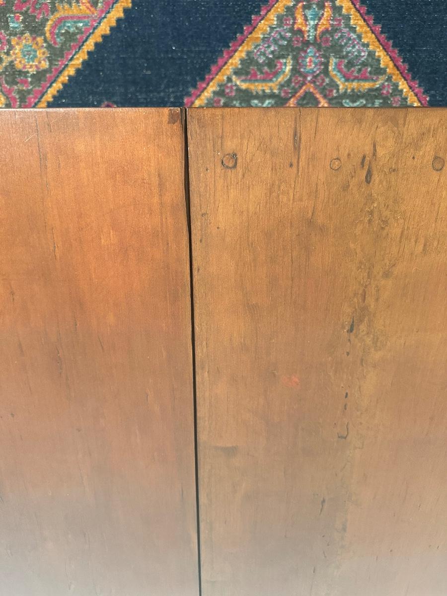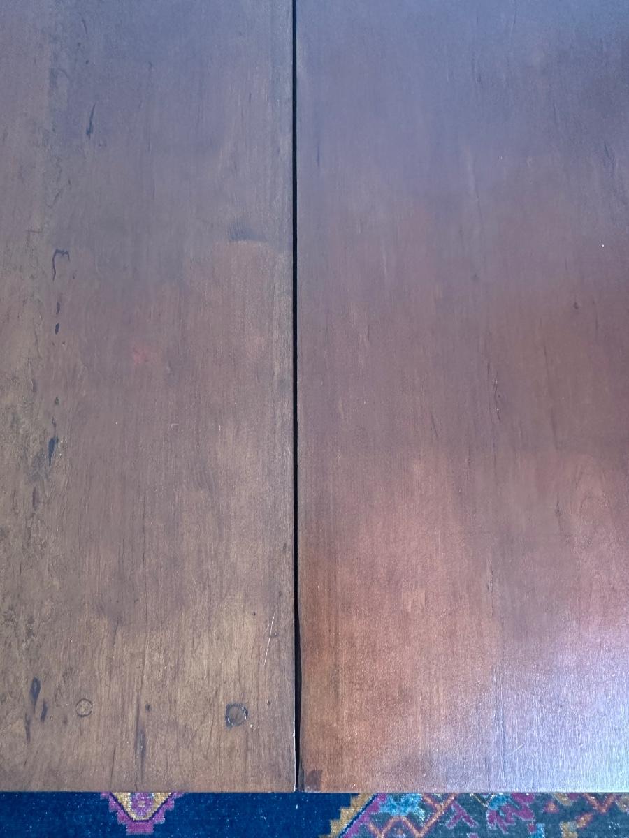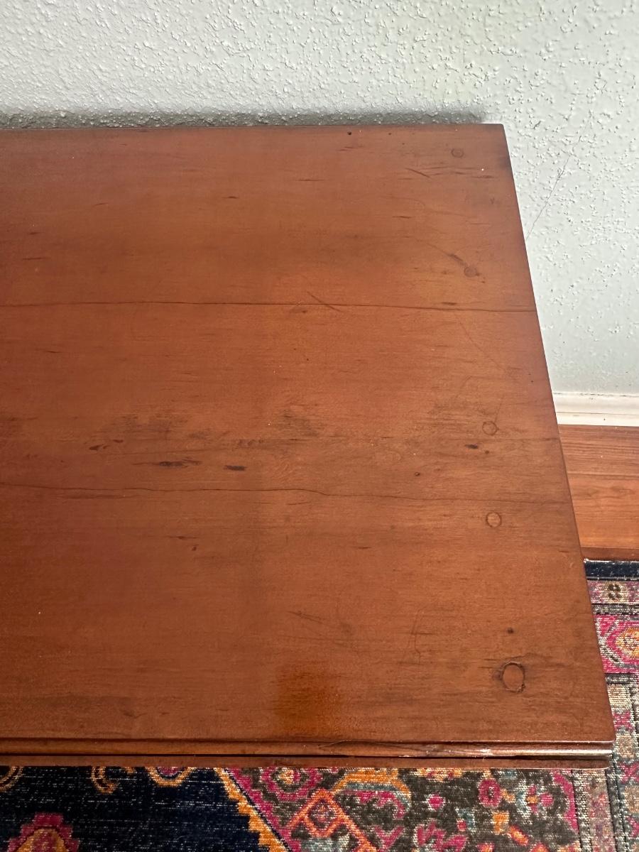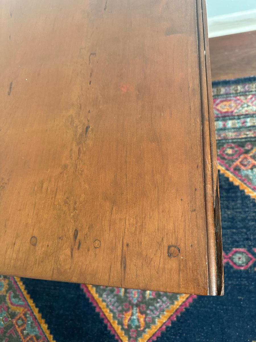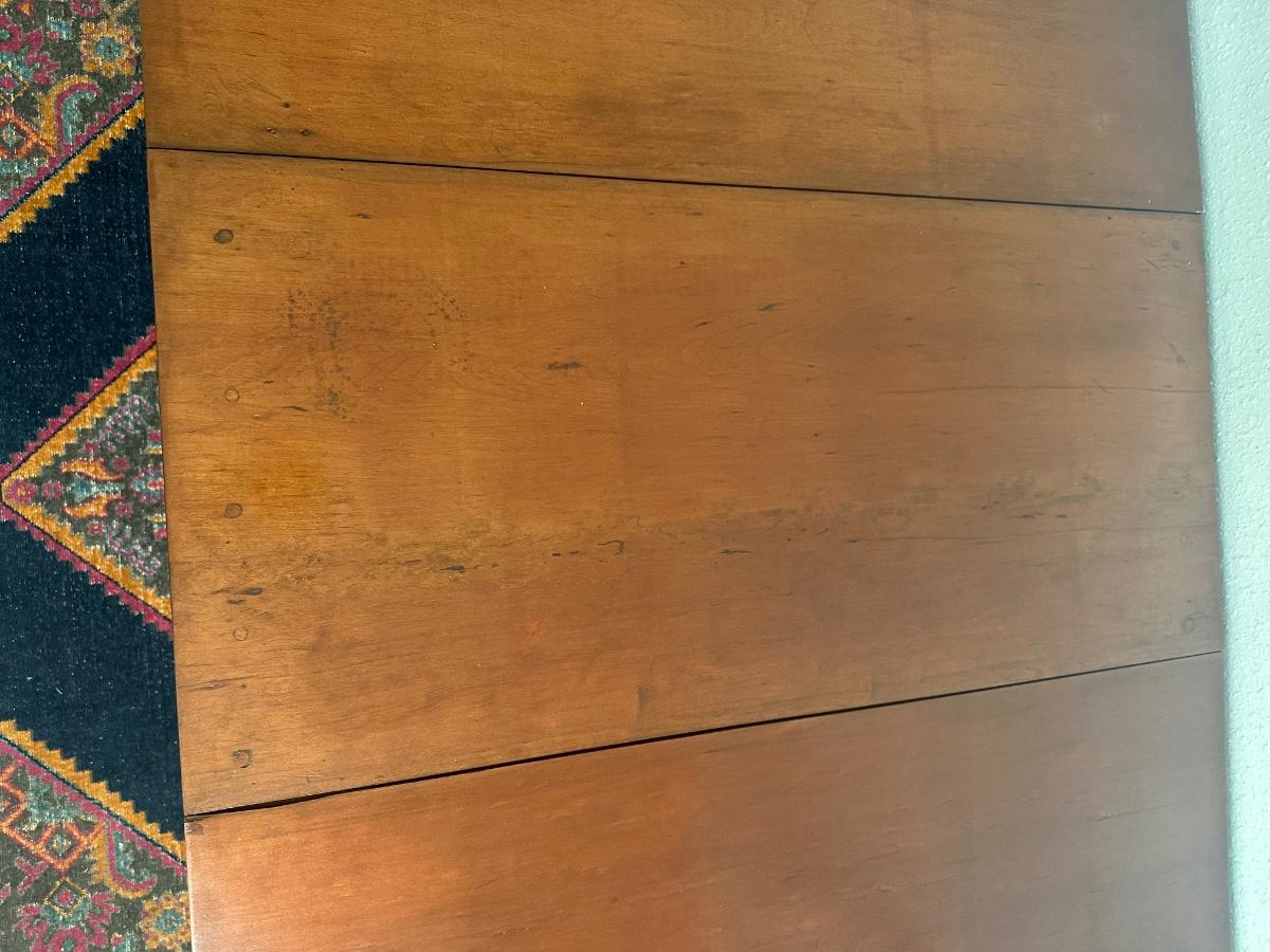 Vintage drop-leaf table with solid wood top and turned legs. Features two folding leaves for expanded surface when needed. Surface shows natural wood grain variation and wear consistent with age and use. Sturdy and functional, great as a small dining table or occasional table.