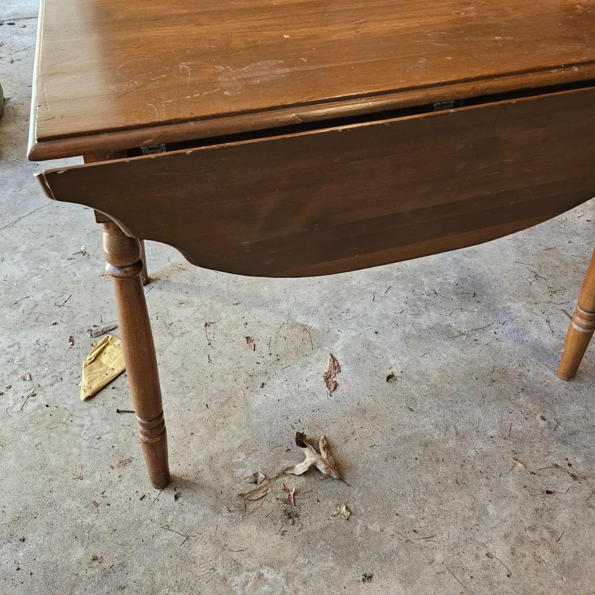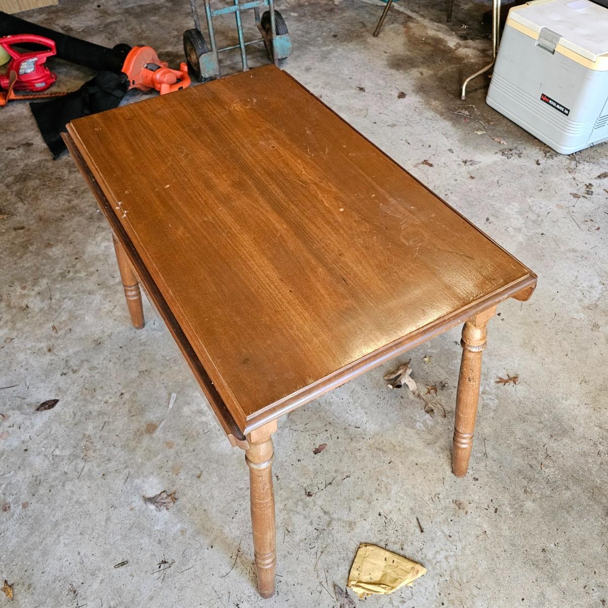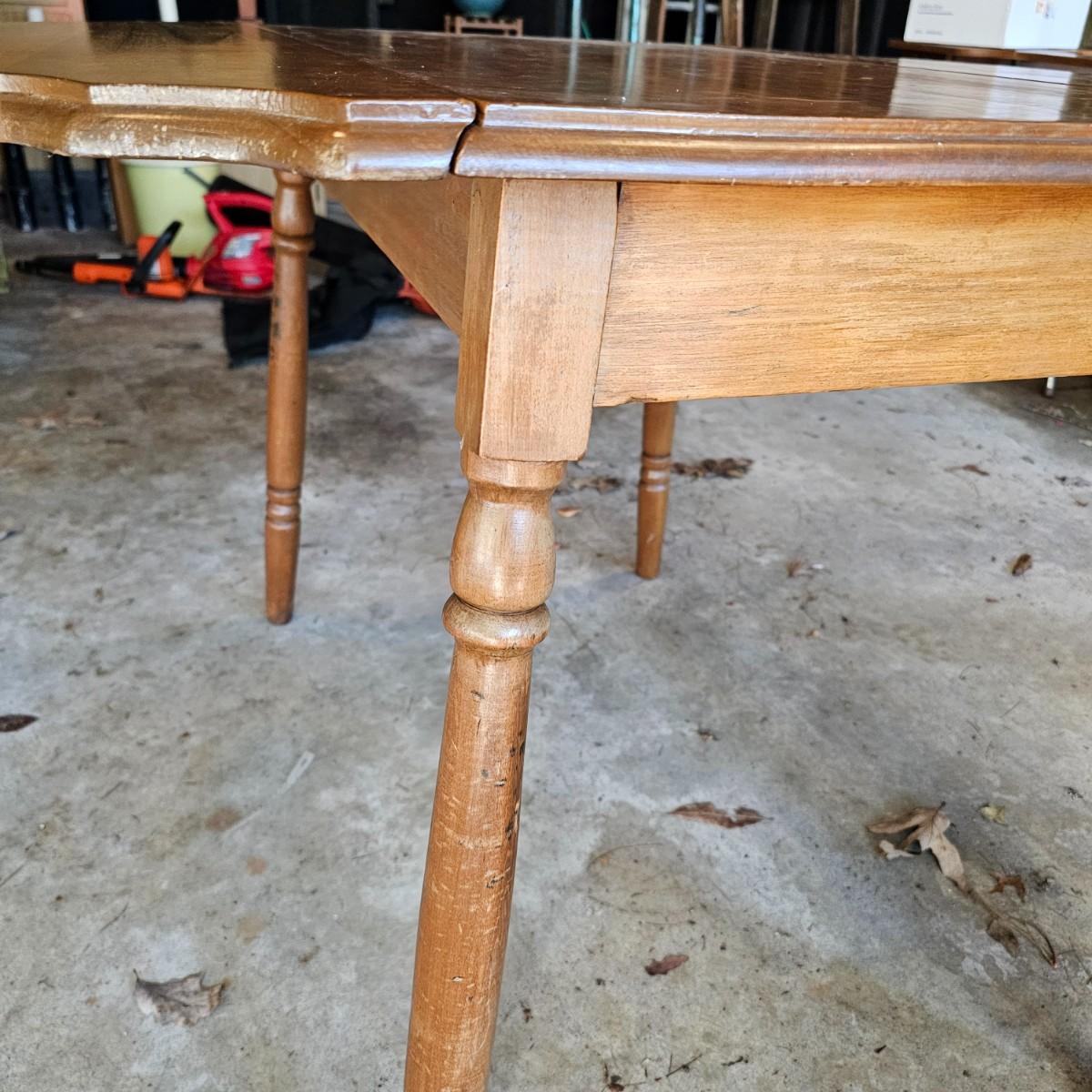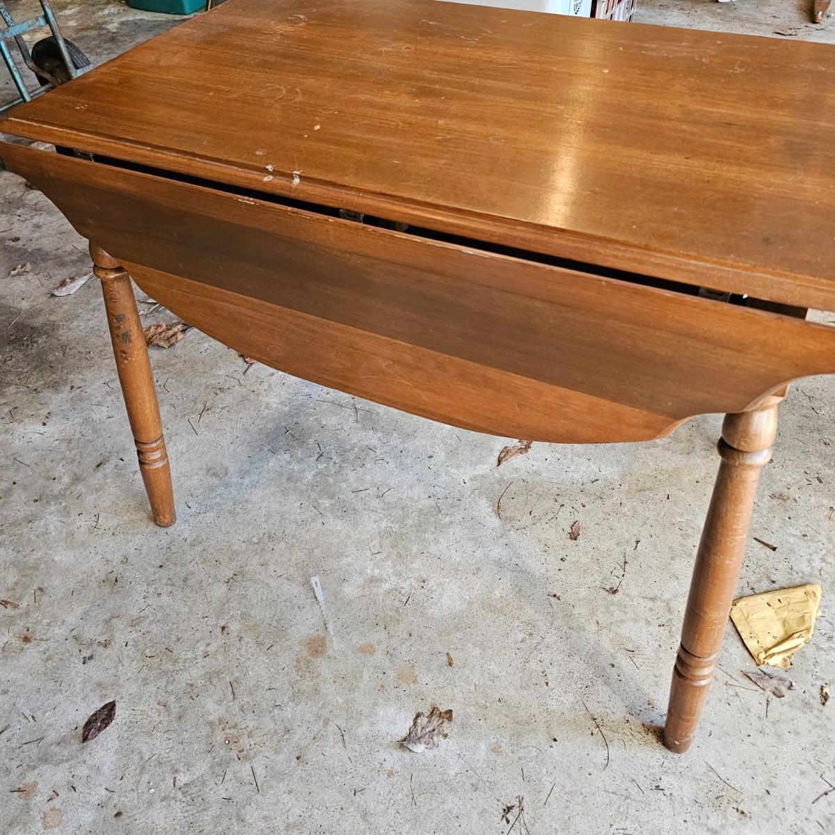 Smaller size drop leaf table with part turned legs, pull out stops to hold leaves when open. Table measures 21" x 35" x 29"H closed and 41" x 35" x 29" open. Some minor blemishes and nicks on top and sides. See photos for details. Local pickup only.