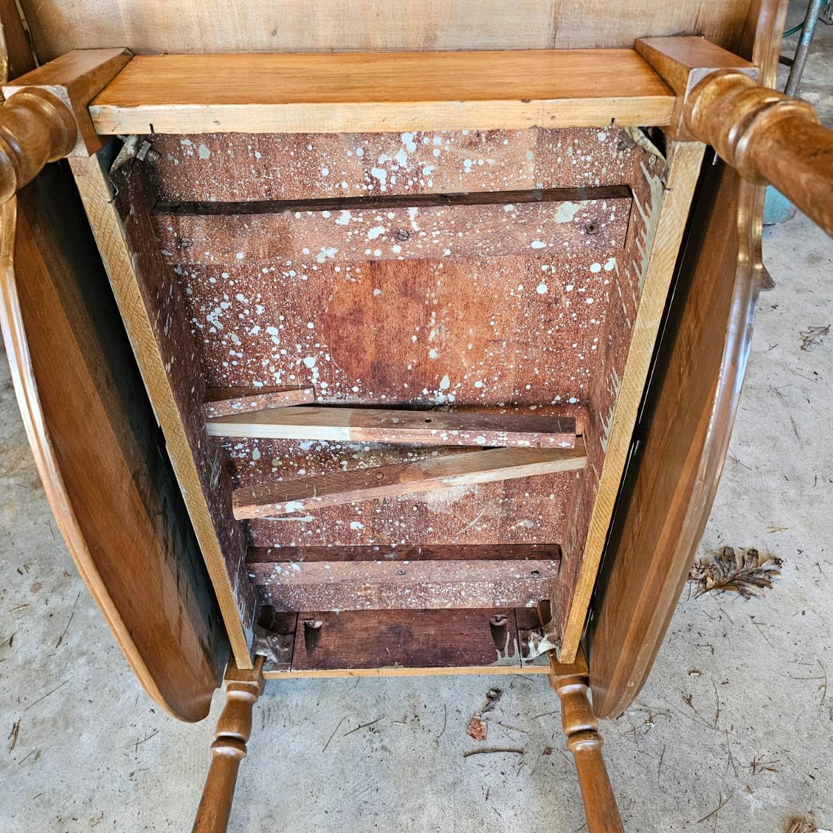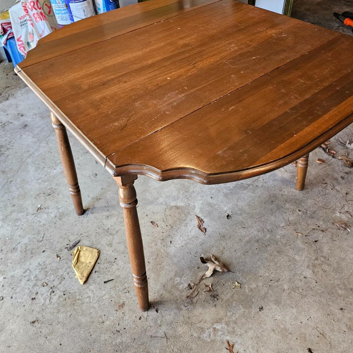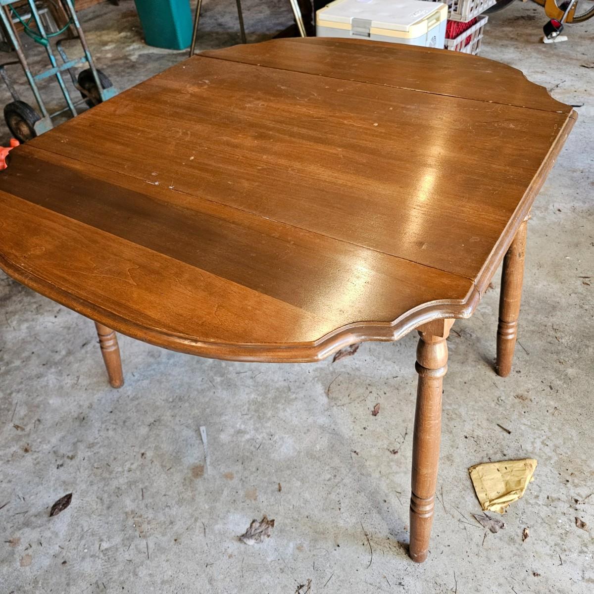 Smaller size drop leaf table with part turned legs, pull out stops to hold leaves when open. Table measures 21" x 35" x 29"H closed and 41" x 35" x 29" open. Some minor blemishes and nicks on top and sides. See photos for details. Local pickup only.