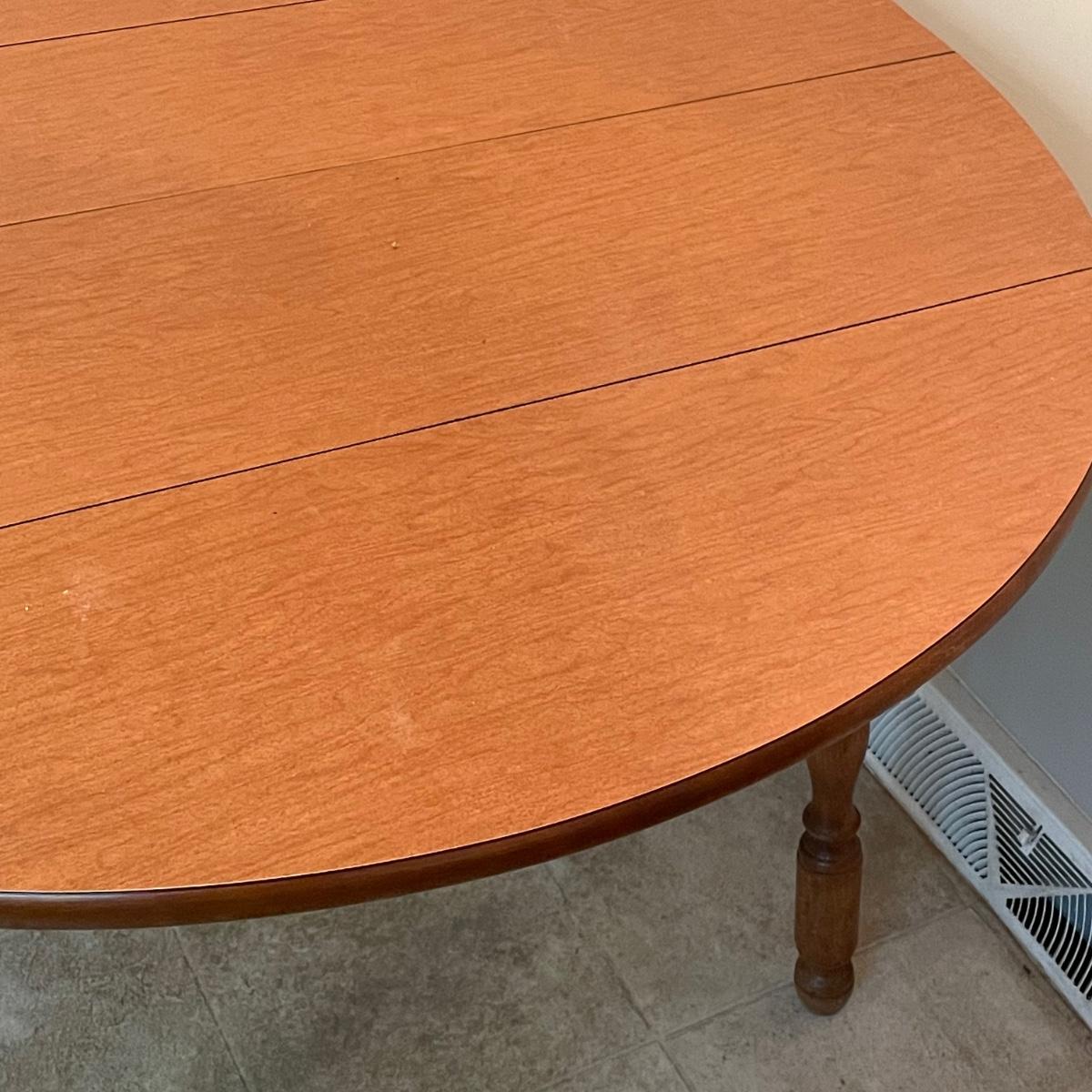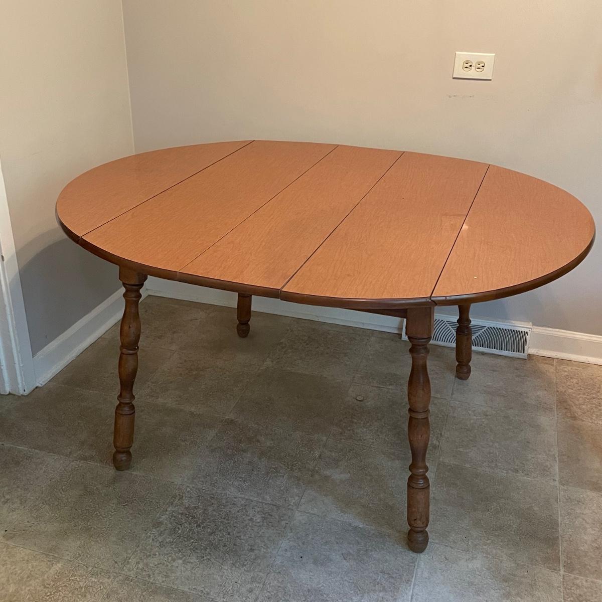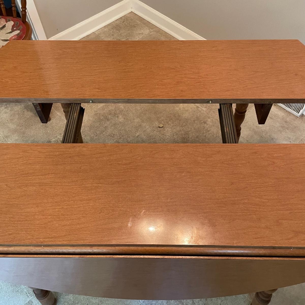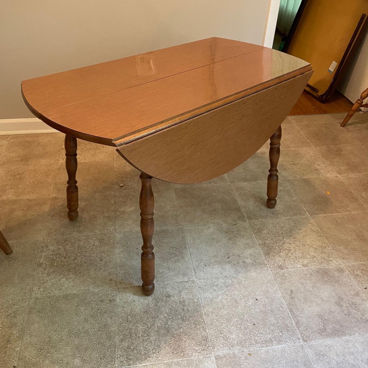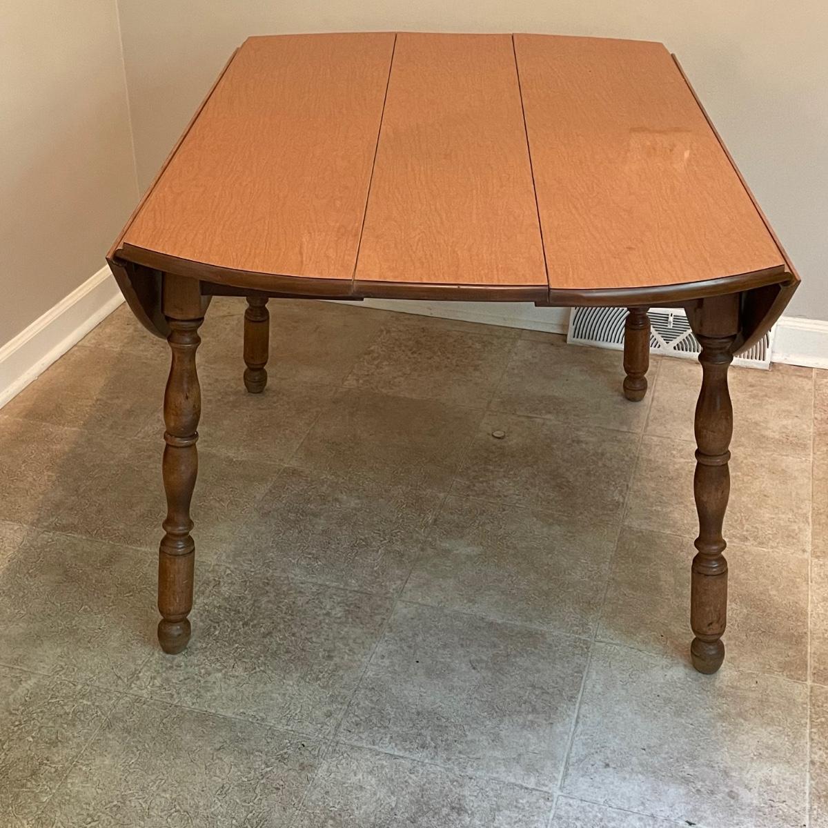 This vintage drop leaf table is solid wood with a laminate top. It's in good condition and folds up and down easily, 3 different size options as it has a leaf in addition to being a drop leaf. When down it has a slight misalignment that may or not be fixed from underneath.