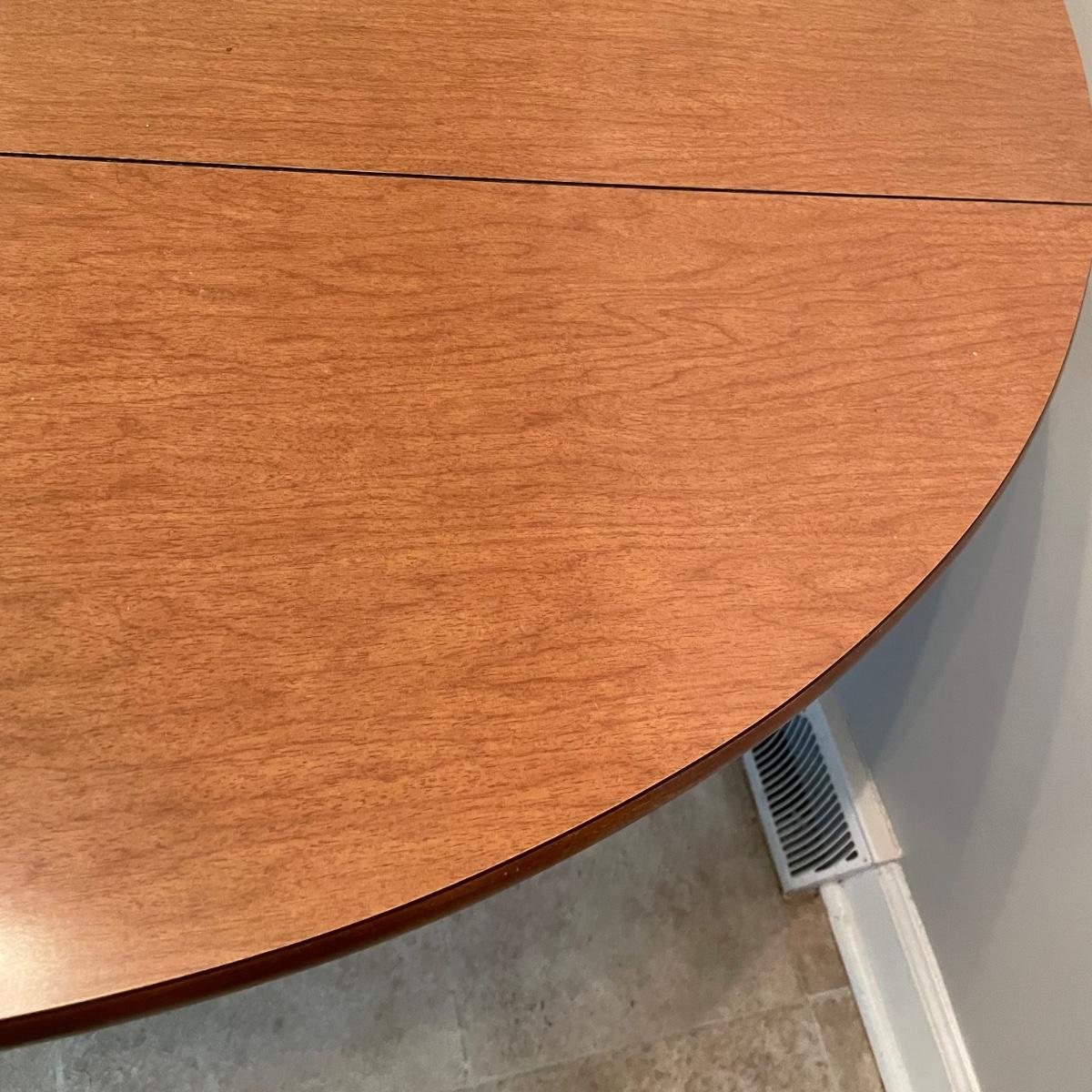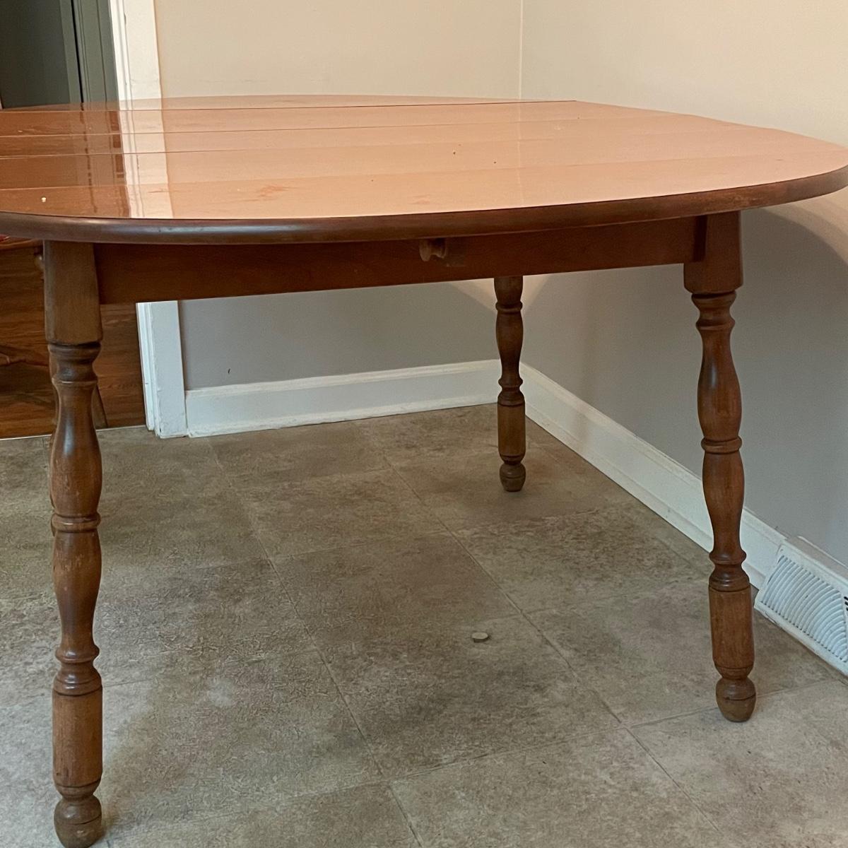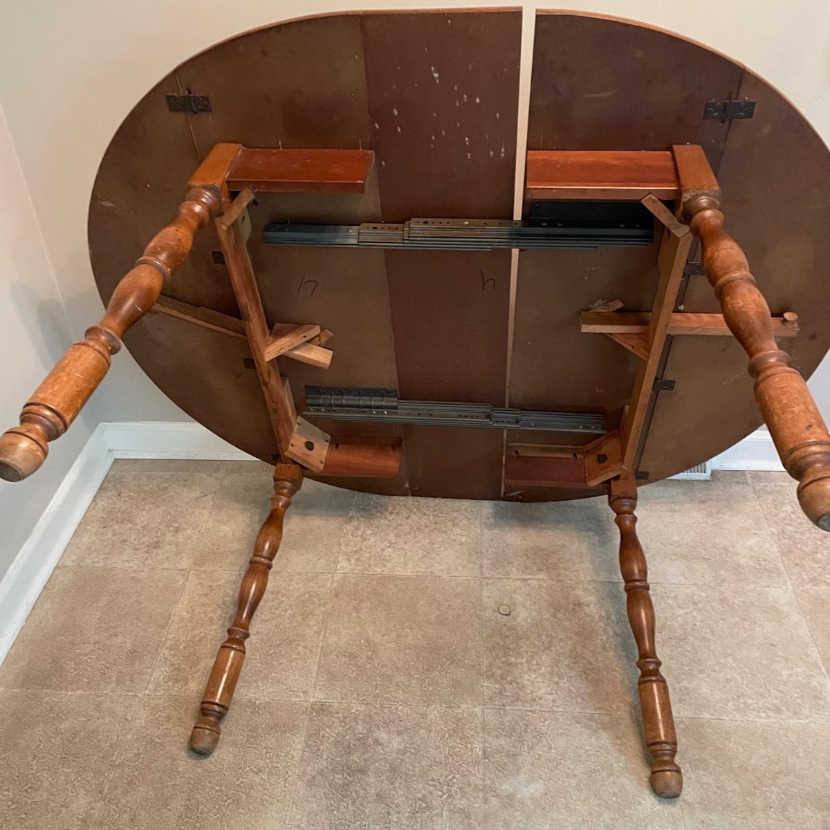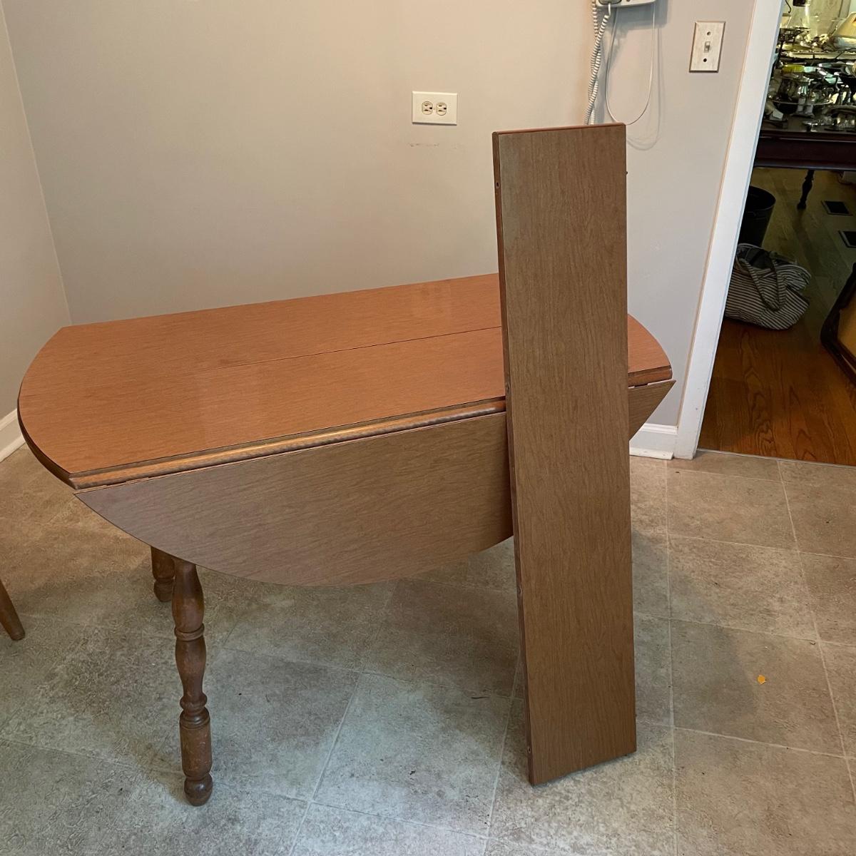 This vintage drop leaf table is solid wood with a laminate top. It's in good condition and folds up and down easily, 3 different size options as it has a leaf in addition to being a drop leaf. When down it has a slight misalignment that may or not be fixed from underneath.