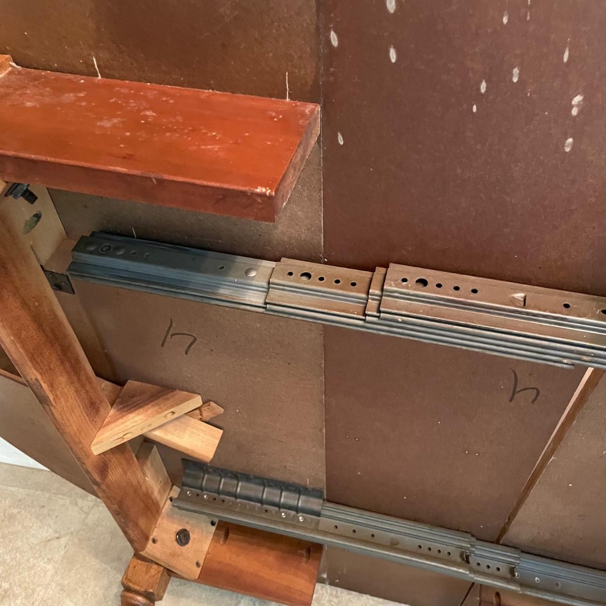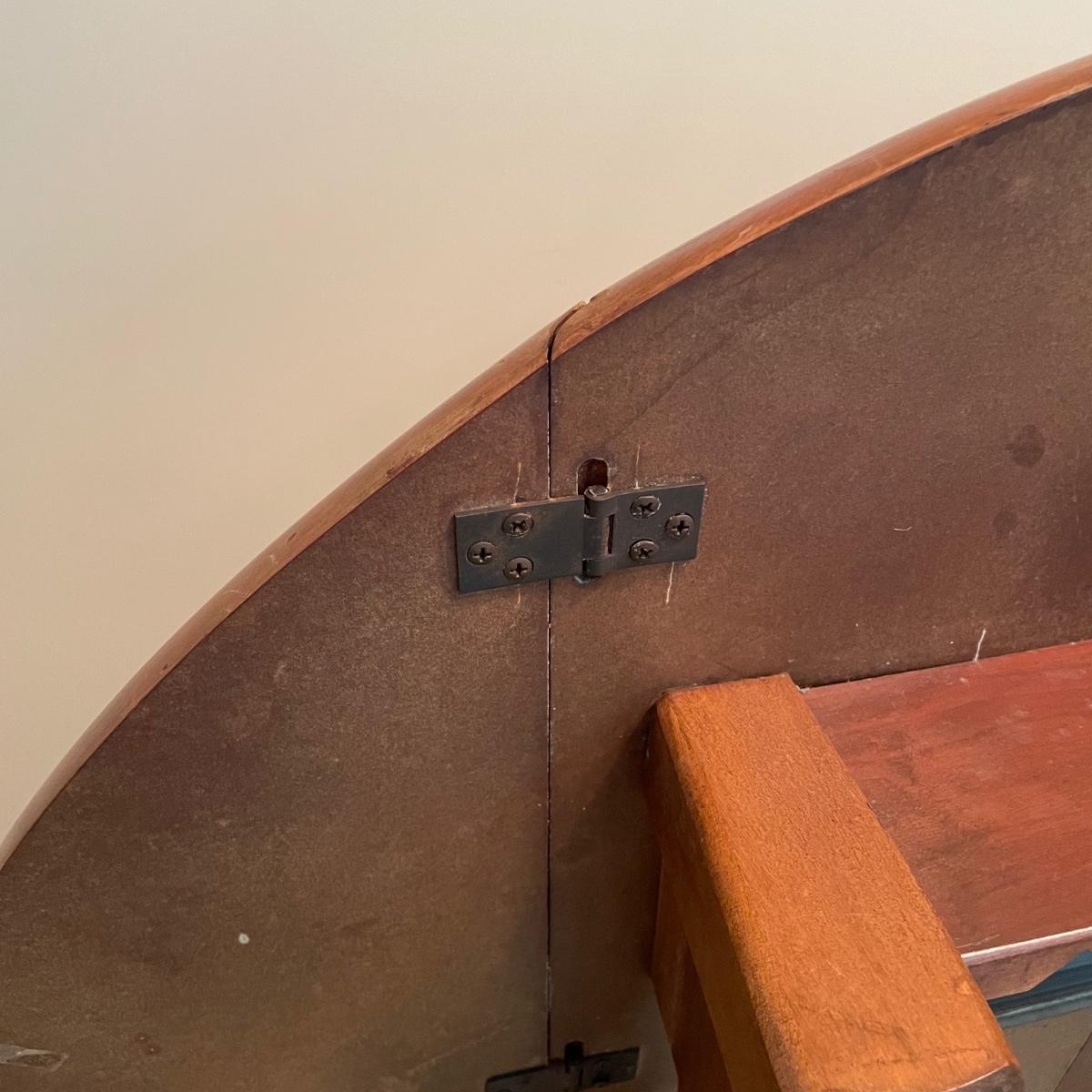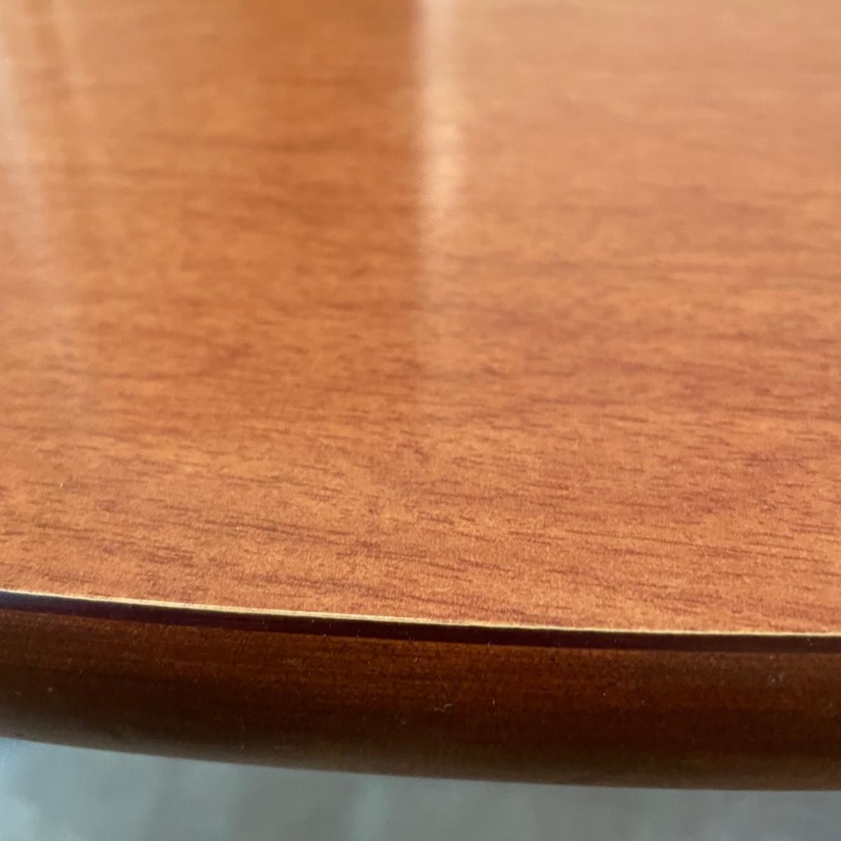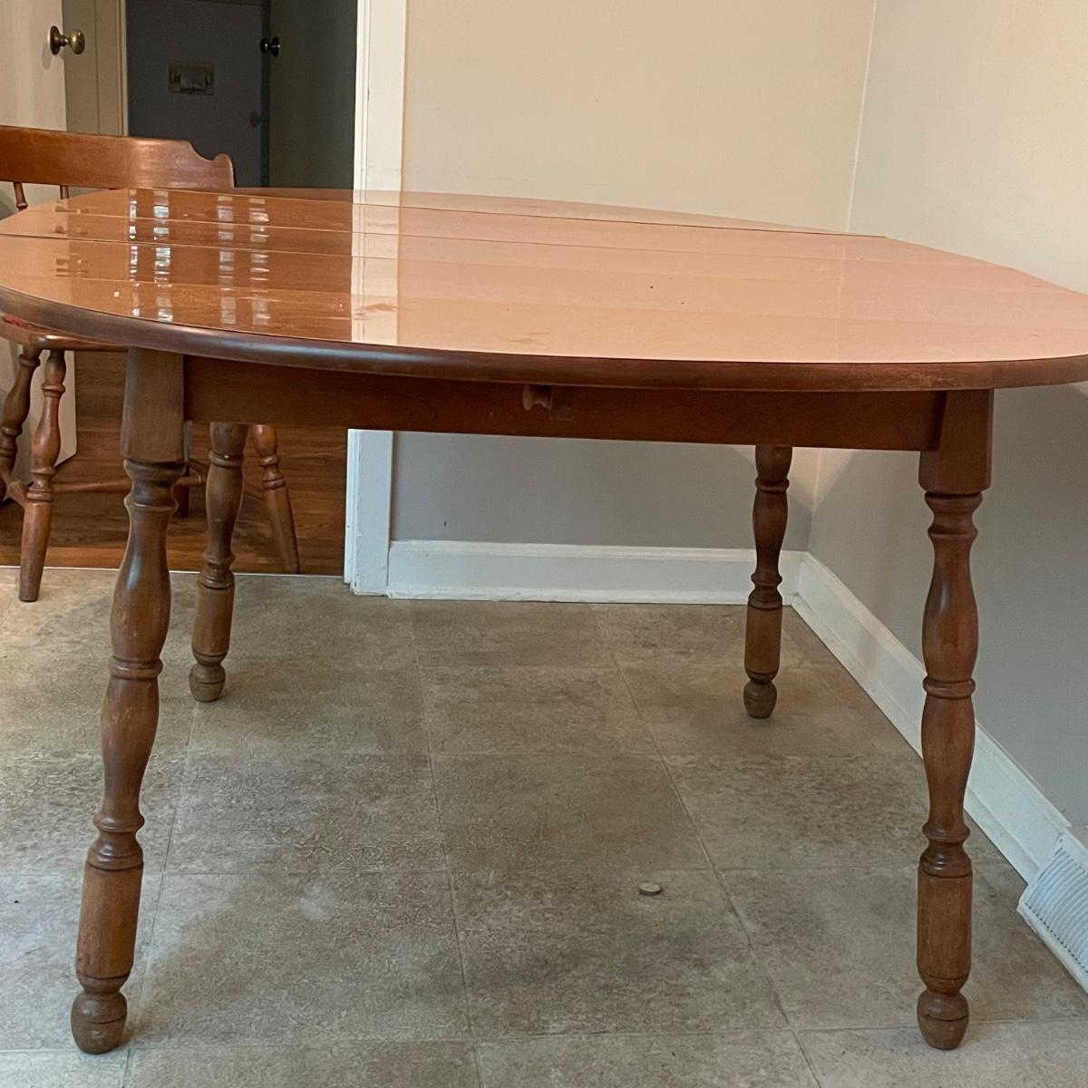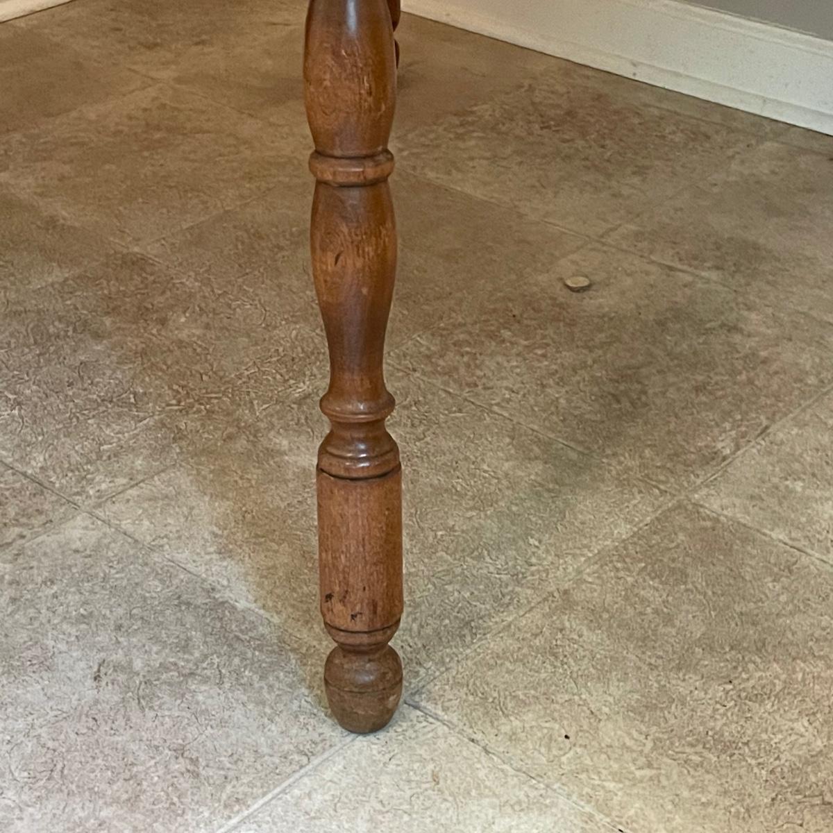 This vintage drop leaf table is solid wood with a laminate top. It's in good condition and folds up and down easily, 3 different size options as it has a leaf in addition to being a drop leaf. When down it has a slight misalignment that may or not be fixed from underneath.