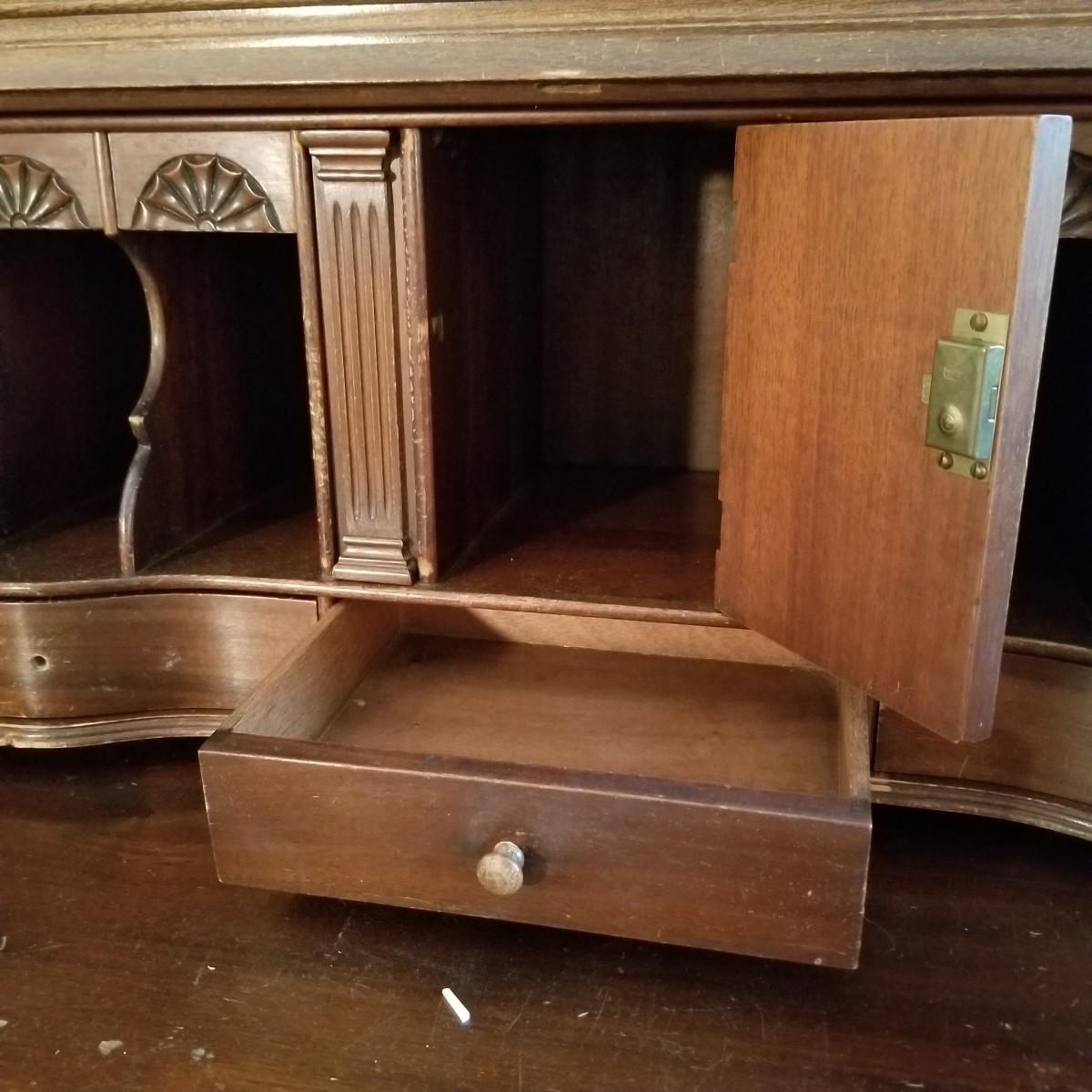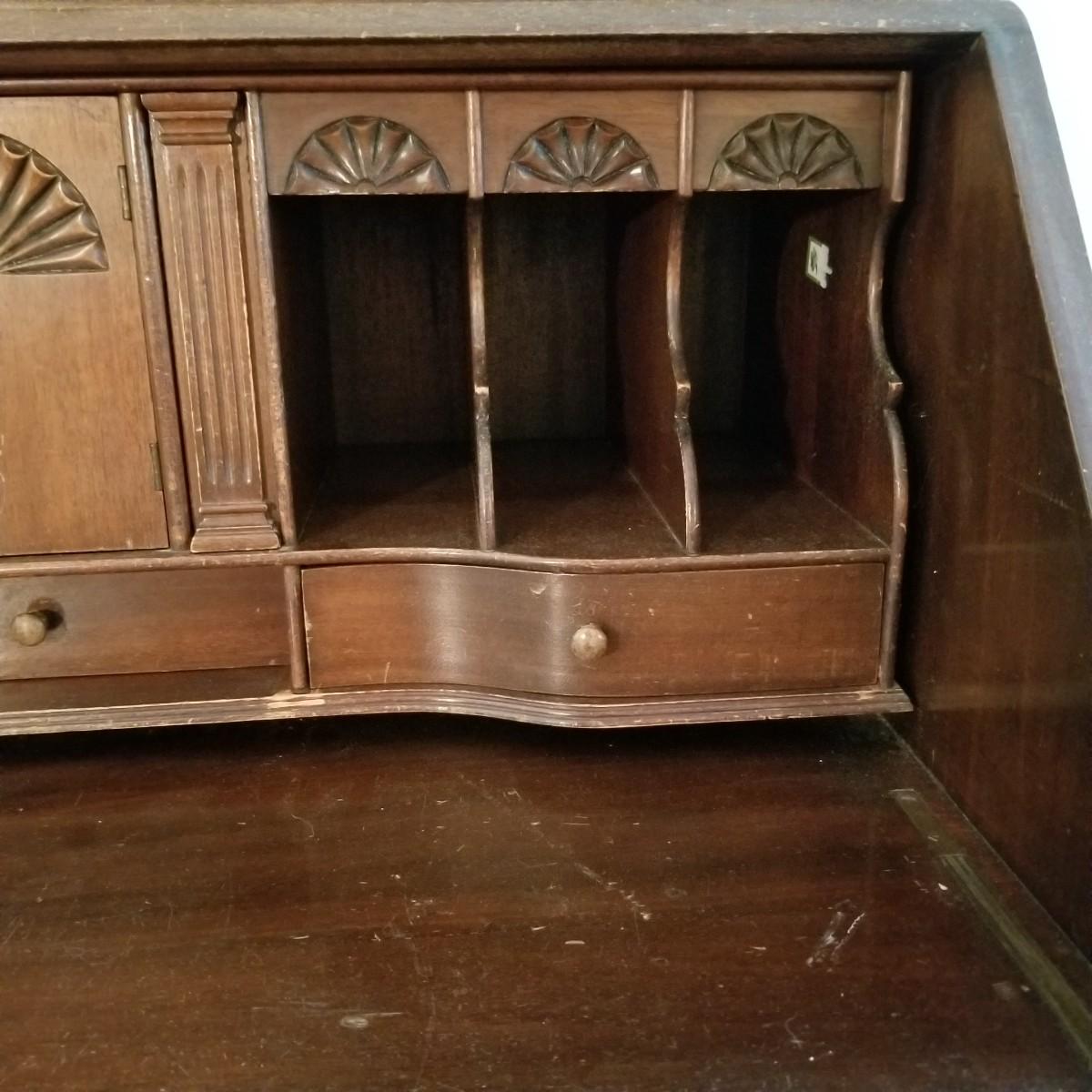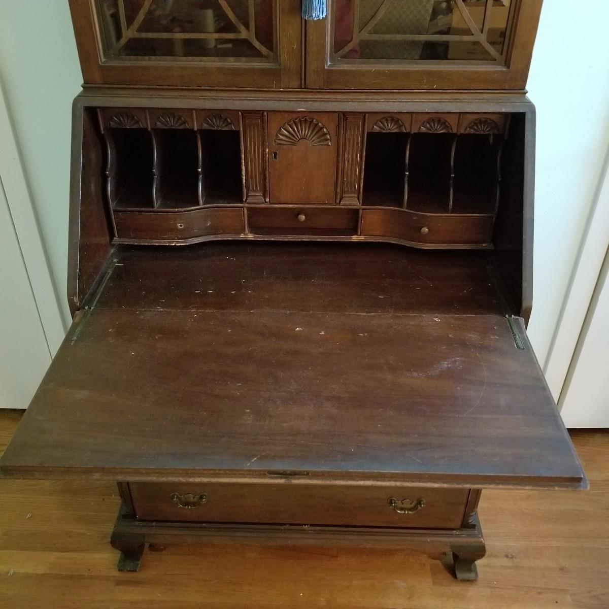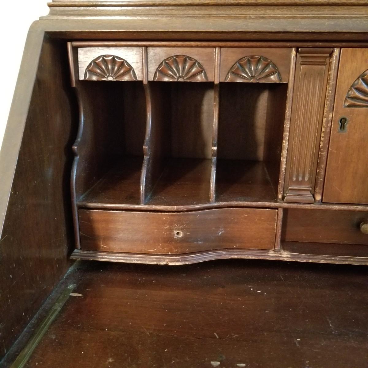 Beautiful wooden drop-front desk with glass door hutch top. Four drawers have dovetail construction,  desk has slide out supports. Multiple drawers and cubby holes inside including two 'hidden' compartments on either side of the center door. One drawer missing pull, otherwise piece mostly in good condition. Key in door is included but does not fit any of the locks.See photos for detail. 80" x 32" x 19". All one piece, winning bidder will need to bring help to load. Item is located on the second floor of the house and will need to be moved down one flight of stairs. Local pickup only.