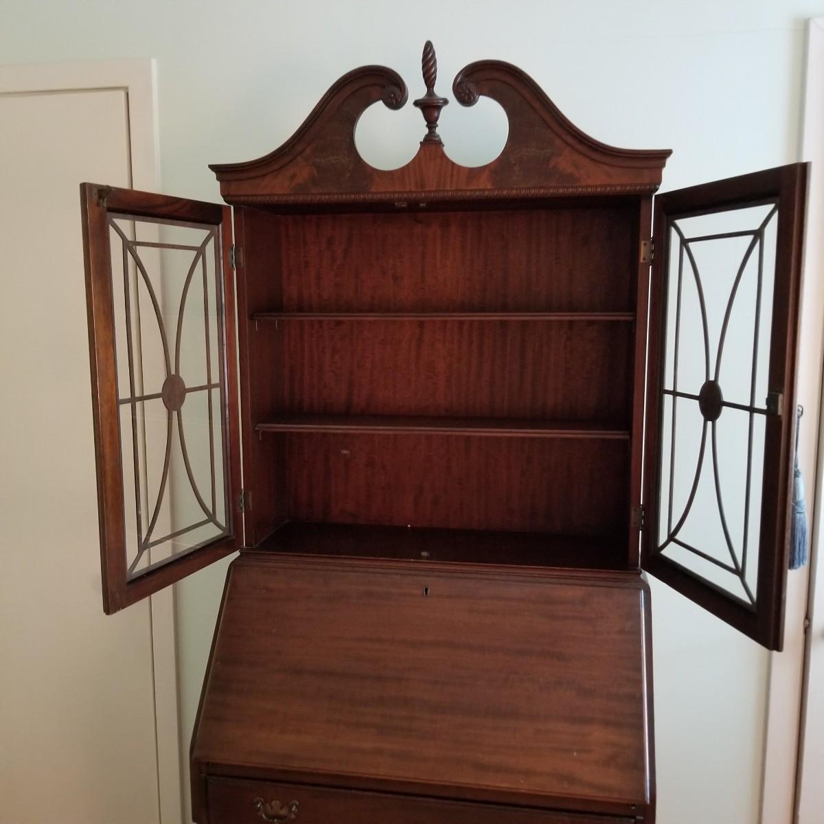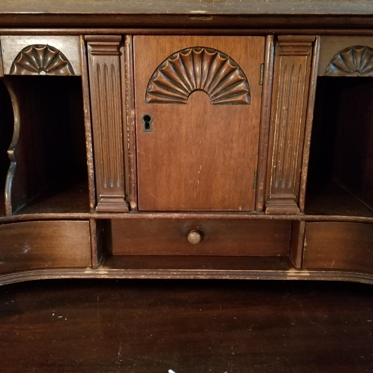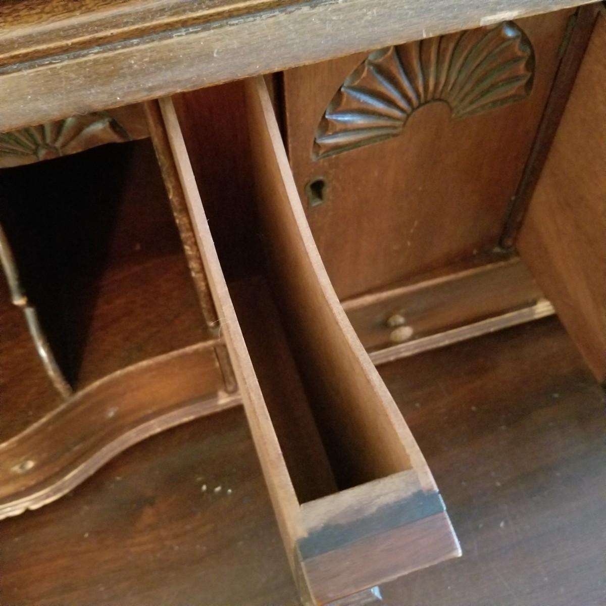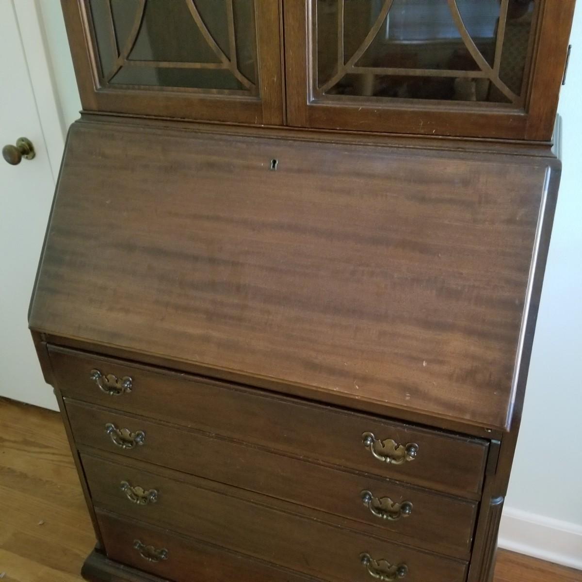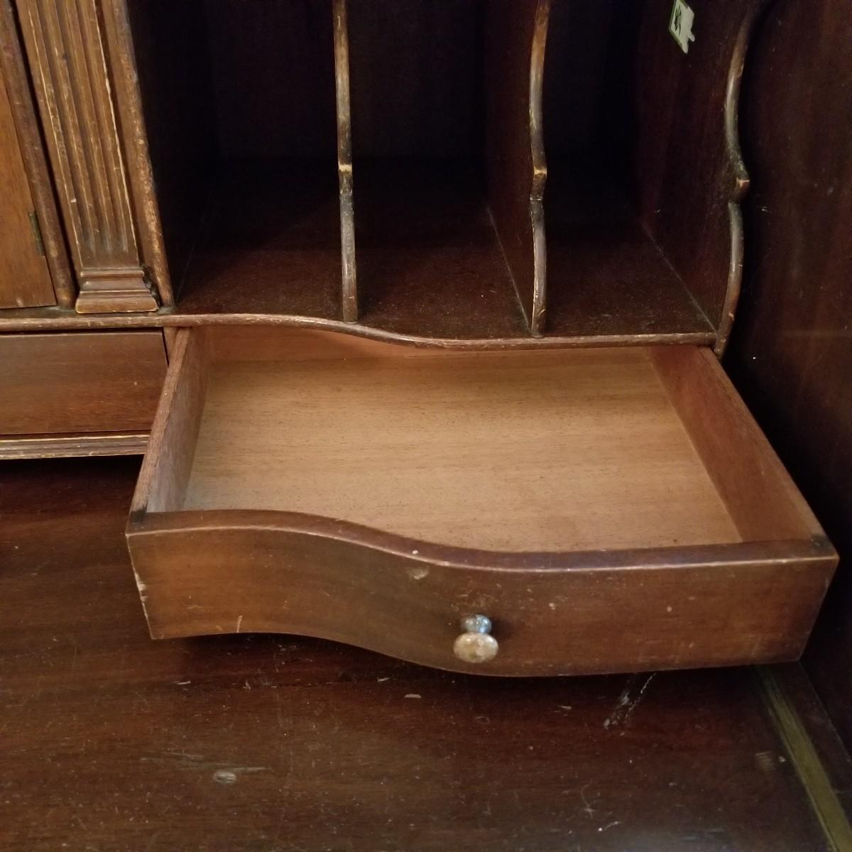 Beautiful wooden drop-front desk with glass door hutch top. Four drawers have dovetail construction,  desk has slide out supports. Multiple drawers and cubby holes inside including two 'hidden' compartments on either side of the center door. One drawer missing pull, otherwise piece mostly in good condition. Key in door is included but does not fit any of the locks.See photos for detail. 80" x 32" x 19". All one piece, winning bidder will need to bring help to load. Item is located on the second floor of the house and will need to be moved down one flight of stairs. Local pickup only.