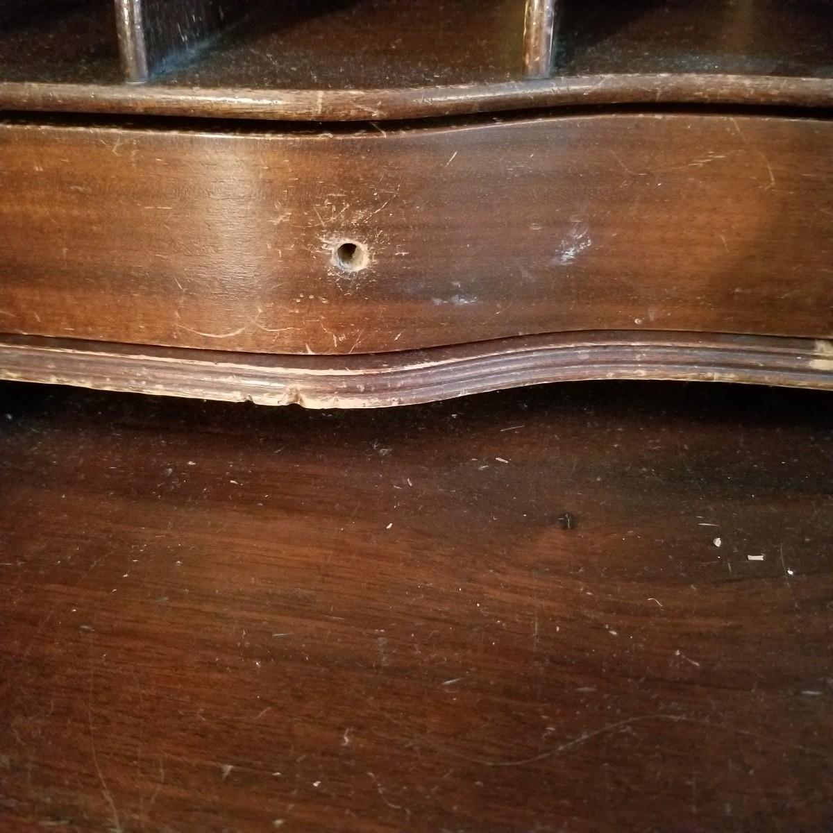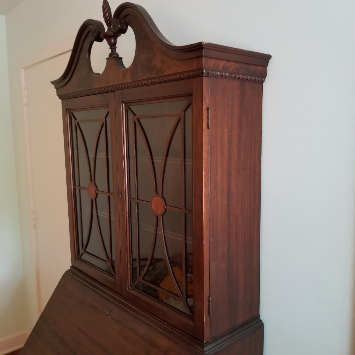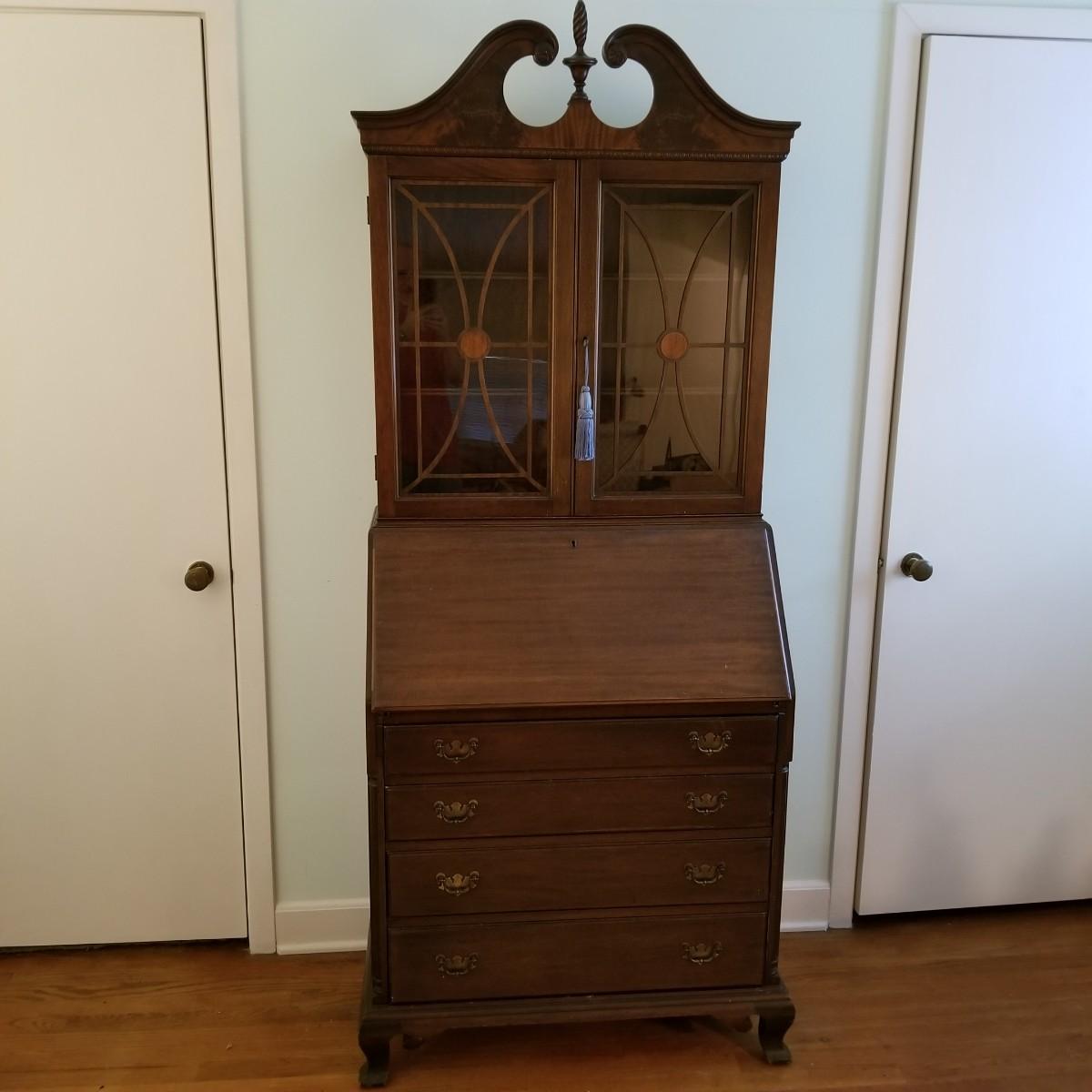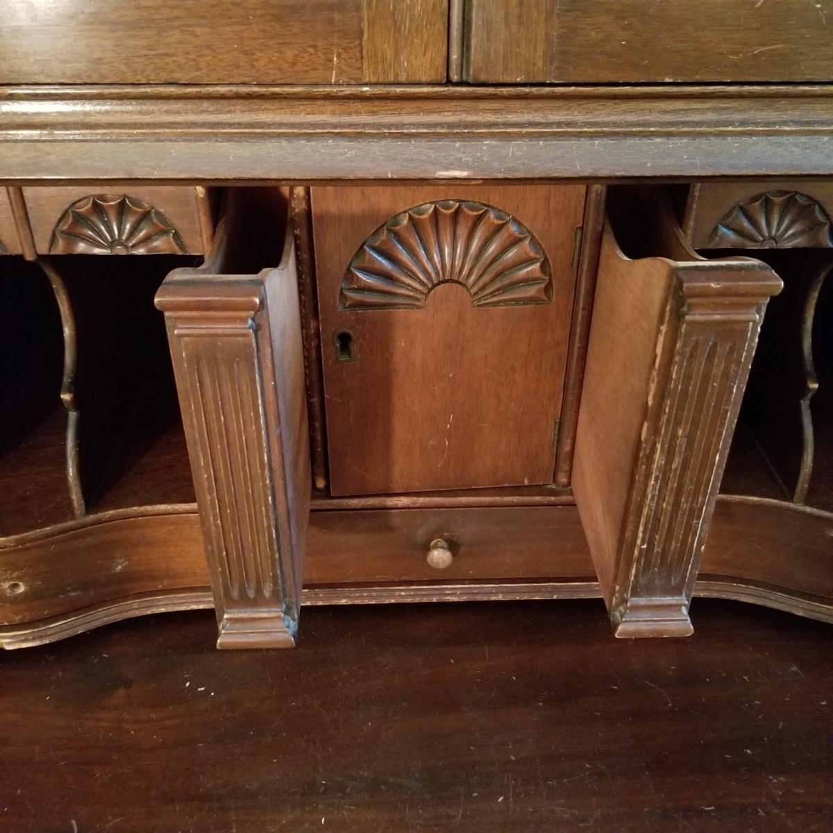 Beautiful wooden drop-front desk with glass door hutch top. Four drawers have dovetail construction,  desk has slide out supports. Multiple drawers and cubby holes inside including two 'hidden' compartments on either side of the center door. One drawer missing pull, otherwise piece mostly in good condition. Key in door is included but does not fit any of the locks.See photos for detail. 80" x 32" x 19". All one piece, winning bidder will need to bring help to load. Item is located on the second floor of the house and will need to be moved down one flight of stairs. Local pickup only.