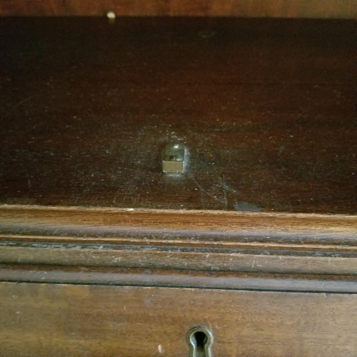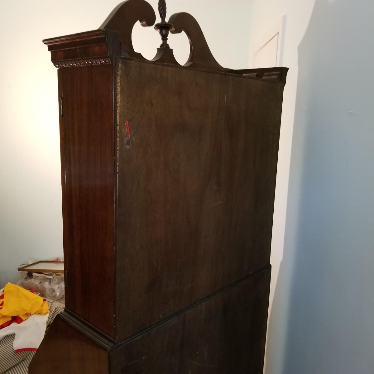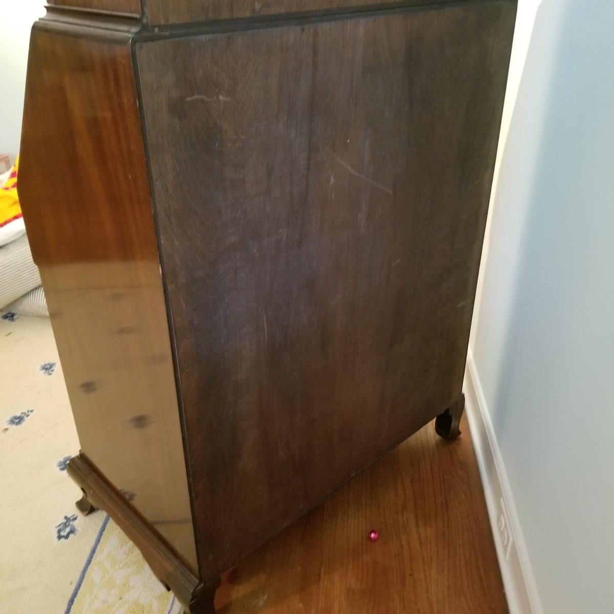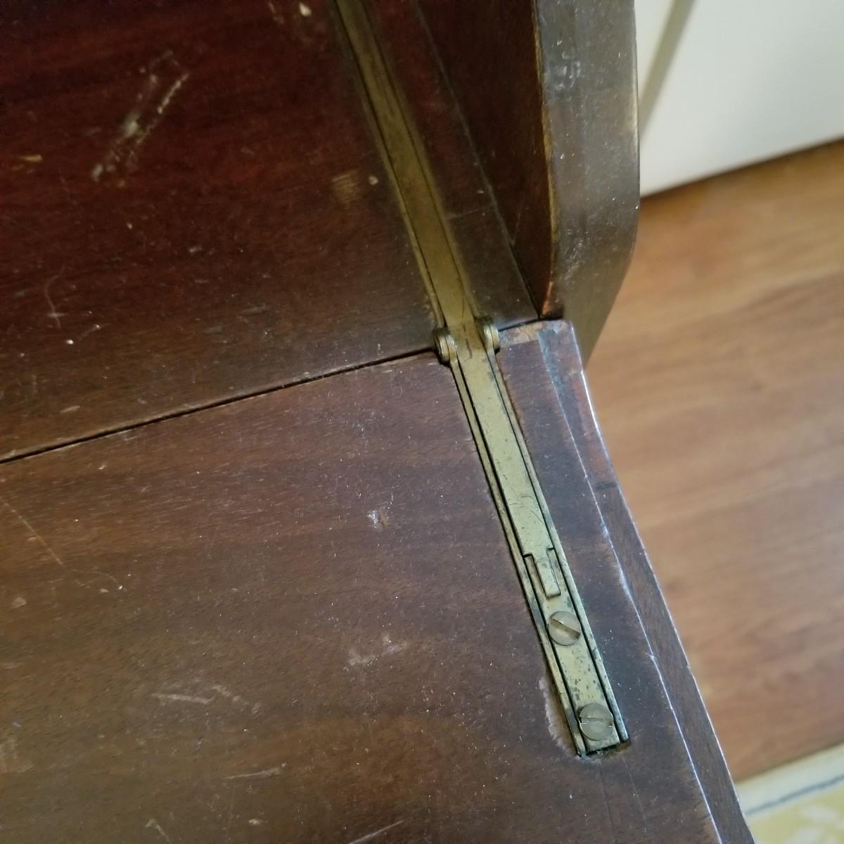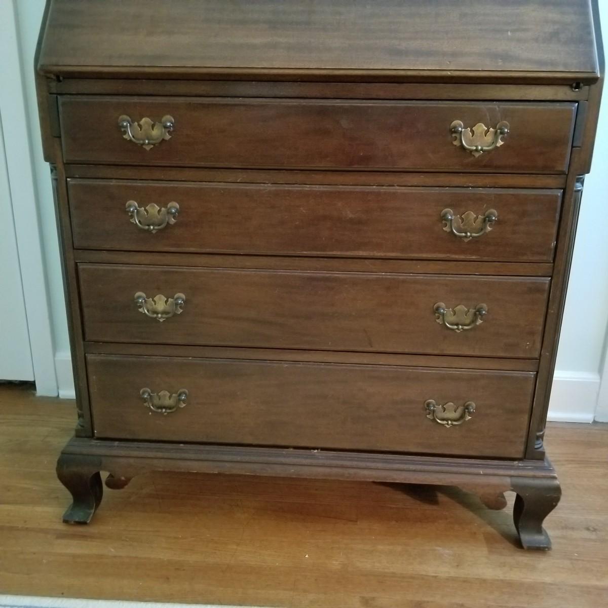 Beautiful wooden drop-front desk with glass door hutch top. Four drawers have dovetail construction,  desk has slide out supports. Multiple drawers and cubby holes inside including two 'hidden' compartments on either side of the center door. One drawer missing pull, otherwise piece mostly in good condition. Key in door is included but does not fit any of the locks.See photos for detail. 80" x 32" x 19". All one piece, winning bidder will need to bring help to load. Item is located on the second floor of the house and will need to be moved down one flight of stairs. Local pickup only.