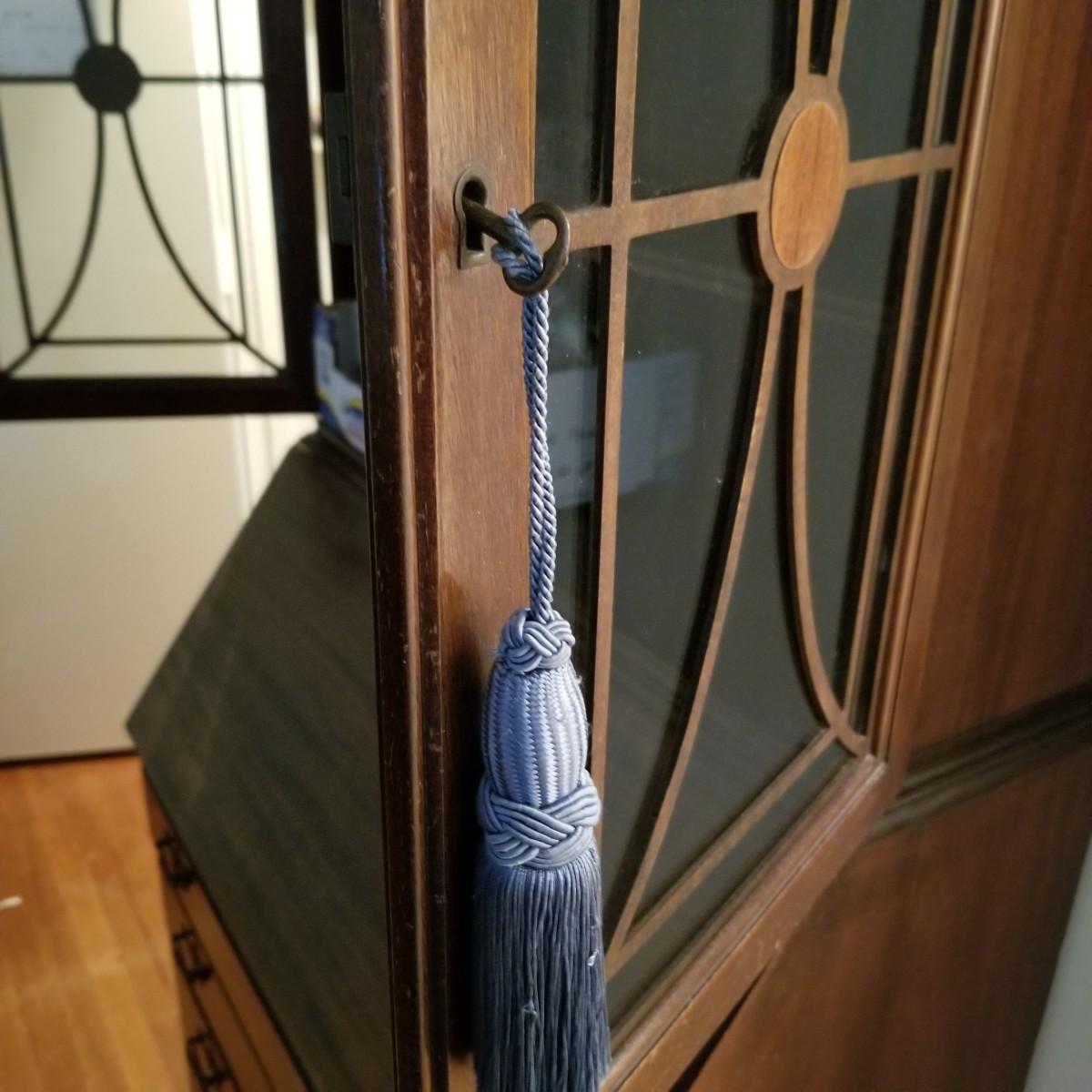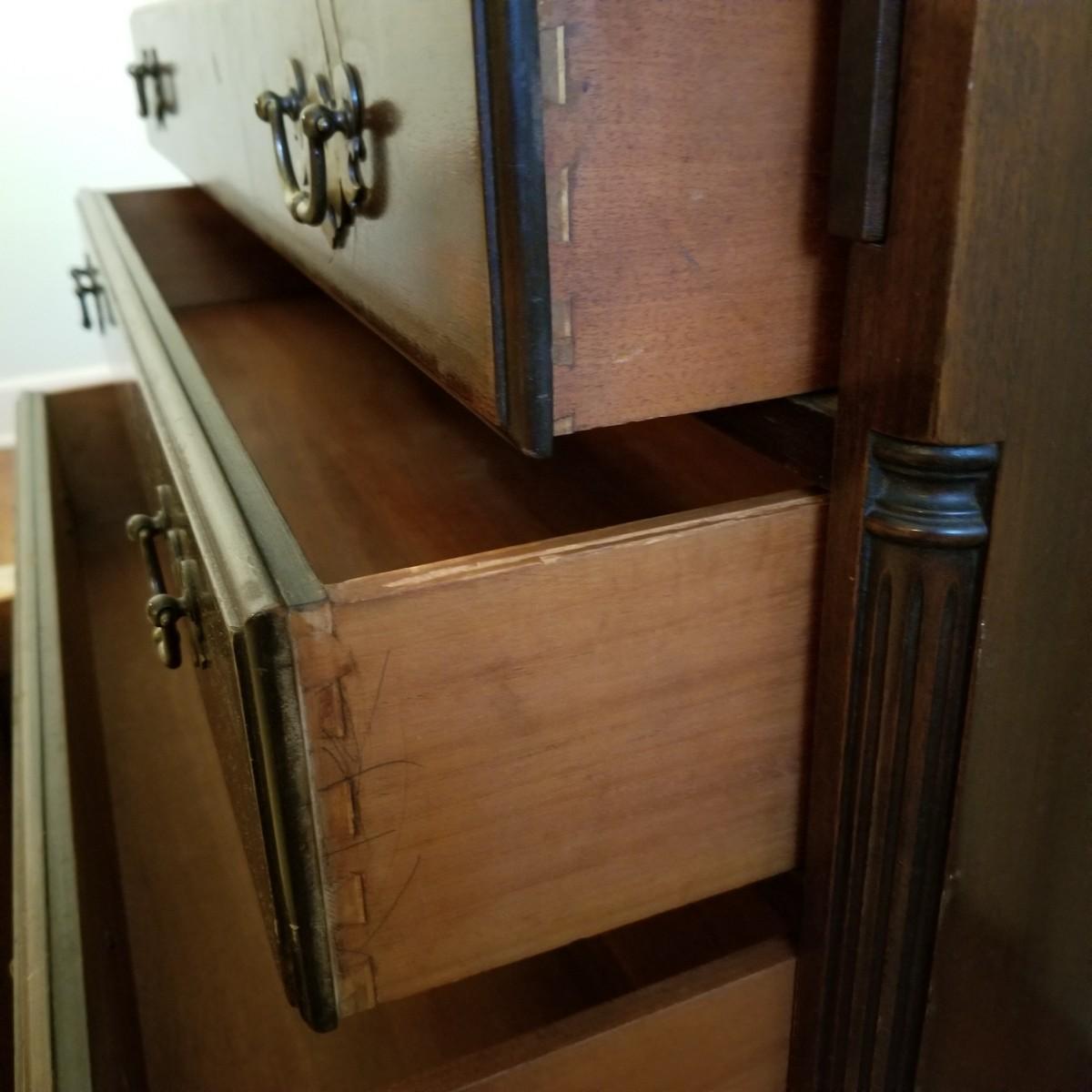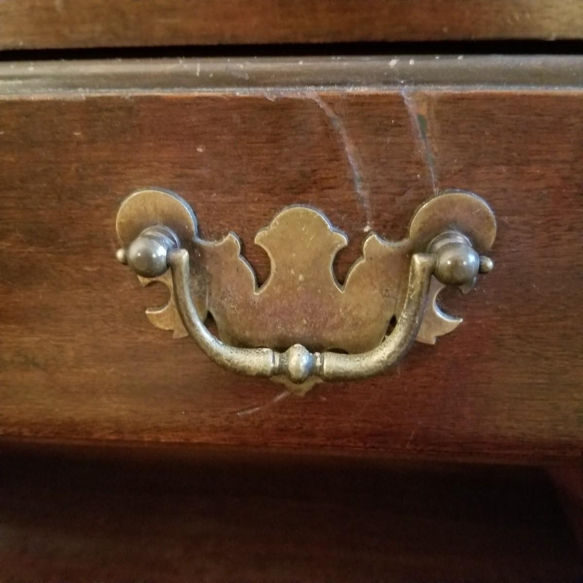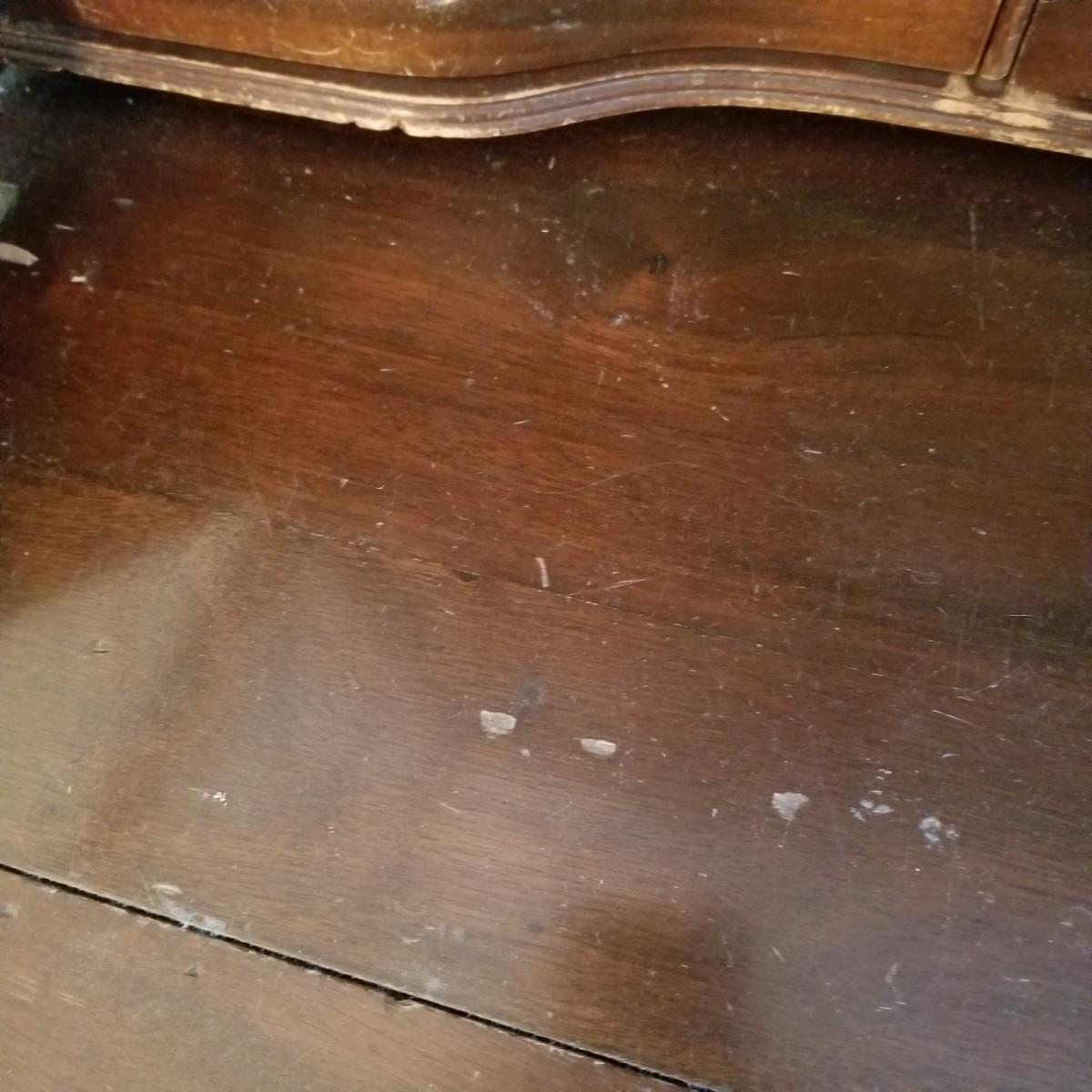 Beautiful wooden drop-front desk with glass door hutch top. Four drawers have dovetail construction,  desk has slide out supports. Multiple drawers and cubby holes inside including two 'hidden' compartments on either side of the center door. One drawer missing pull, otherwise piece mostly in good condition. Key in door is included but does not fit any of the locks.See photos for detail. 80" x 32" x 19". All one piece, winning bidder will need to bring help to load. Item is located on the second floor of the house and will need to be moved down one flight of stairs. Local pickup only.